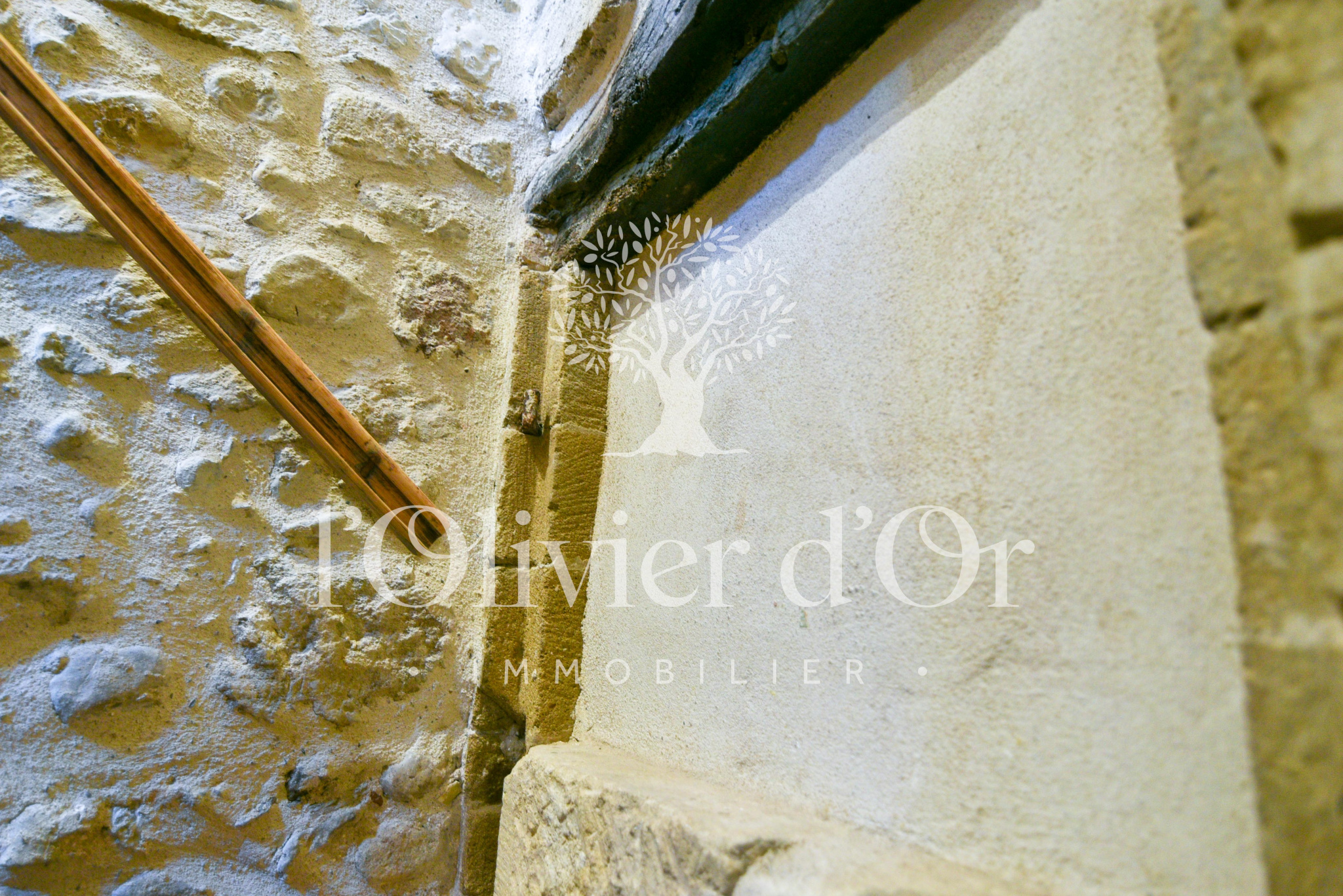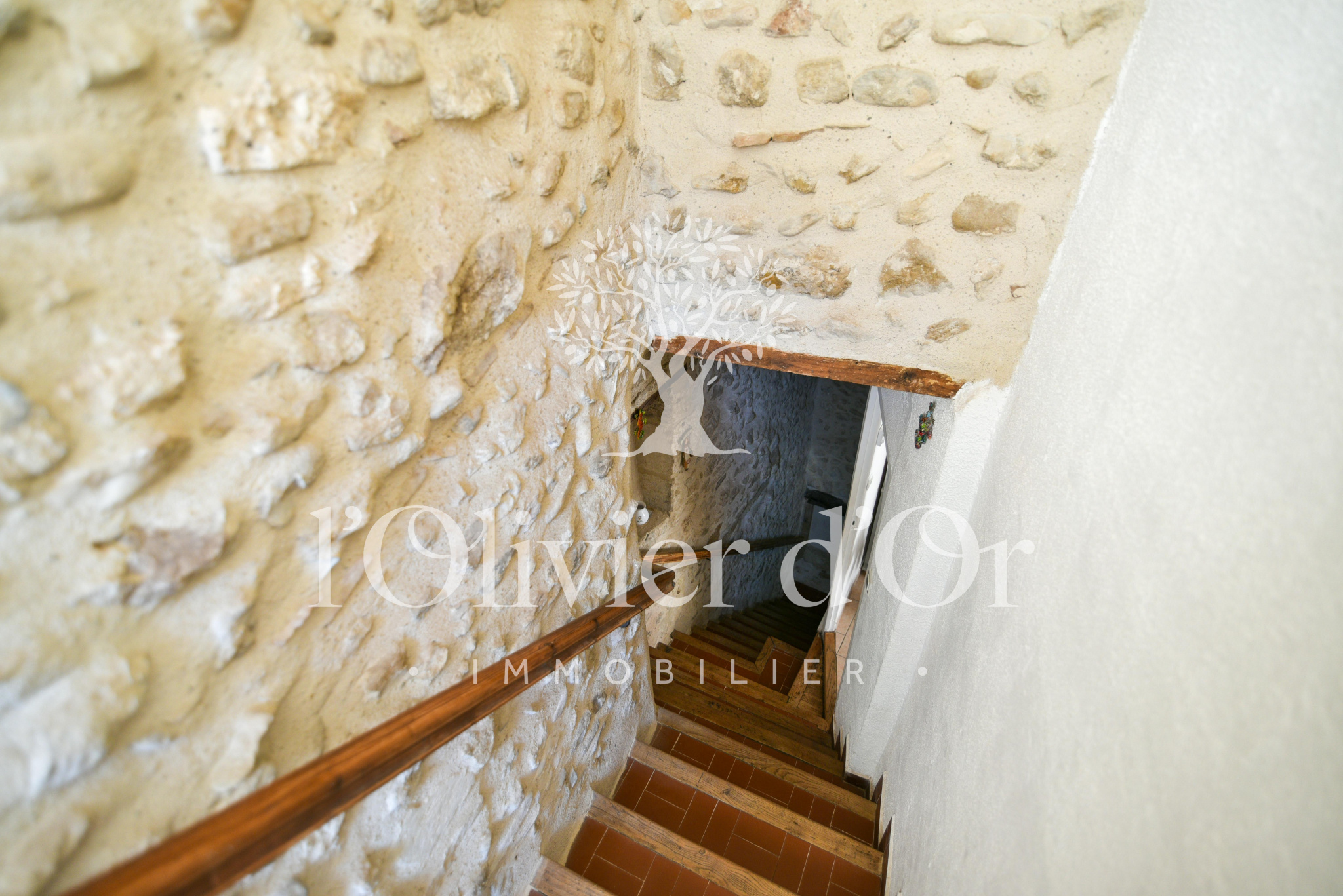 Au rez-de-chaussée, une chambre d’appoint et un débarras complètent l’ensemble. L’escalier, bordé d’un mur en pierres apparentes, apporte un véritable cachet à la maison et témoigne de son histoire.