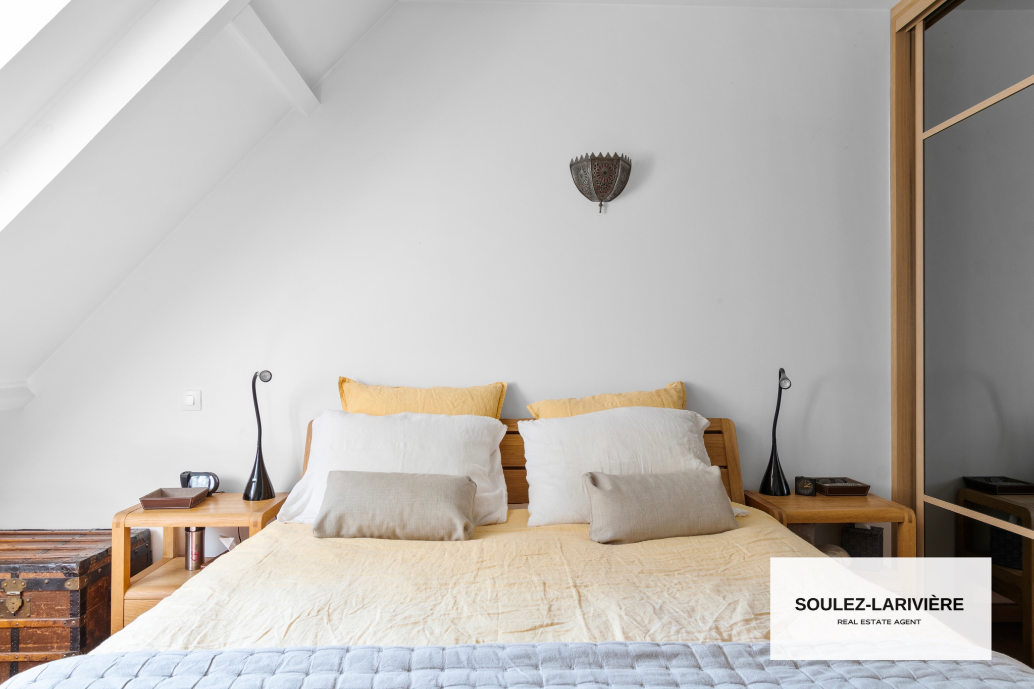 Par la buanderie, vous trouverez une deuxième grande suite de 27m2 située au dessus des deux garages. Cette suite se compose d'une salle d'eau avec douche et vasque, d'un espace bureau, dressing et grand coin nuit.