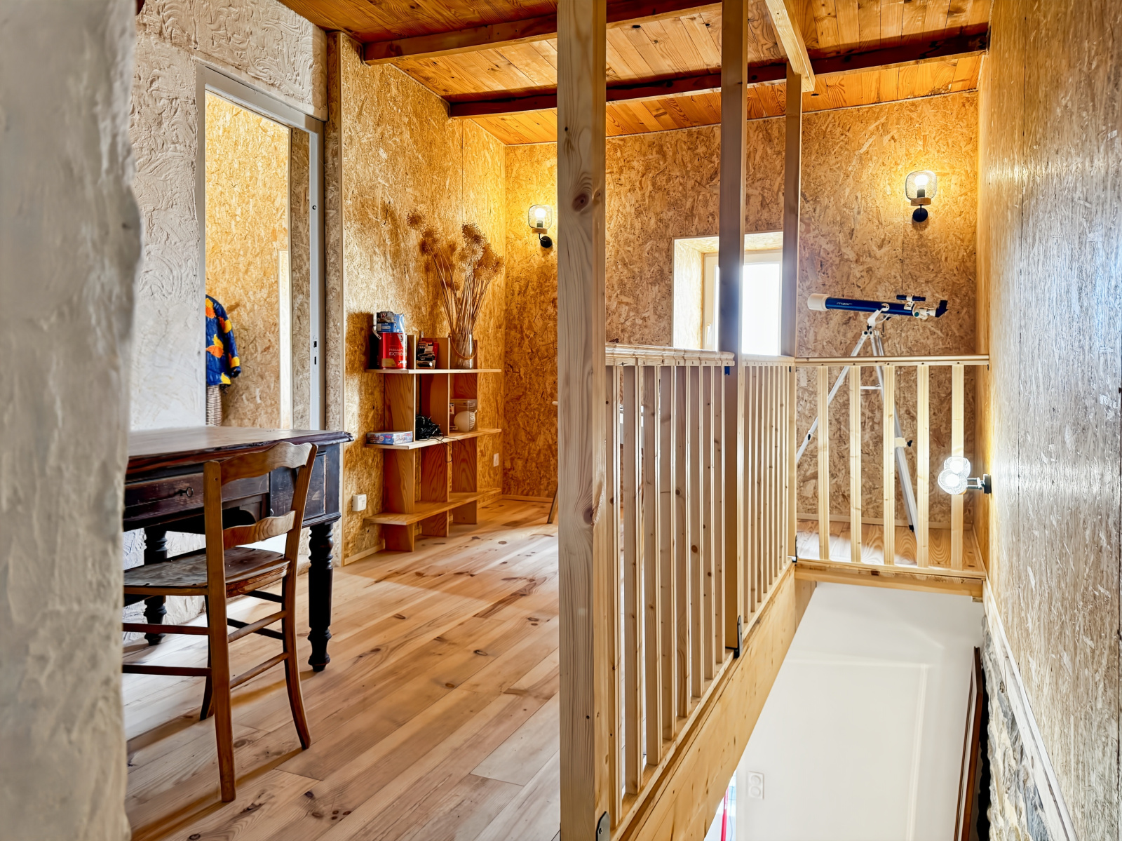 Au niveau supérieur on trouve un espace Bureau, 2 Belles Chambres dont une avec SDE, WC et Terrasse privative et l’autre avec Mezzanine et accès à une 3ème Terrasse sur le Toit offrant une Vue à tomber par terre sur la Vallée…
