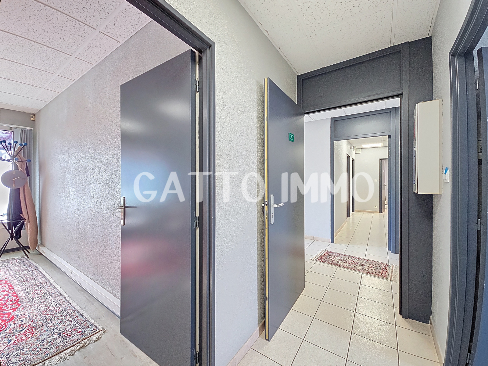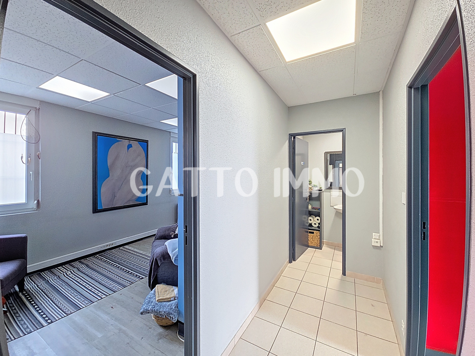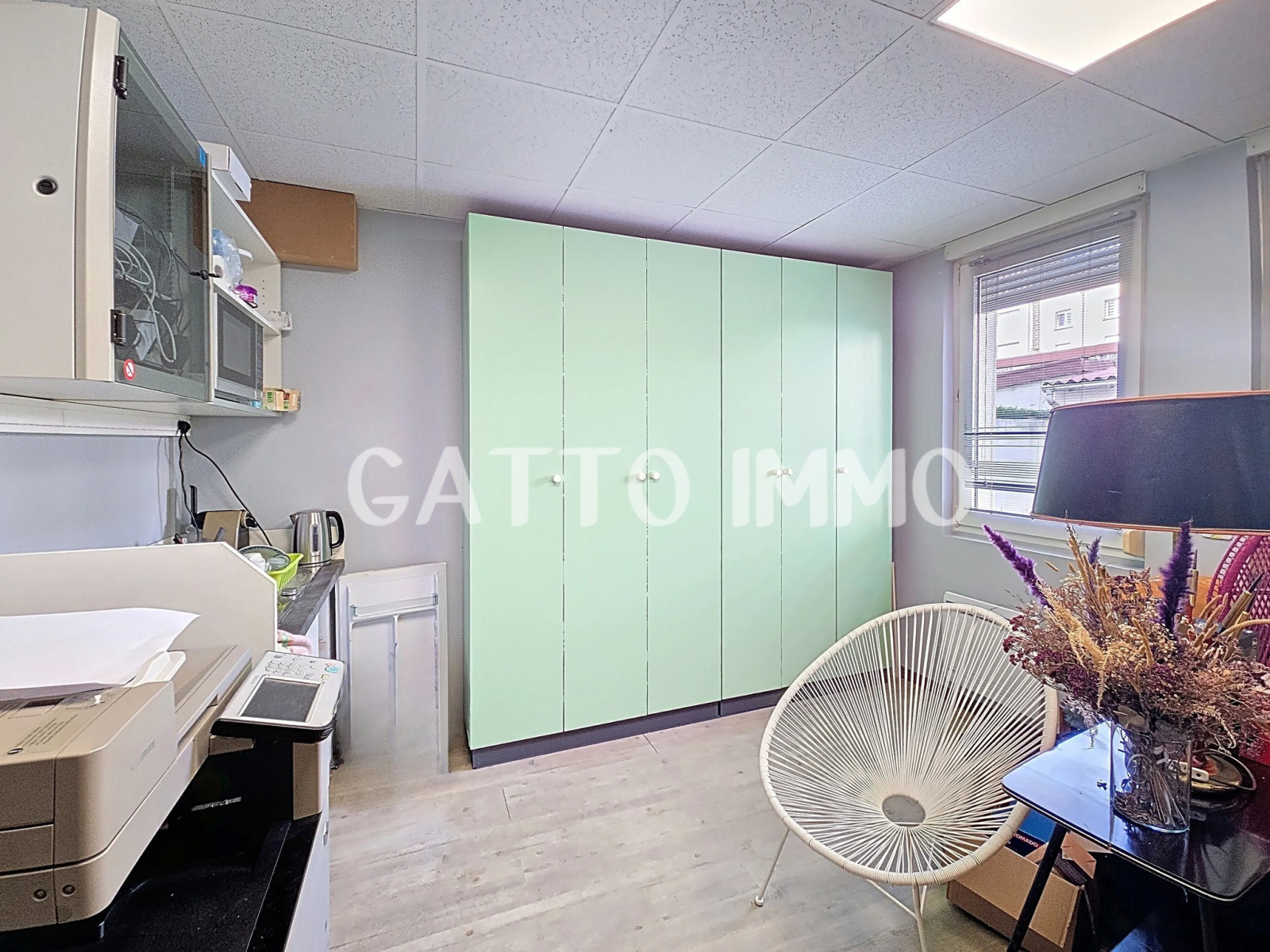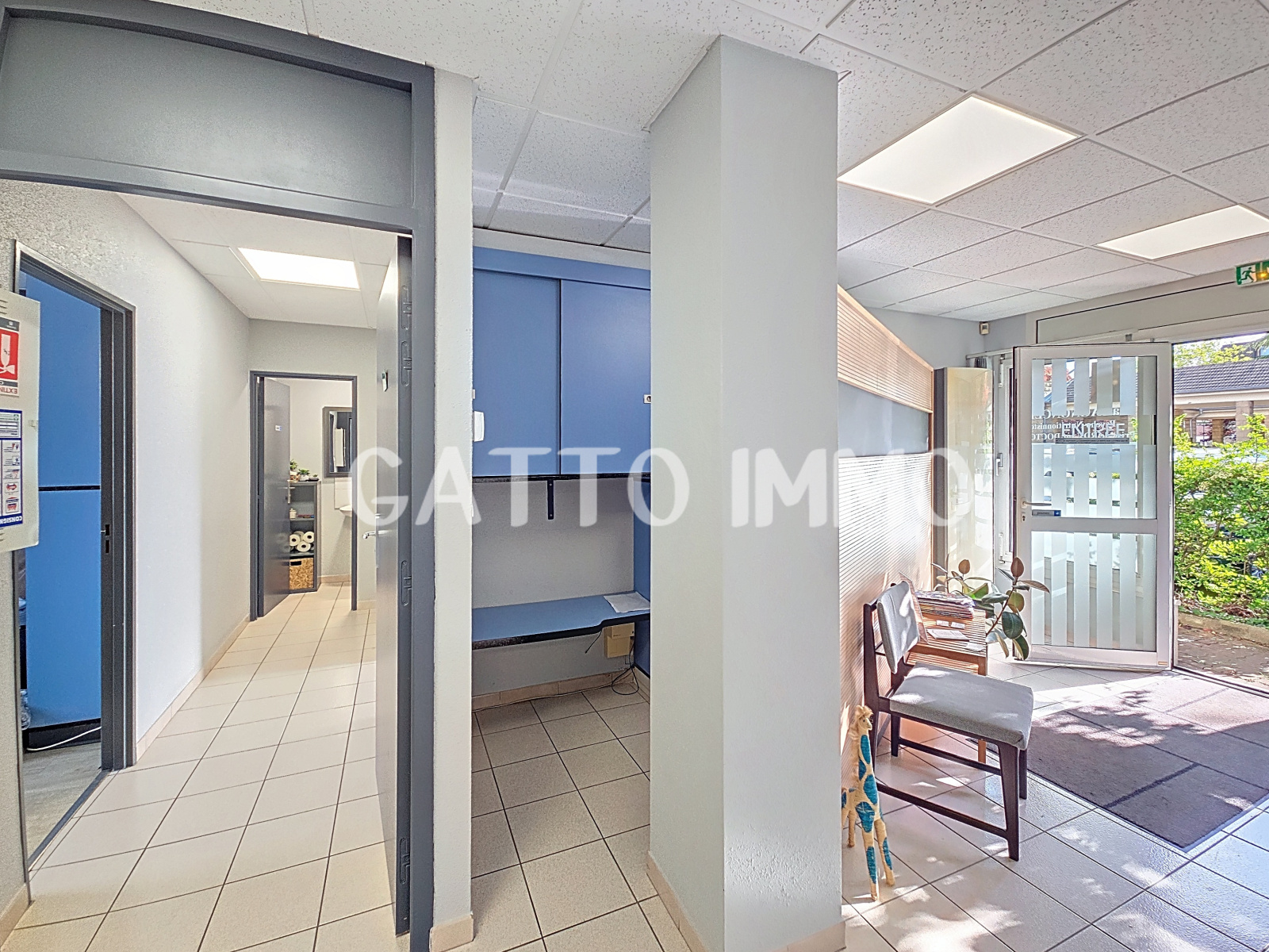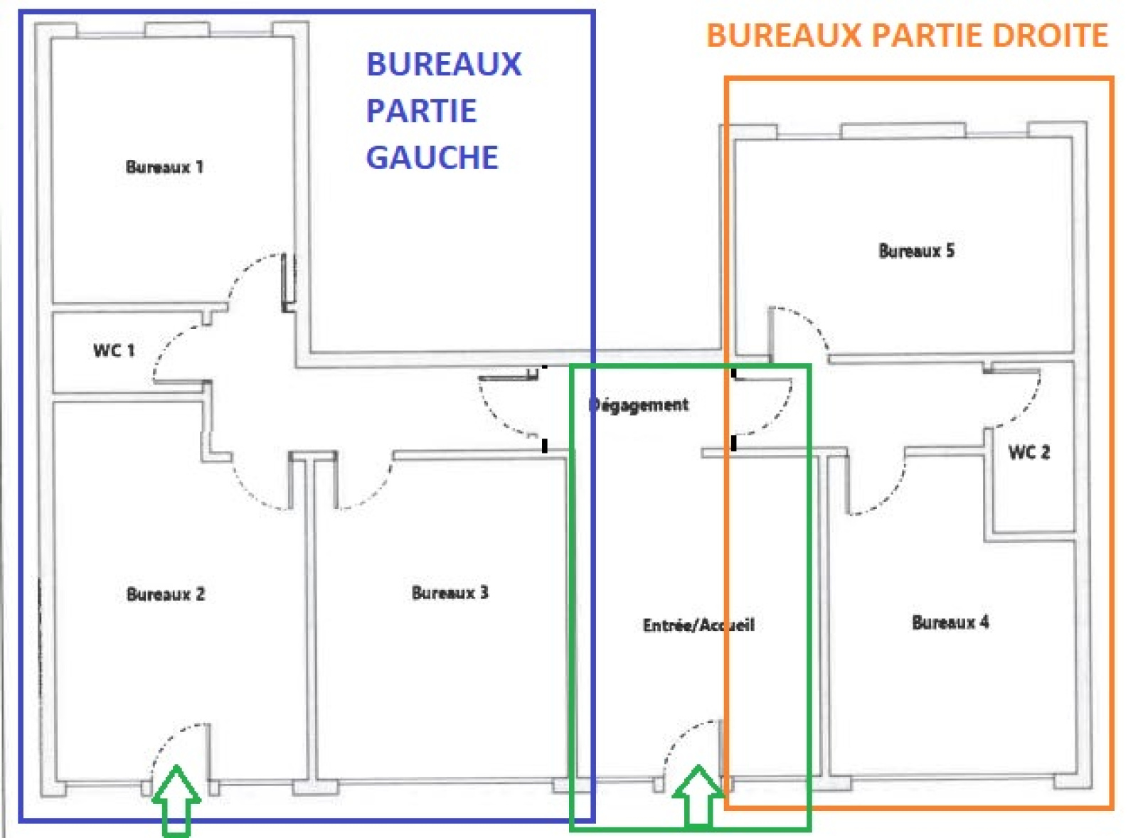 - A gauche : un hall donne accès à un premier bureau de 15m², un bureau de 17m² avec son entrée indépendante et de nombreux placards, une kitchenette de 12.50m² (ou autre bureau) et un WC avec lave-mains.