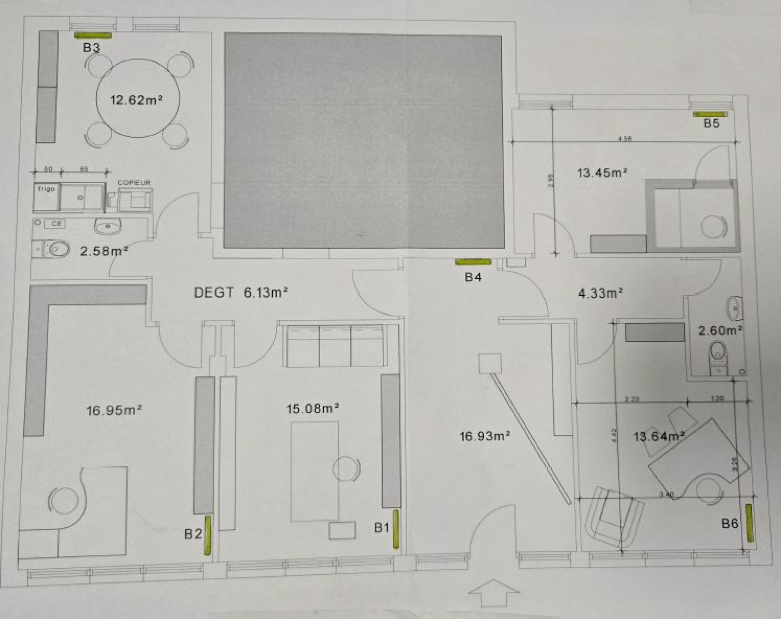 - A droite : un hall, 2 bureaux de plus de 13m² chacun dont un avec un petit studio d’enregistrement et 1 WC avec lave-mains ;