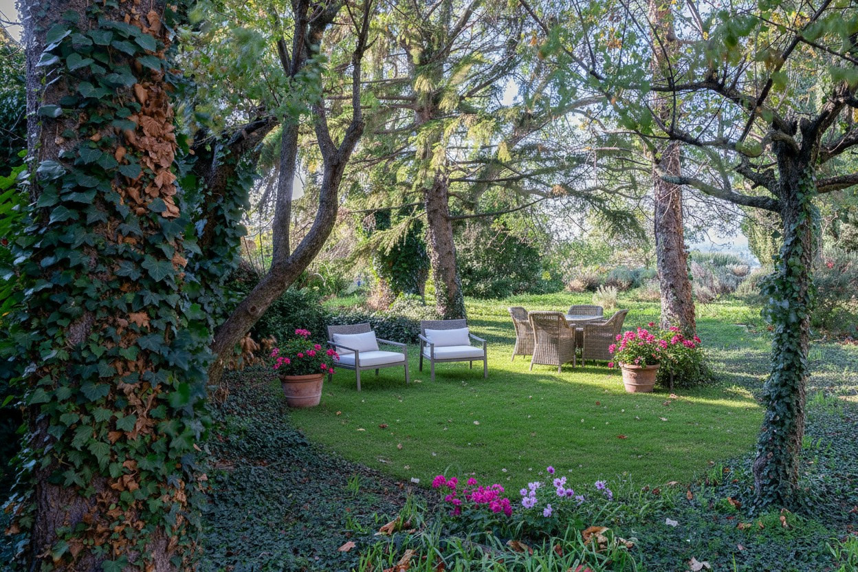 Le jardin, joliment arboré, planté de différentes essences méditérranéennes et de fruitiers invite à la flânerie. Les recoins intimistes, le bassin en pierre appellent aux moments suspendus. Une piscine parfaitement intégrée au décor, s'y rajoute.
