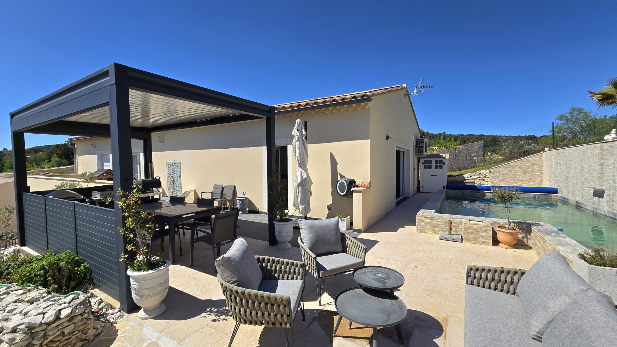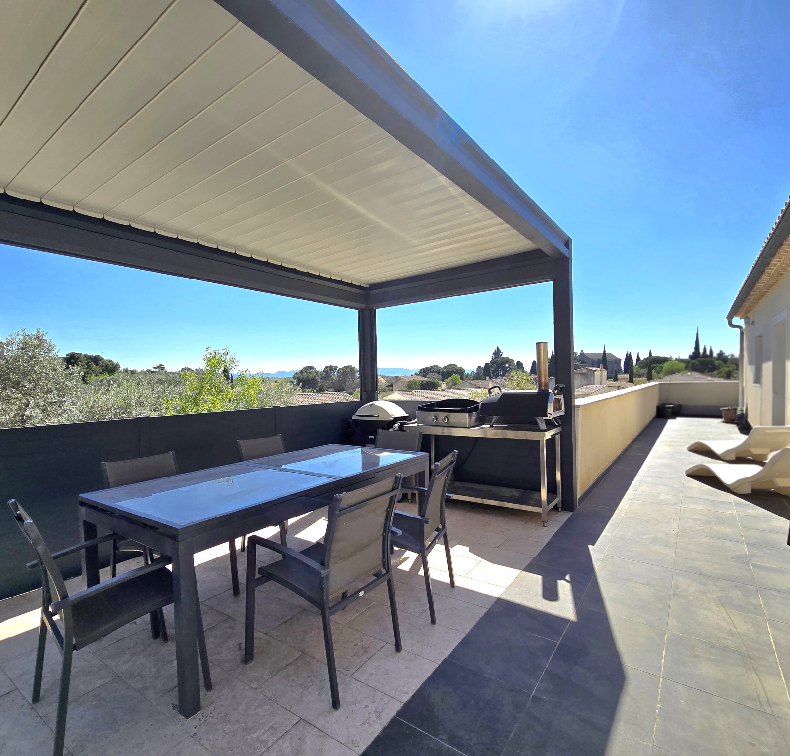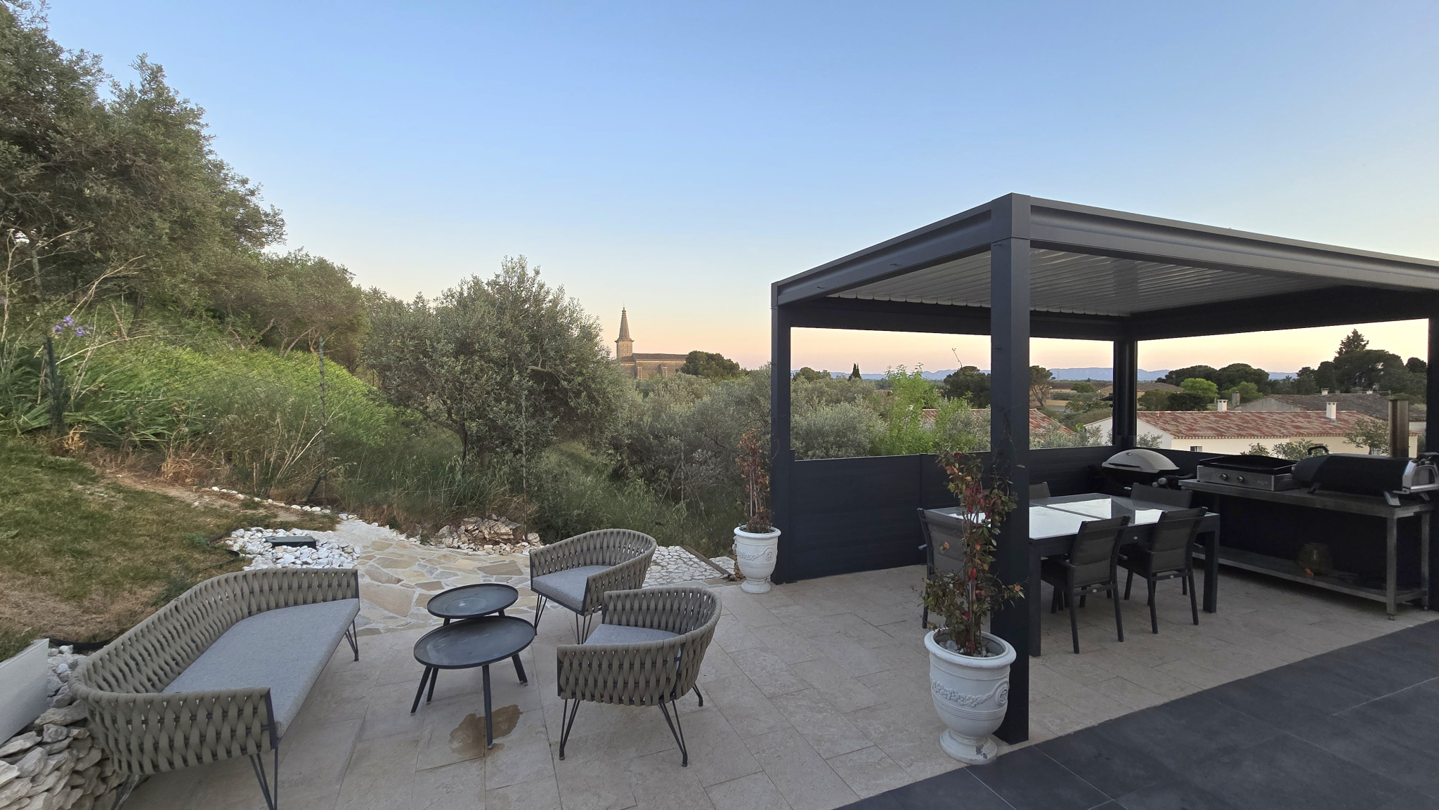 Dans son prolongement, une terrasse de 22 m² avec pergola bioclimatique et brise-vues motorisés, complétée par une terrasse filante reliant deux des trois chambres.