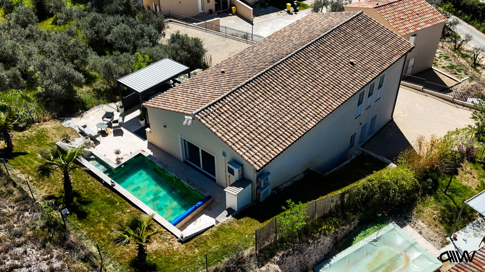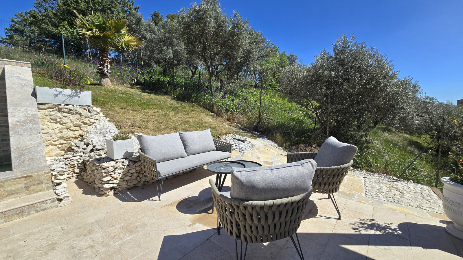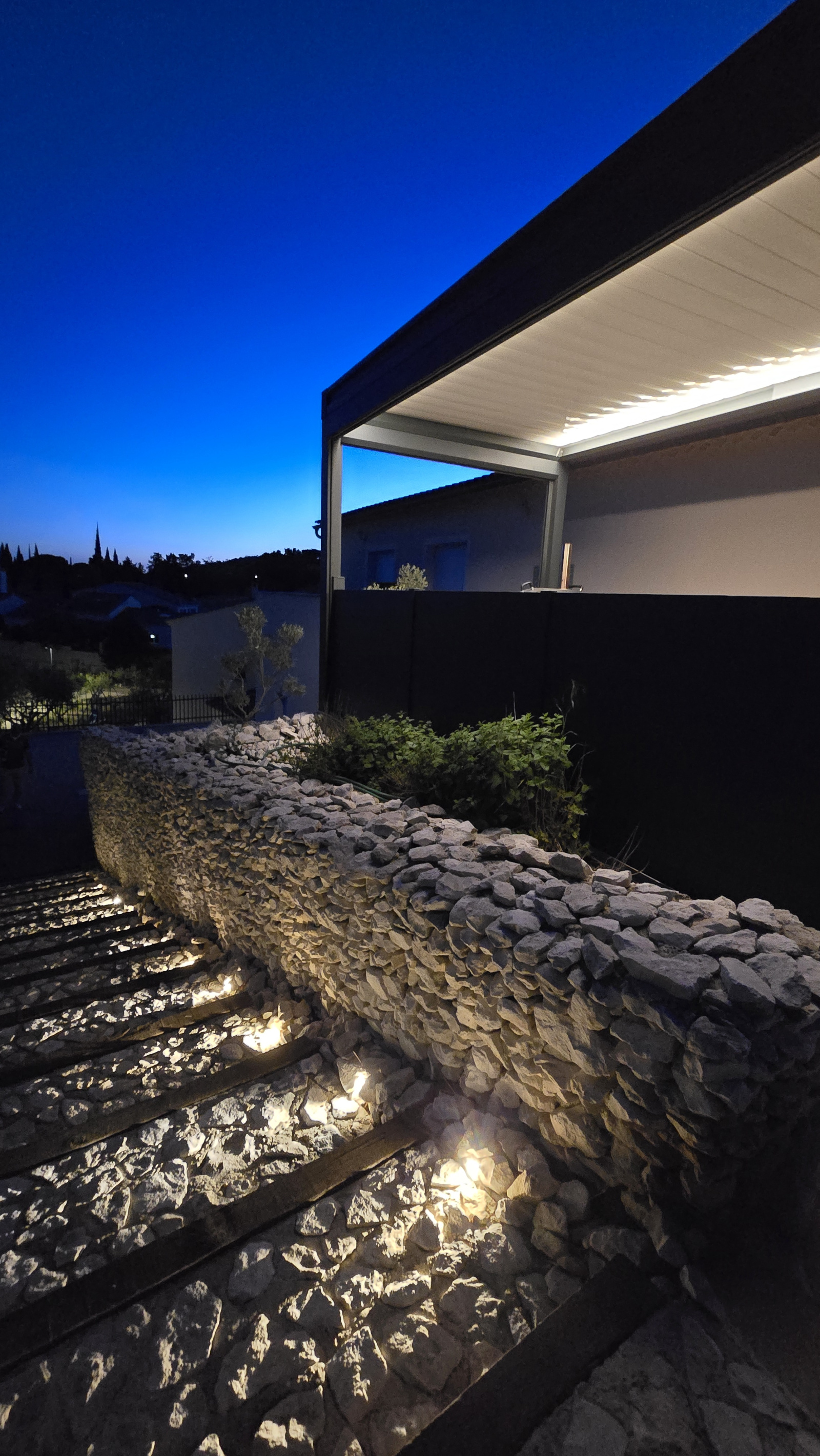 Dans son prolongement, une terrasse de 22 m² avec pergola bioclimatique et brise-vues motorisés, complétée par une terrasse filante reliant deux des trois chambres.