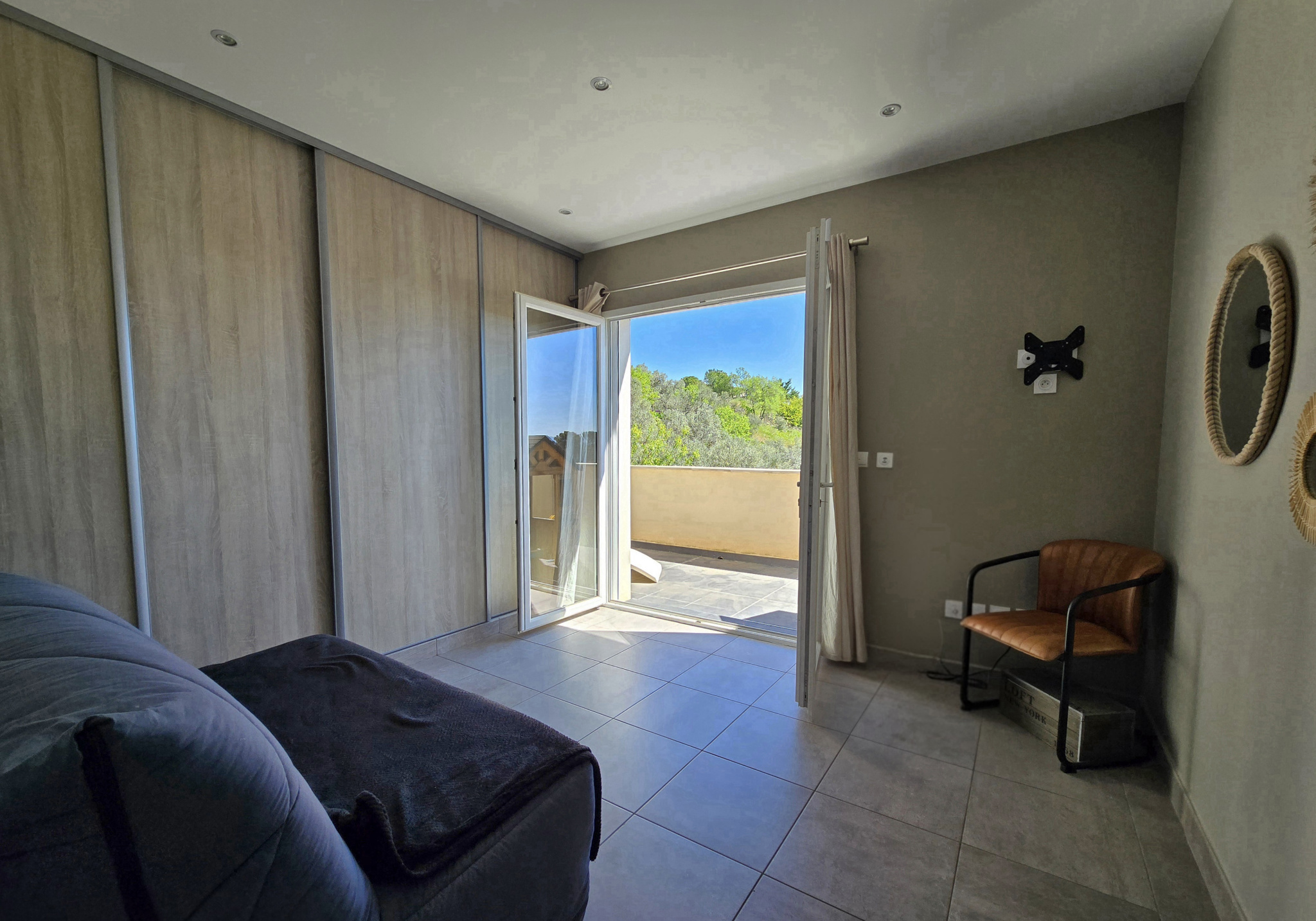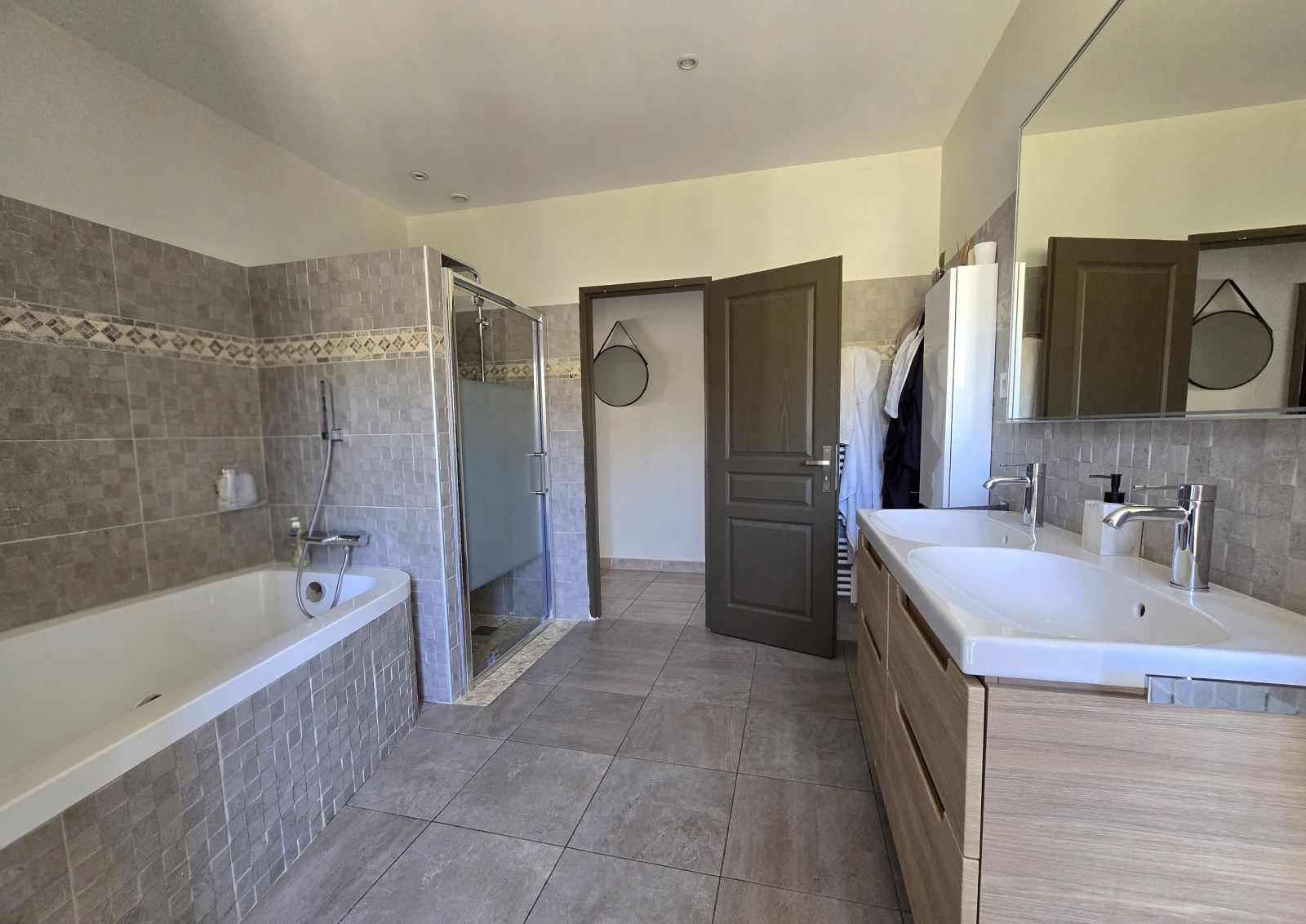 Le couloir dessert un cellier, 3 chambres climatisées - une de 12m² avec placards et - deux de 18m² bénéficiant de vues panoramiques, ainsi qu’un dressing de 6m², une salle de bain avec douche (11m²) et des toilettes indépendantes .