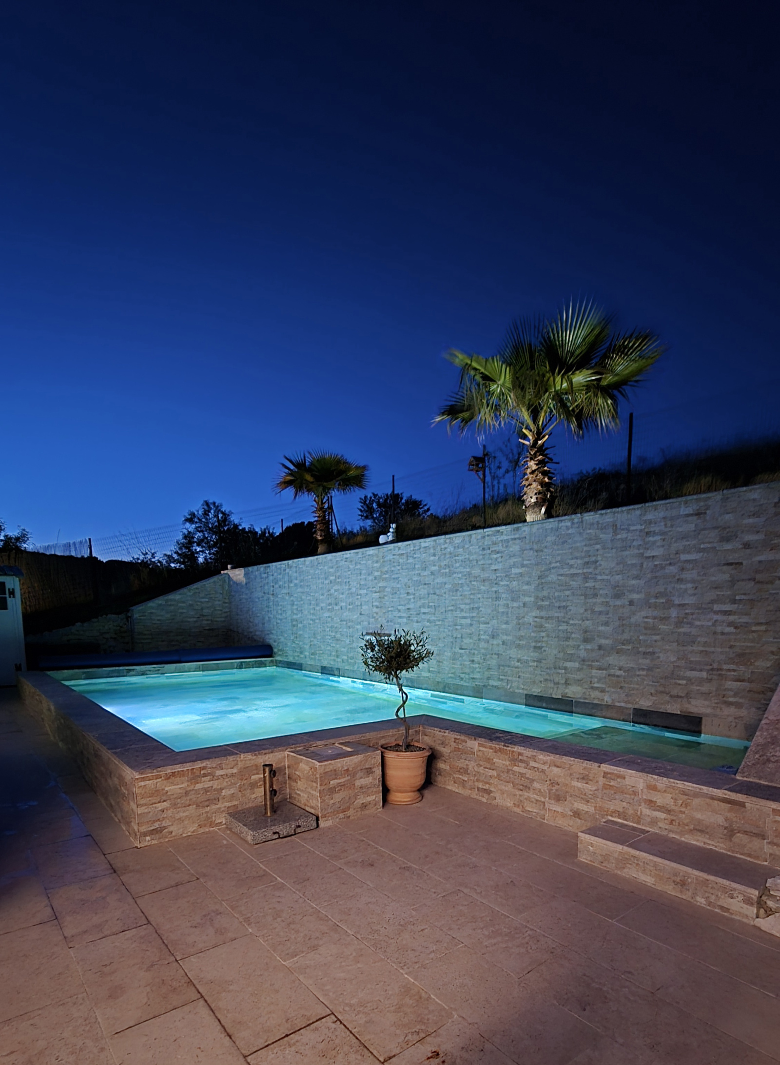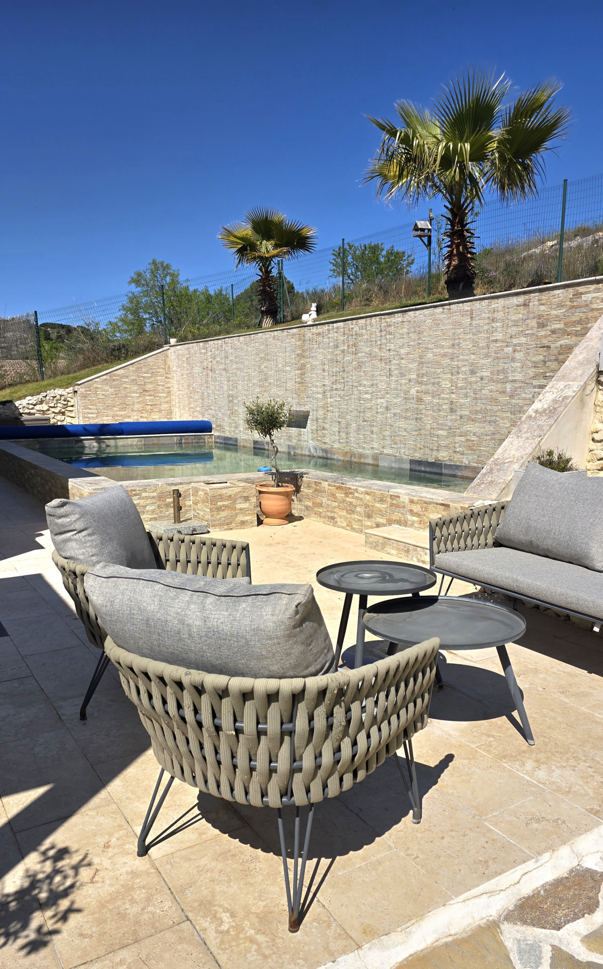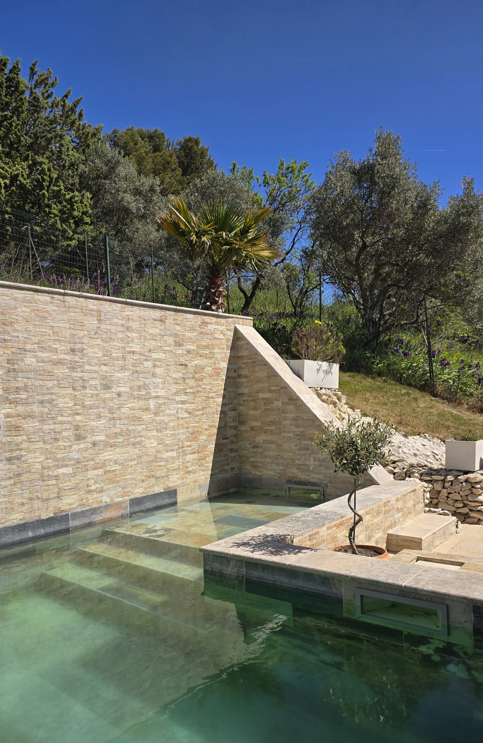 Piscine en pierre de bali ( 6x3.60m) avec cascade et plage immergée qui s’inscrit dans le prolongement de la terrasse et crée un espace de détente intime, à l’abri des regards.