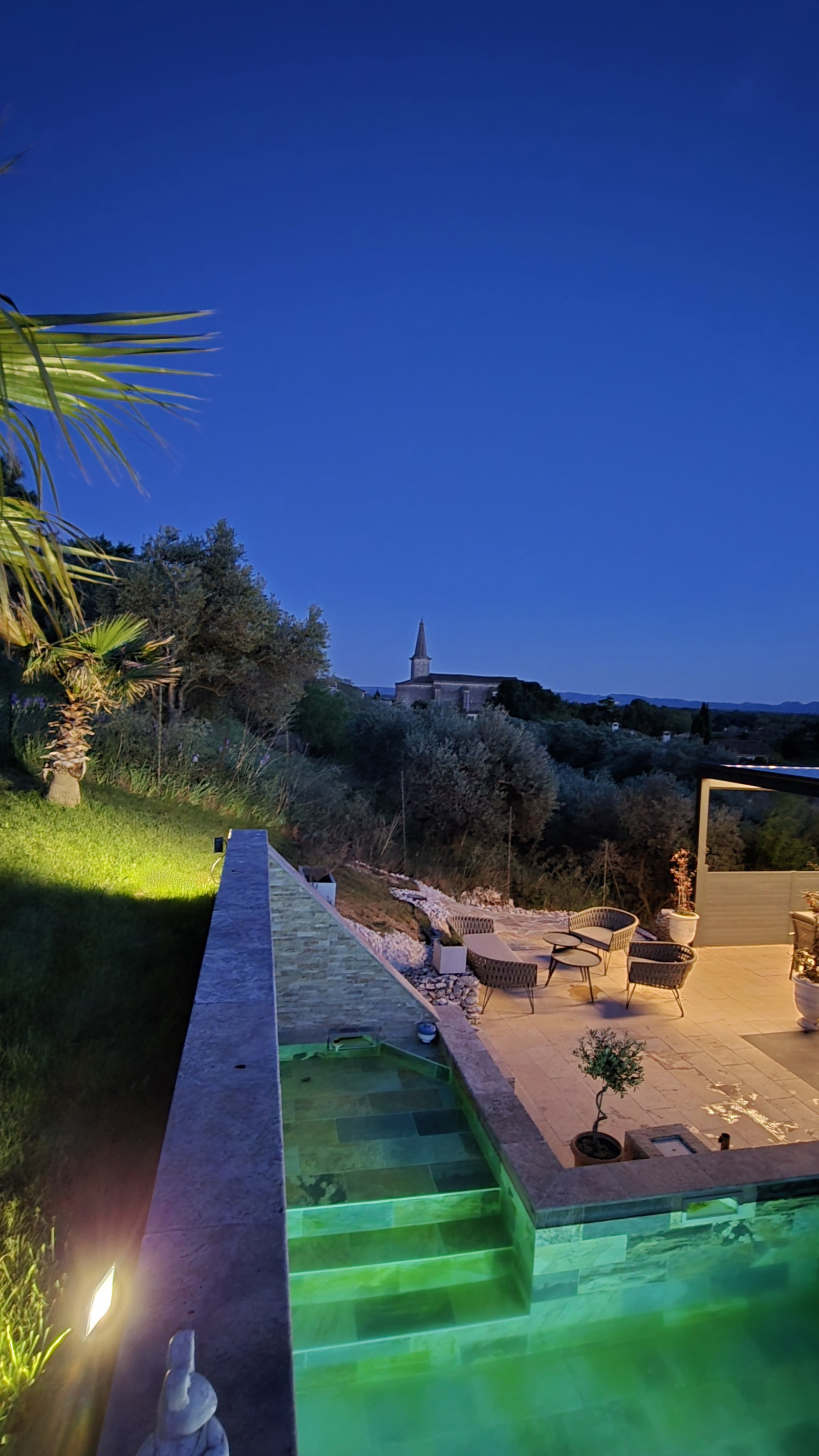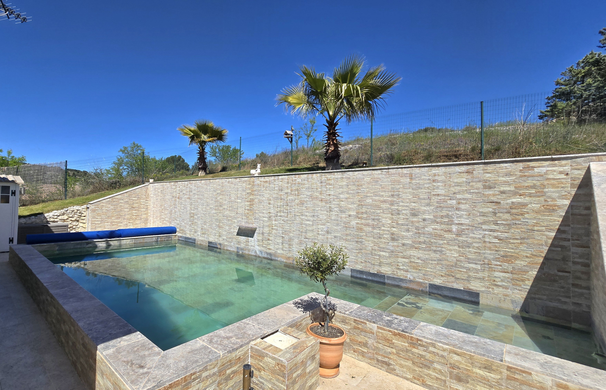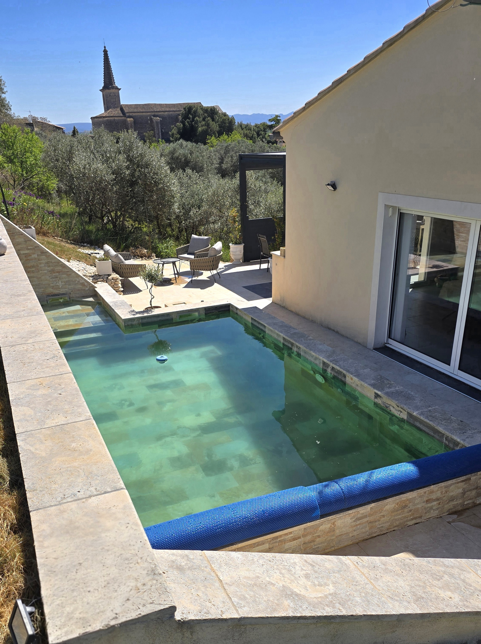 Piscine en pierre de bali ( 6x3.60m) avec cascade et plage immergée qui s’inscrit dans le prolongement de la terrasse et crée un espace de détente intime, à l’abri des regards.