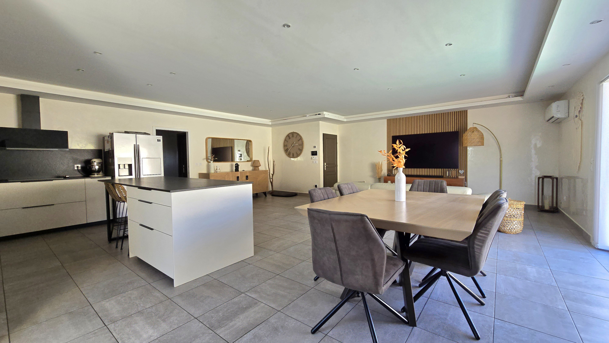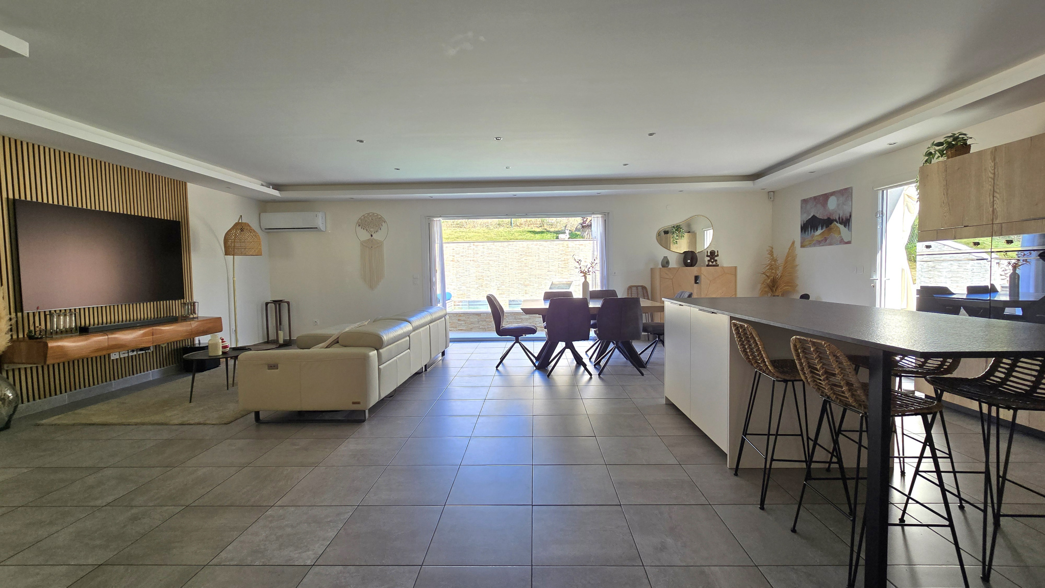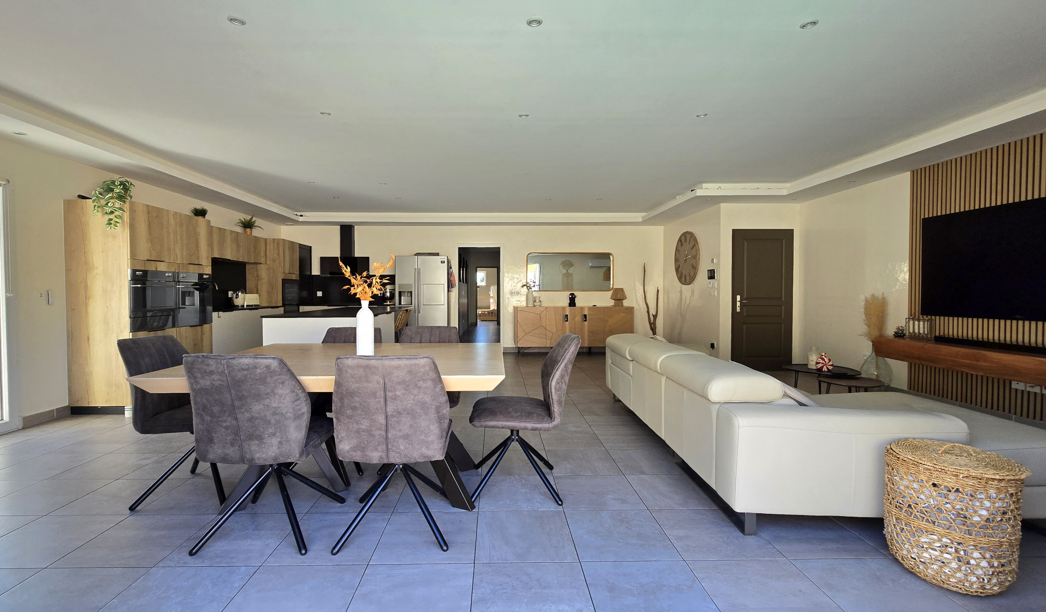 Dès l’entrée vous serez séduit par une pièce de vie lumineuse de 61 m², harmonieusement mise en valeur par des baies vitrées à galandage ouvrant naturellement sur l’espace piscine.