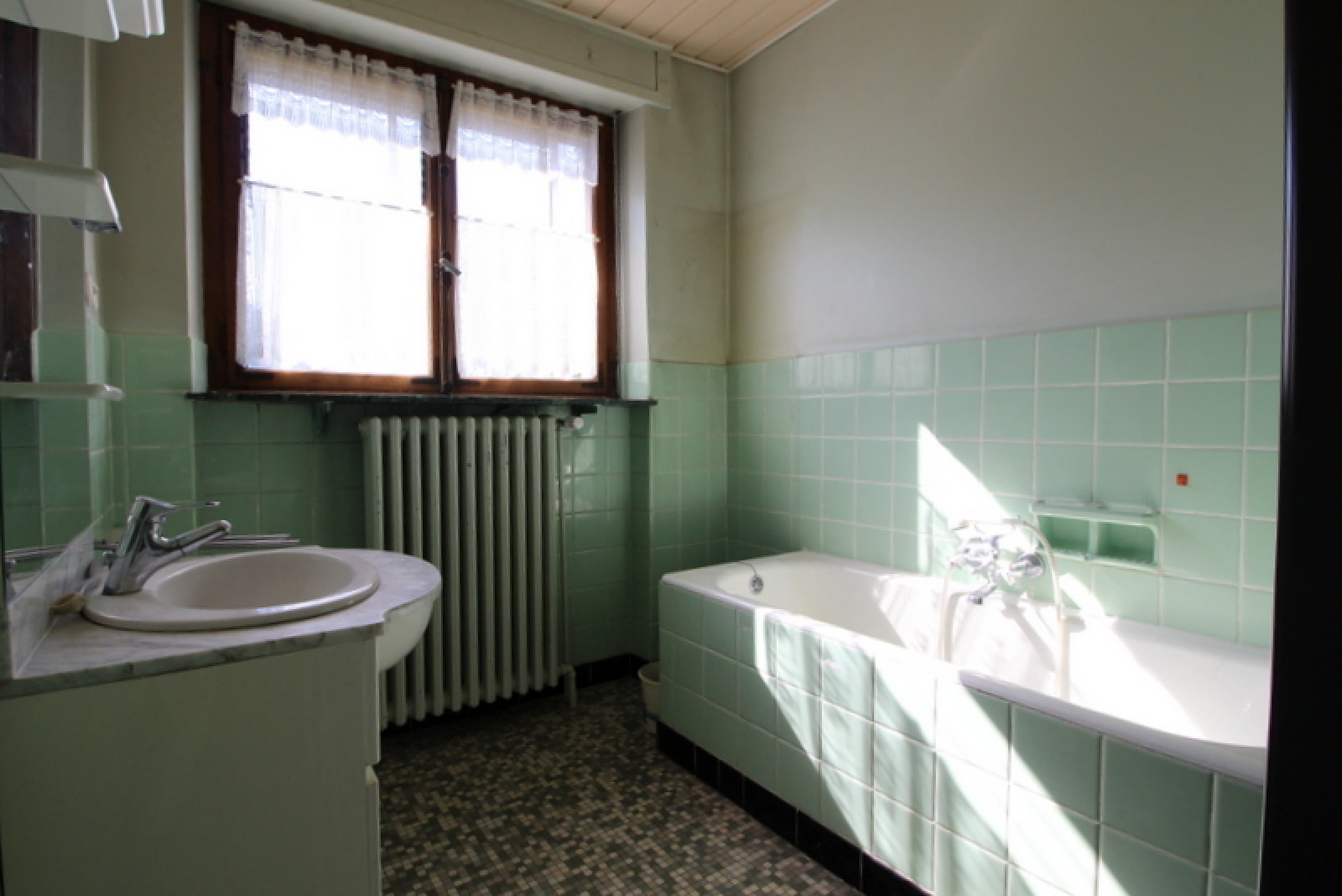 carrelage, 1 baignoire, 1 douche, 1 fenêtre, 1 radiateur, 1 vasque