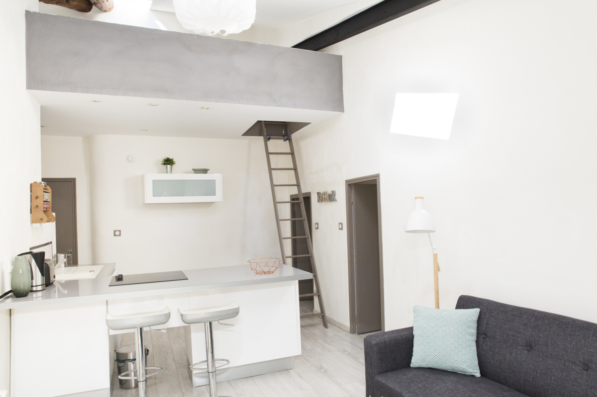 Au 1er étage d’un immeuble sur cour, découvrez un T1 bis meublé et équipé de 22,2 m² habitables (40,54 m² au sol): il offre une belle pièce de vie avec cuisine ouverte donnant sur balcon, un espace nuit distinct (7,82 m2 de surface au sol), une salle d’eau, des WC séparés et une mezzanine avec couchage.