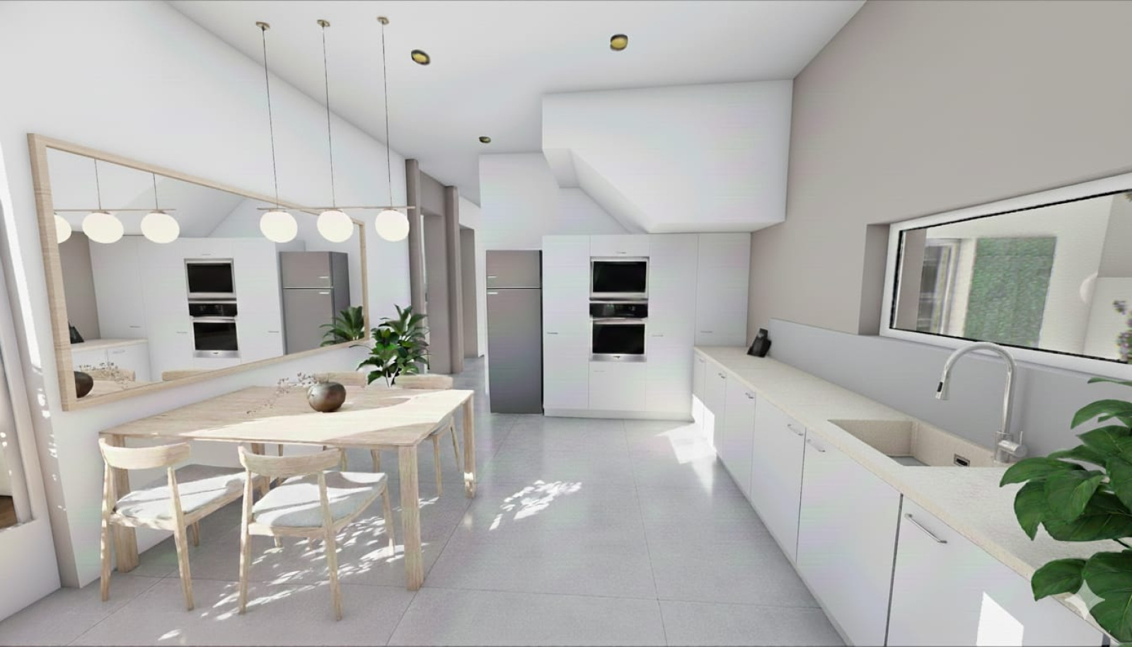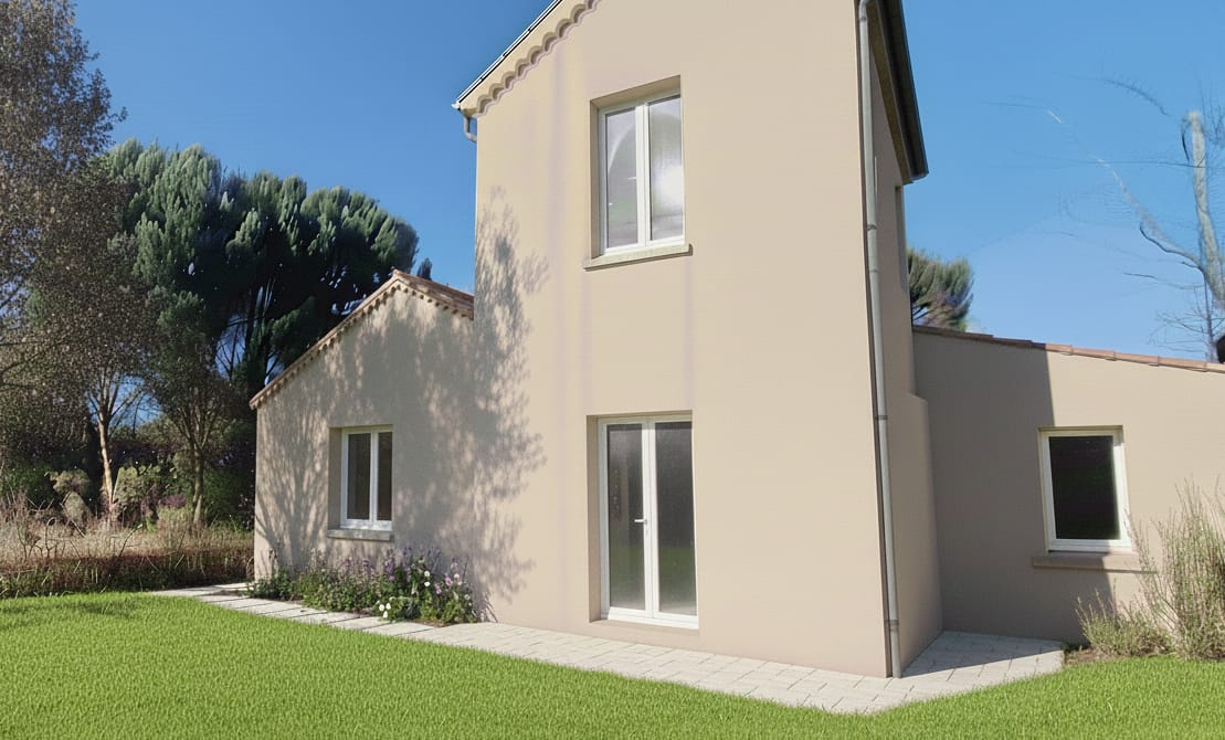 Rez-de-chaussée: un séjour lumineux ouvrant sur une grande terrasse de 35 m² exposée plein sud, idéal pour profiter des beaux jours. Une cuisine (semi-ouverte ou fermée), un cellier, un dégagement deservant deux chambres confortables, une salle de bain et un WC indépendant.