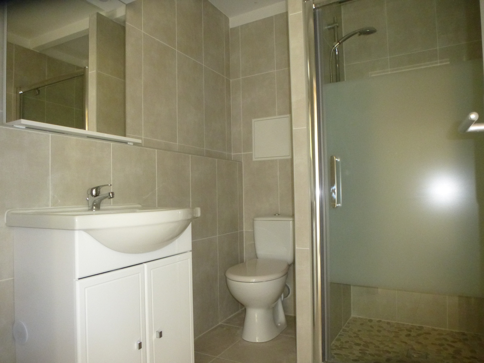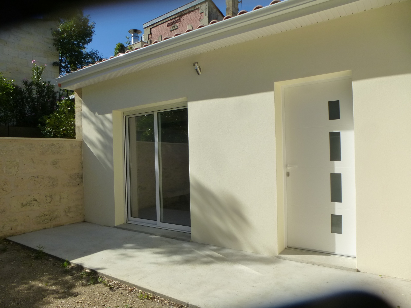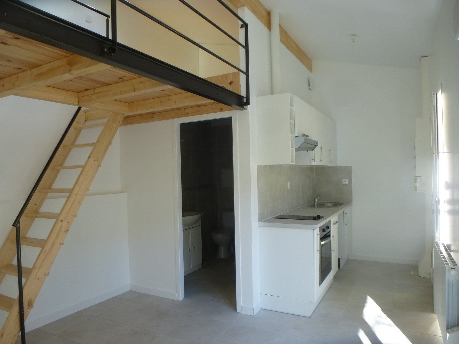Pièce de vie salle d'eau avec wc coin cuisine amenagée terrasse et jardinet privé