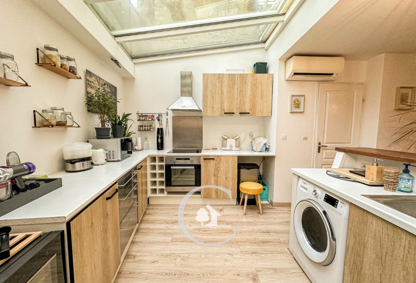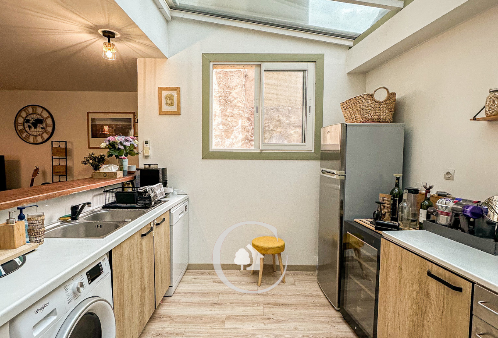 Au premier niveau : vous trouverez une entrée sur séjour double avec cuisine ouverte aménagée et équipée, un dégagement avec rangement et un WC séparé.