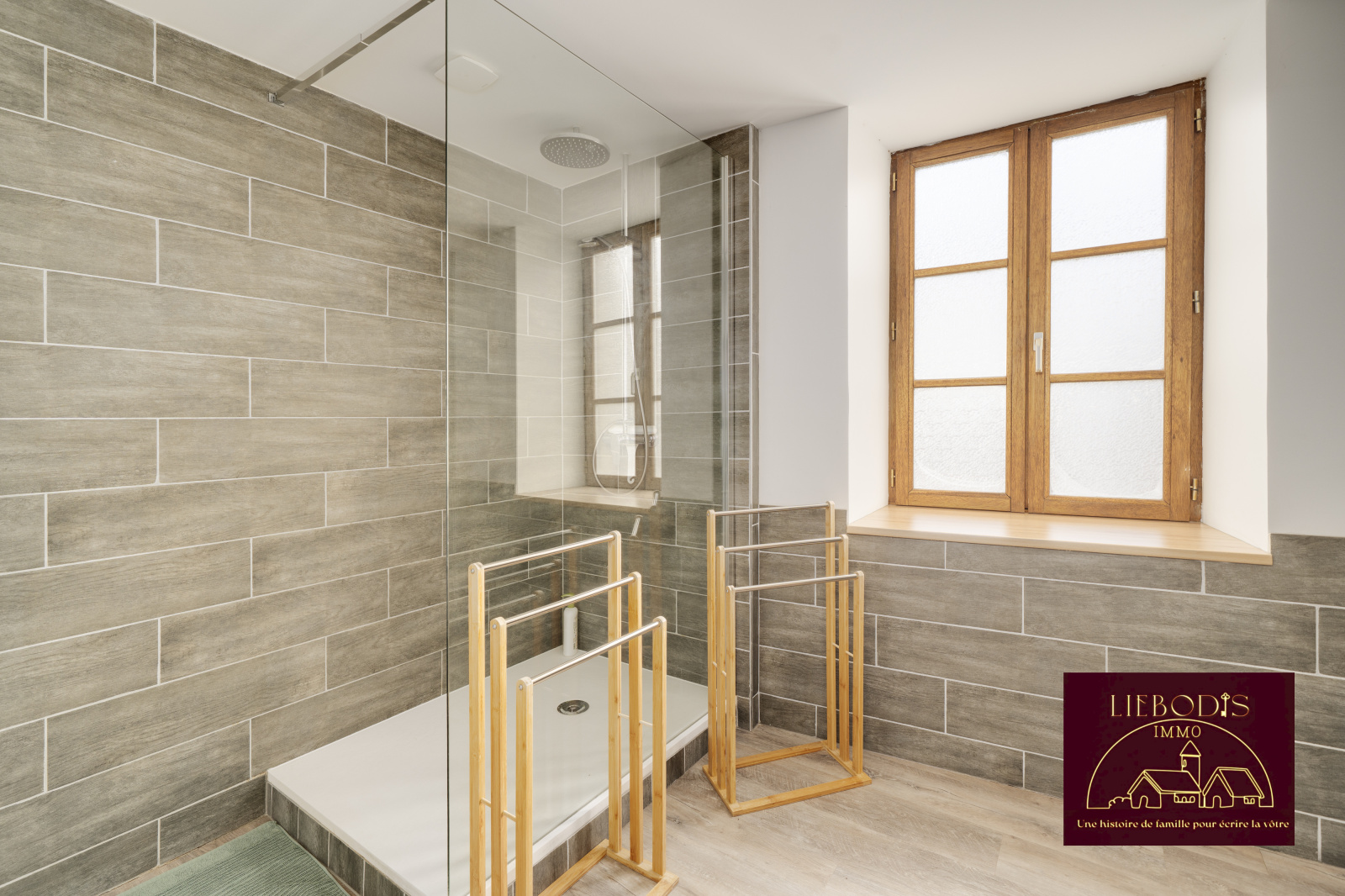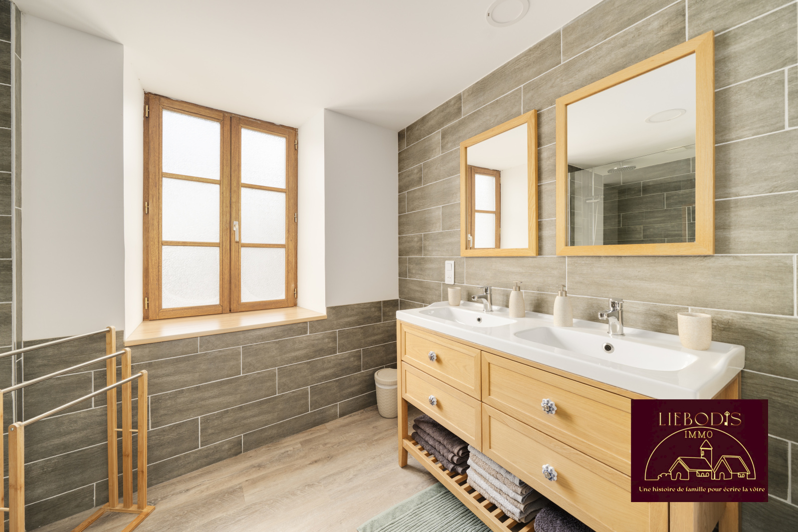 En demi-niveau, vous trouverez une salle d'eau avec double vasque et douche à l'italienne ainsi qu'un WC séparé.