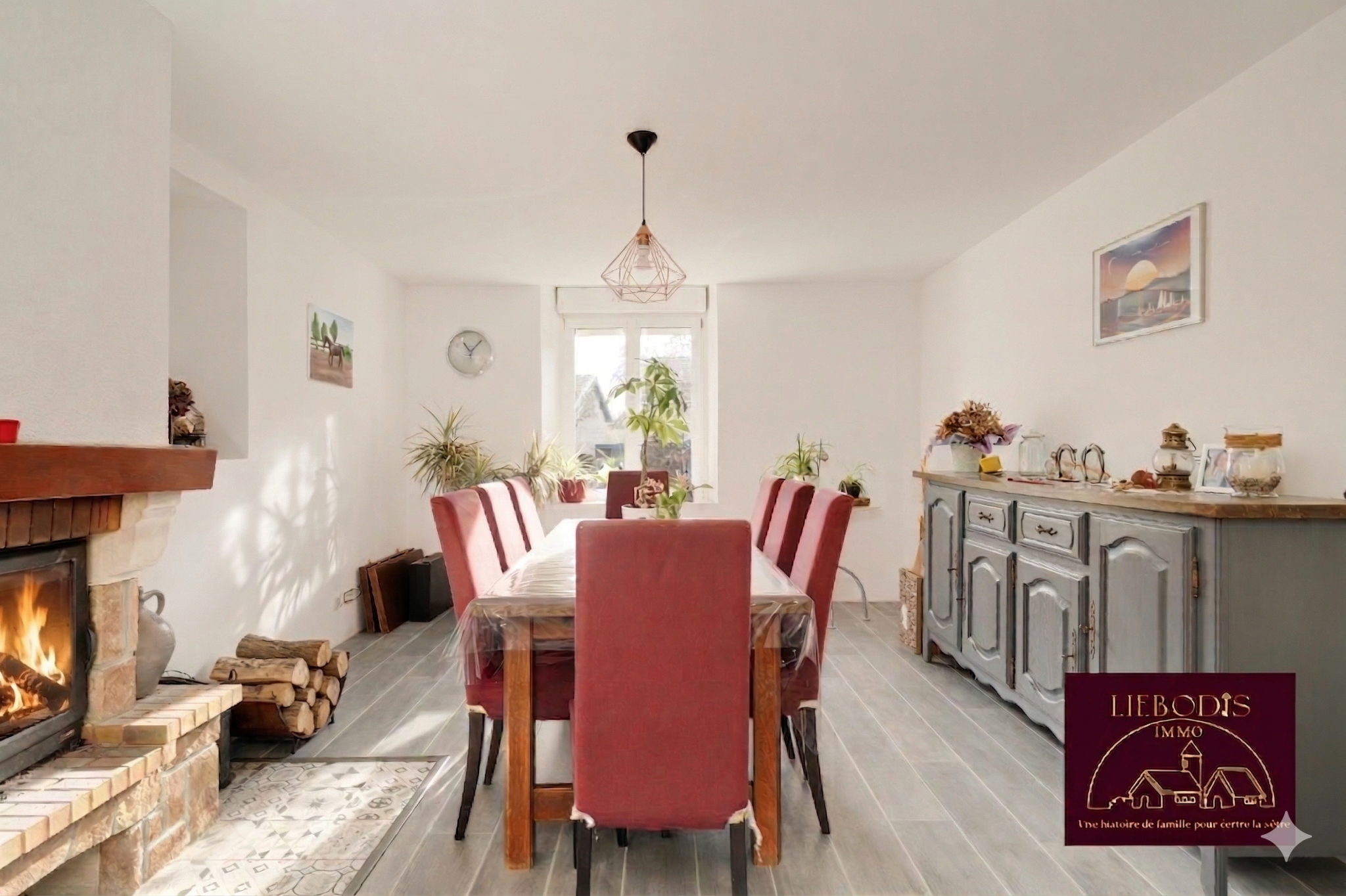 Une spacieuse entrée dessert d'un côté la cuisine équipée avec accès direct à la terrasse et au jardin, de l'autre une belle pièce de vie avec salon et salle à manger, avec sa lumière traversante et sa cheminée, le confort y sera optimal été comme hiver. Un WC avec lave-mains complète ce niveau.