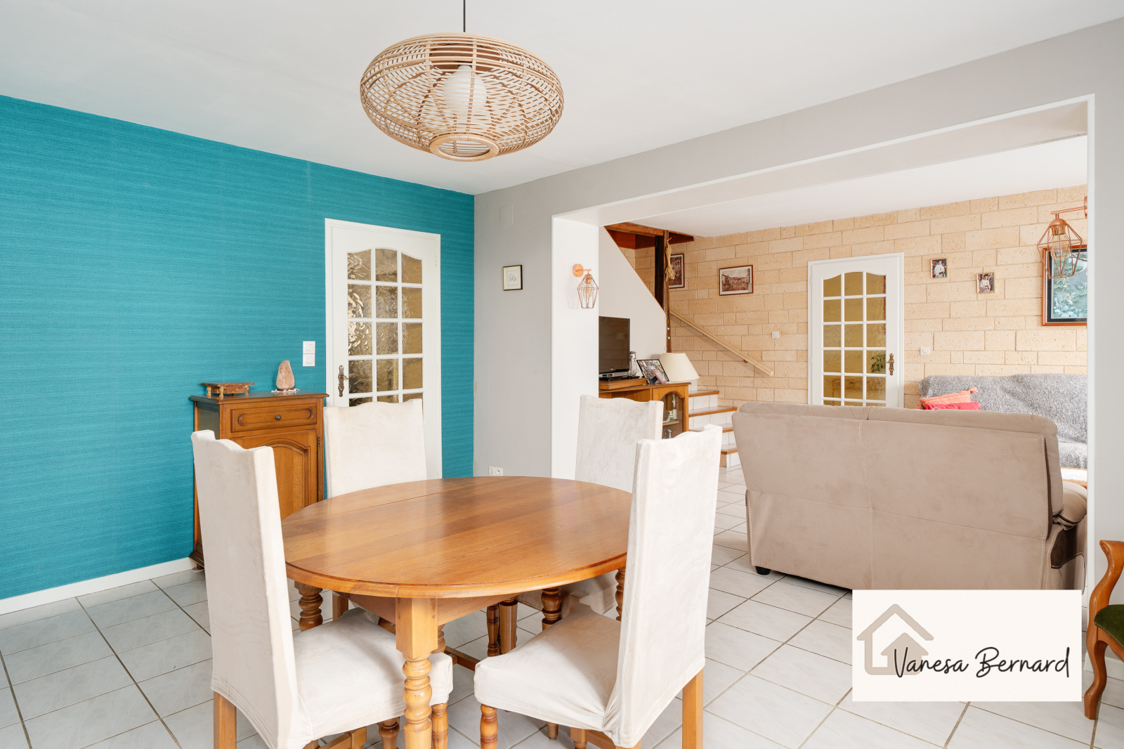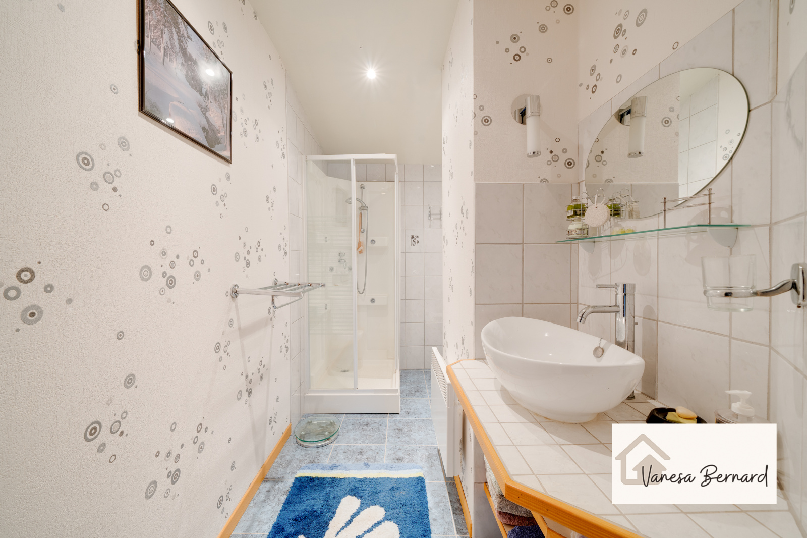 La maison se compose en RDC, d'un couloir desservant un très beau salon-séjour avec cheminée, une grande cuisine dinatoire équipée donnant sur la terrasse, une salle de bains avec douche à l'italienne et baignoire, un wc séparé.