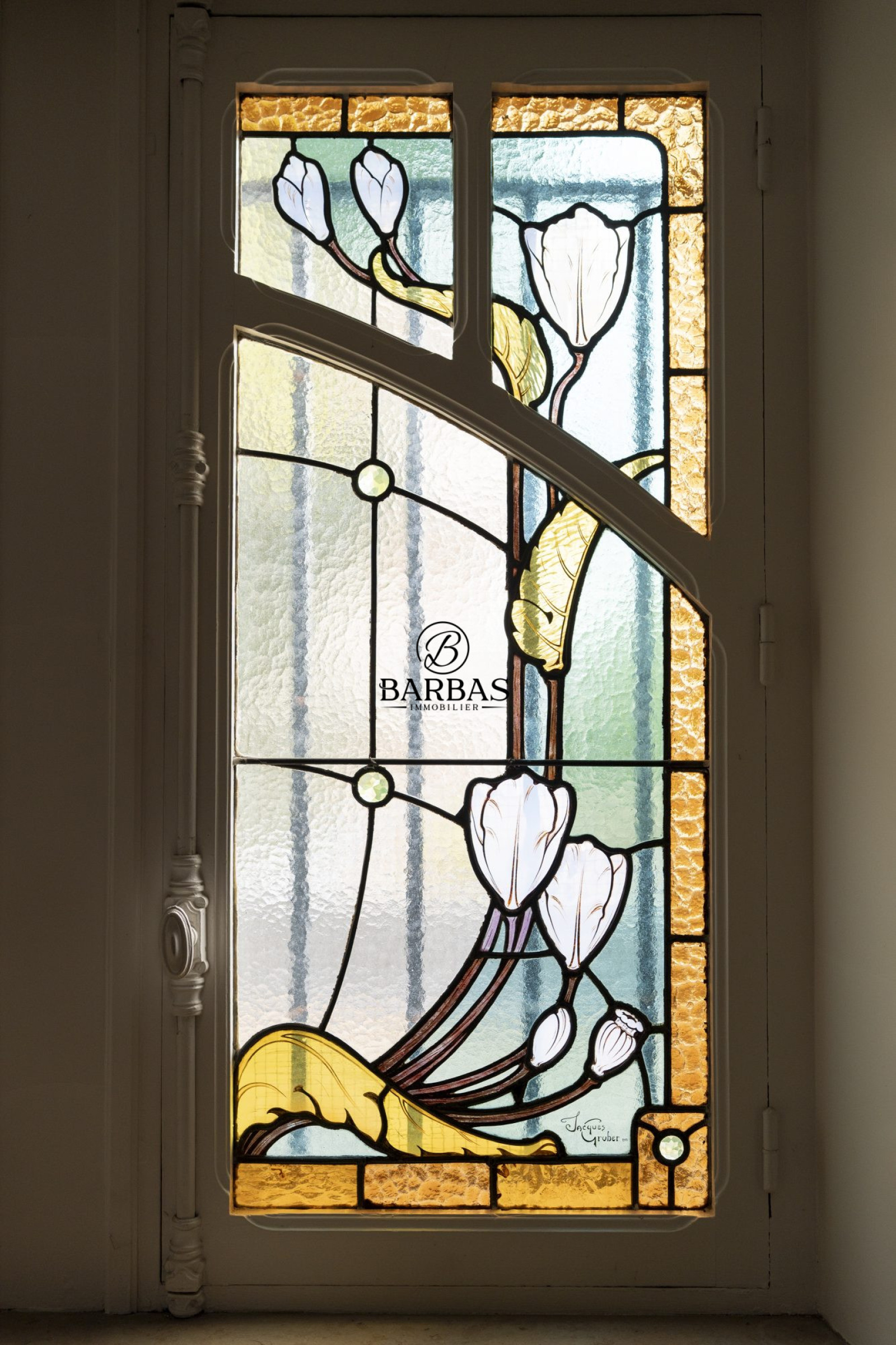 Les espaces de réception sont magnifiés par des boiseries d’exception, de nombreux vitraux signés Gruber et une cheminée en céramique vernissée aux motifs floraux, typique du style École de Nancy.