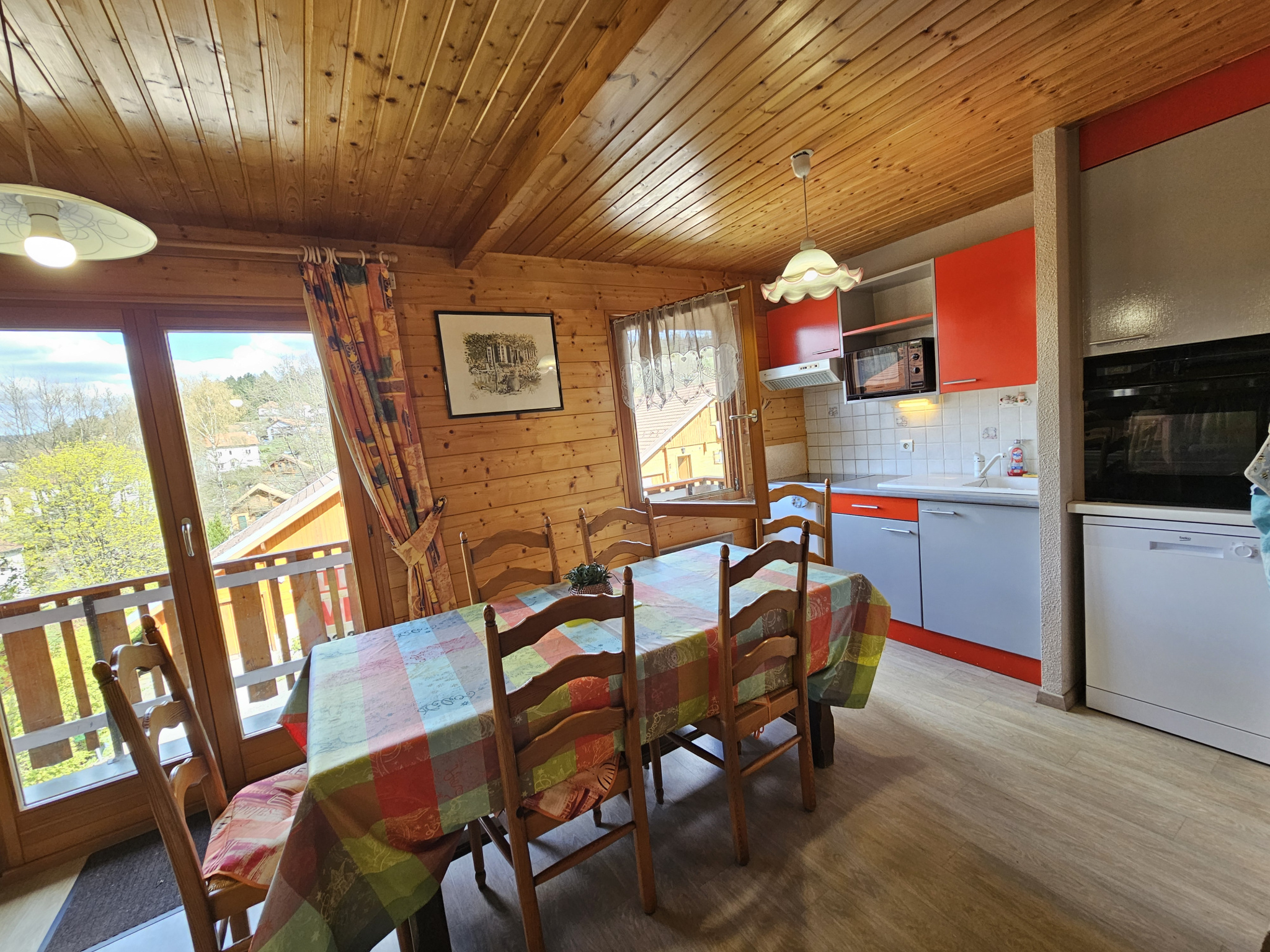 Belle pièce de vie de 25 m² avec cuisine aménagée, ouvrant sur un balcon en L de 18 m² avec vue panoramique sur la montagne et la forêt