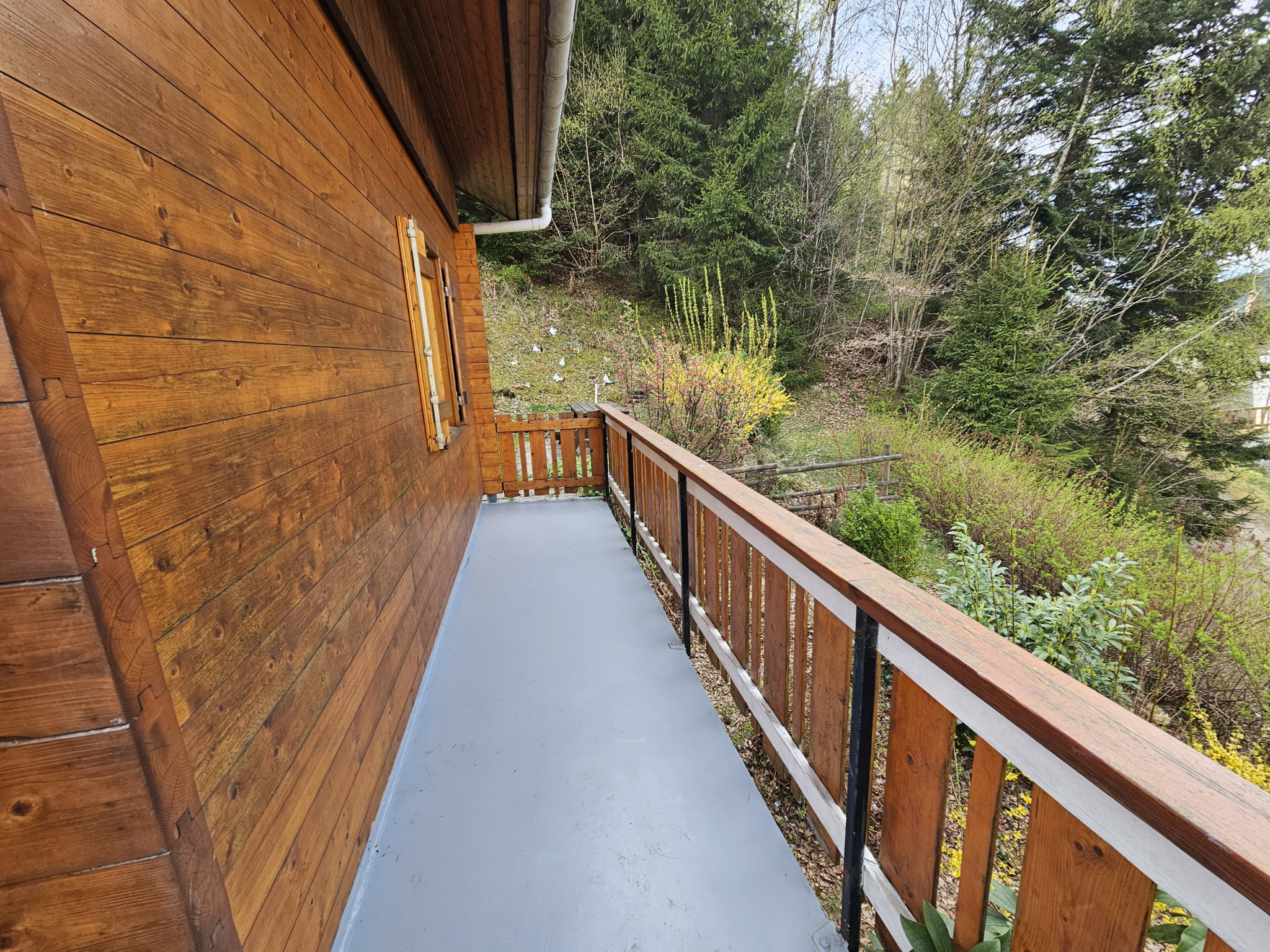 Terrain de 900m² en grande partie arboré, avec belle terrasse donnant accès au balcon