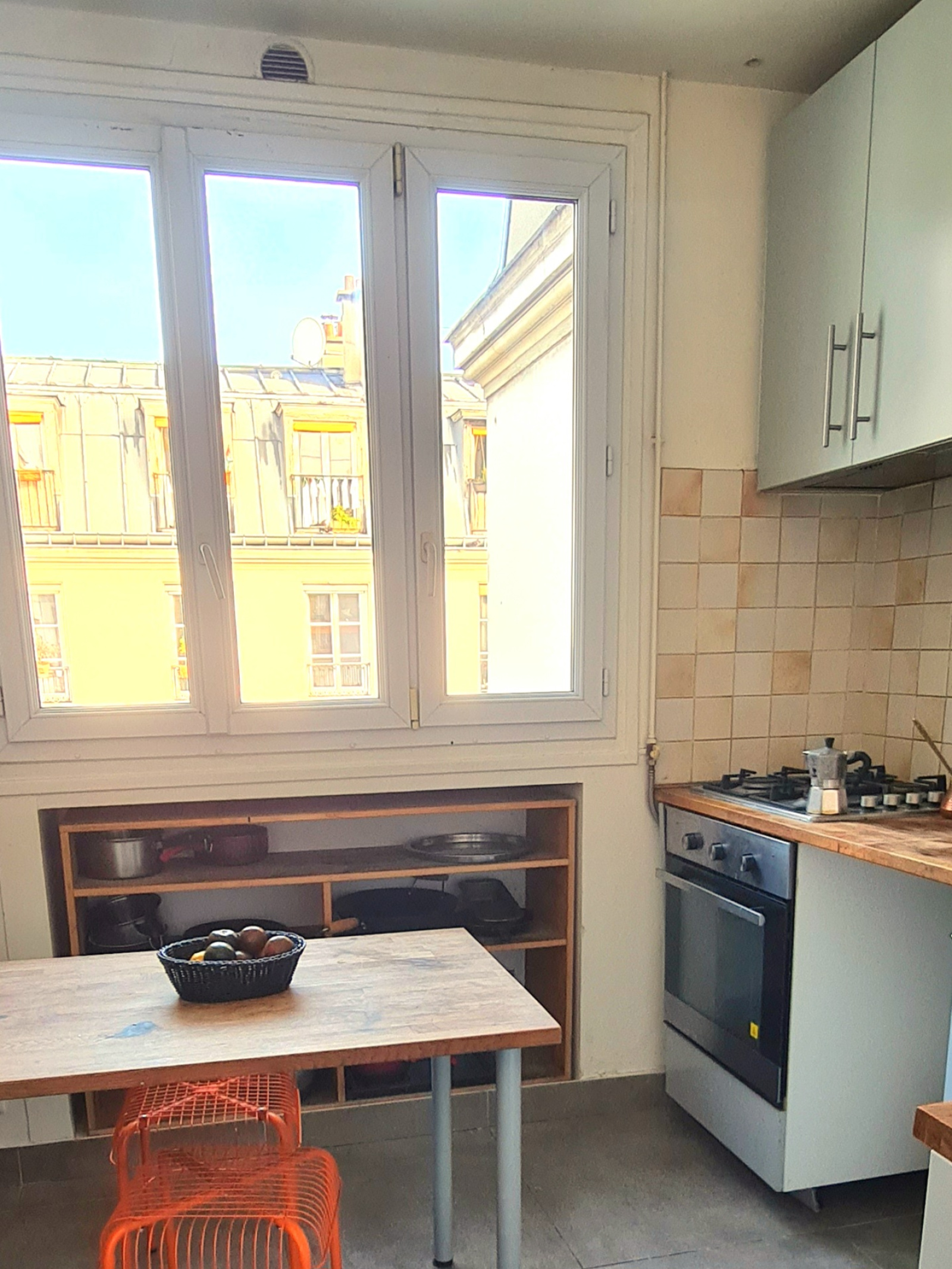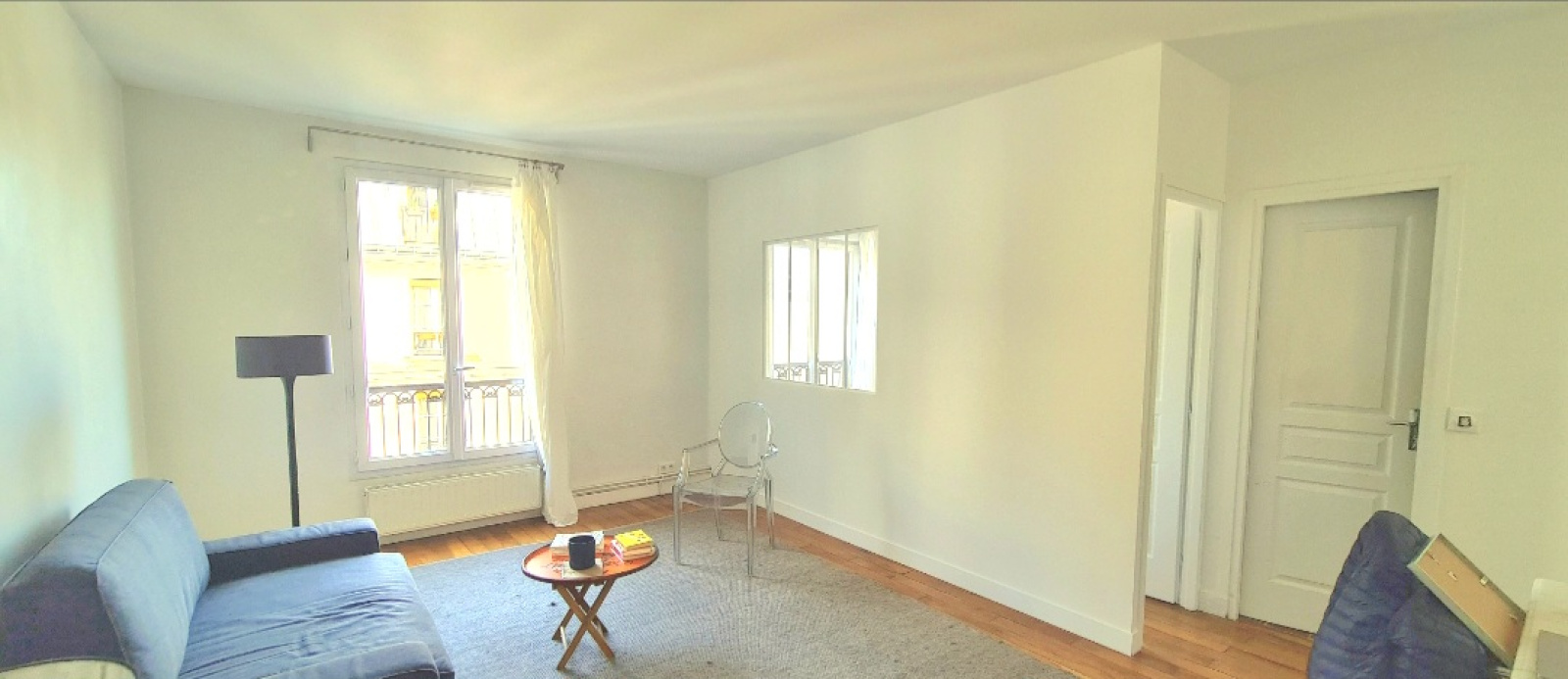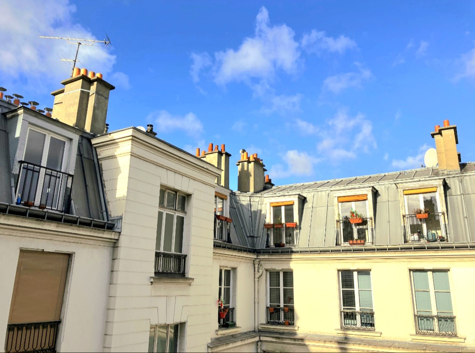 XVIIIème -Goutte d'Or - Square Léon : Dans un bel immeuble ancien, charmant 2 pièces au 5ème sans ascenseur, très lumineux et au calme, avec vue sur les toits donnant sur une grande cour.Sa surface est d'environ 43,1 m² (43.65 au sol) avec un plan très bien exploité: Il se compose d'un grand séjour (20 m2 environ) , d'une chambre, d' une belle cuisine séparée et équipée, d'une salle de douche,d'un wc. Il est possible de créer une deuxième chambre en faisant une cuisine ouverte dans le séjour. Double vitrage, parquet.Une cave complète ce bien. Local à vélo, digicode. Métro Barbès- Rochechouart .Charges annuelles 1200 €, (2 lots). Honoraires 3% charge acquéreur (RSAC 352137756- Paris)