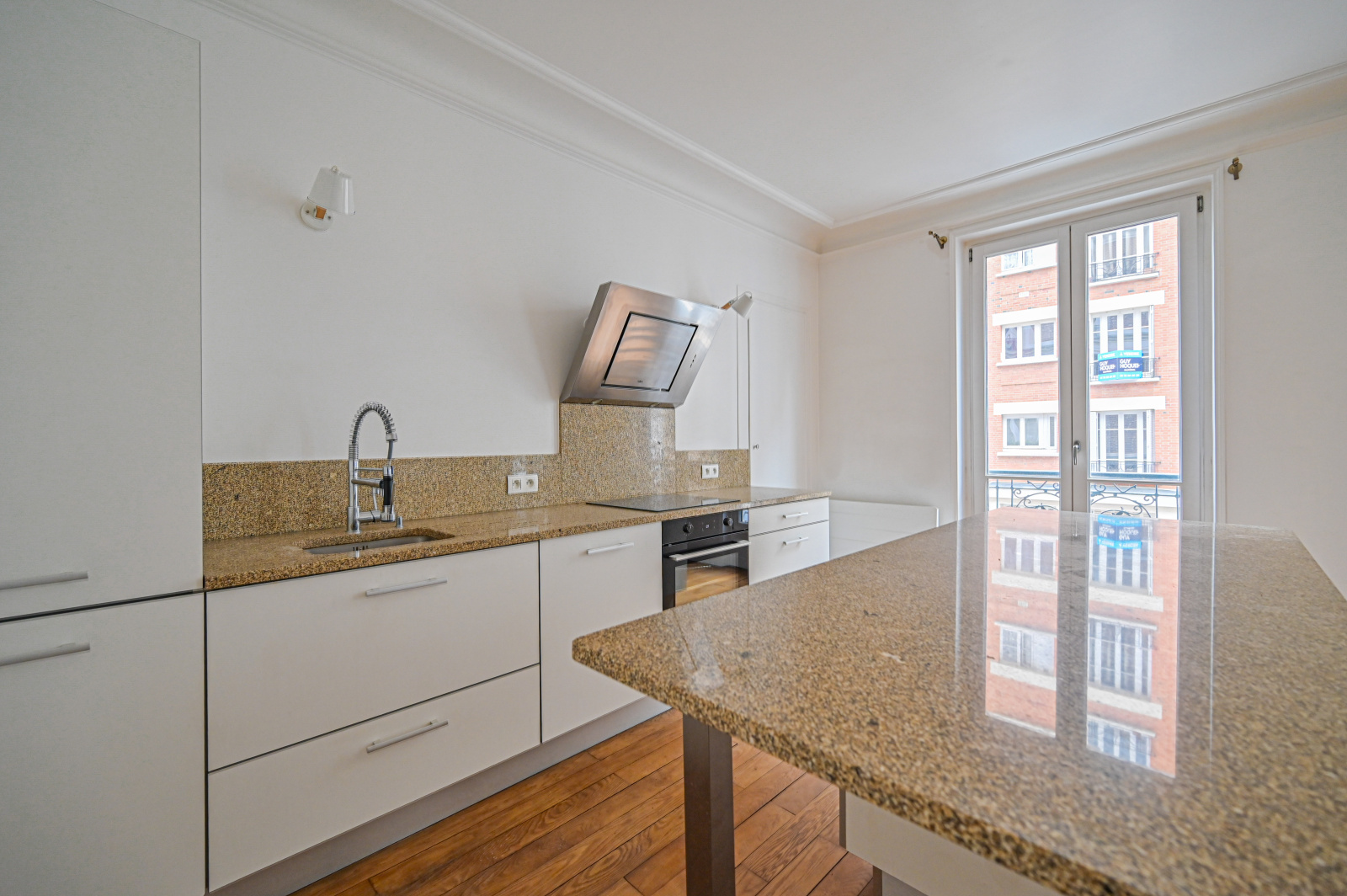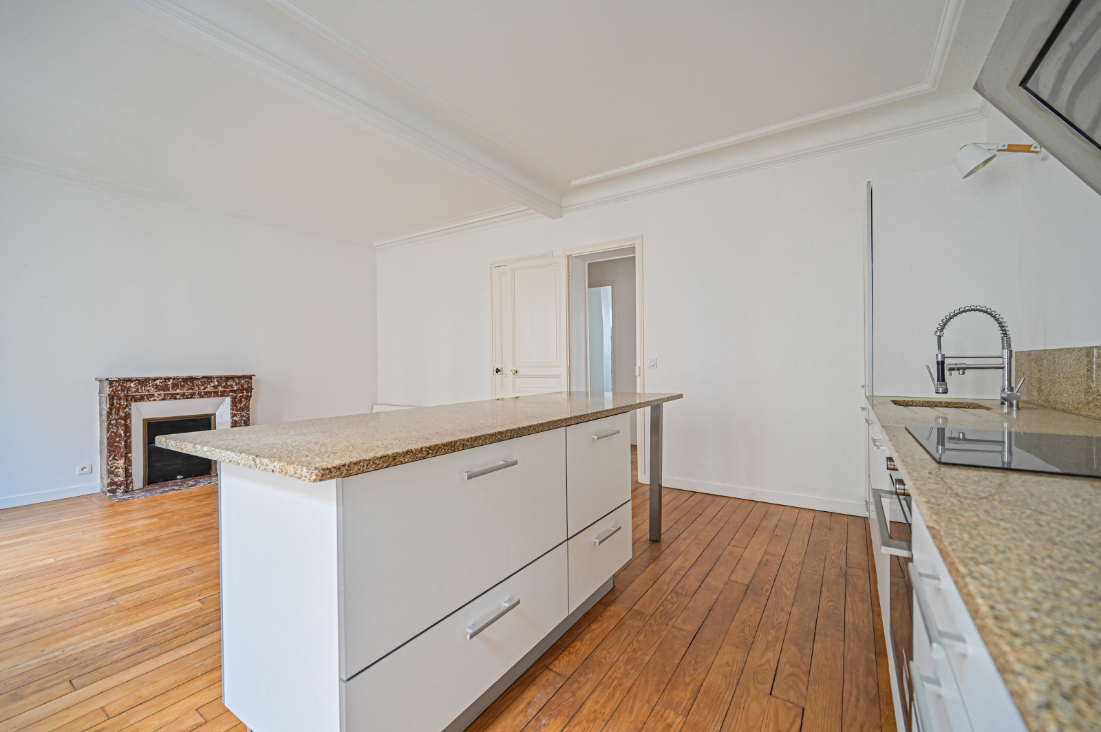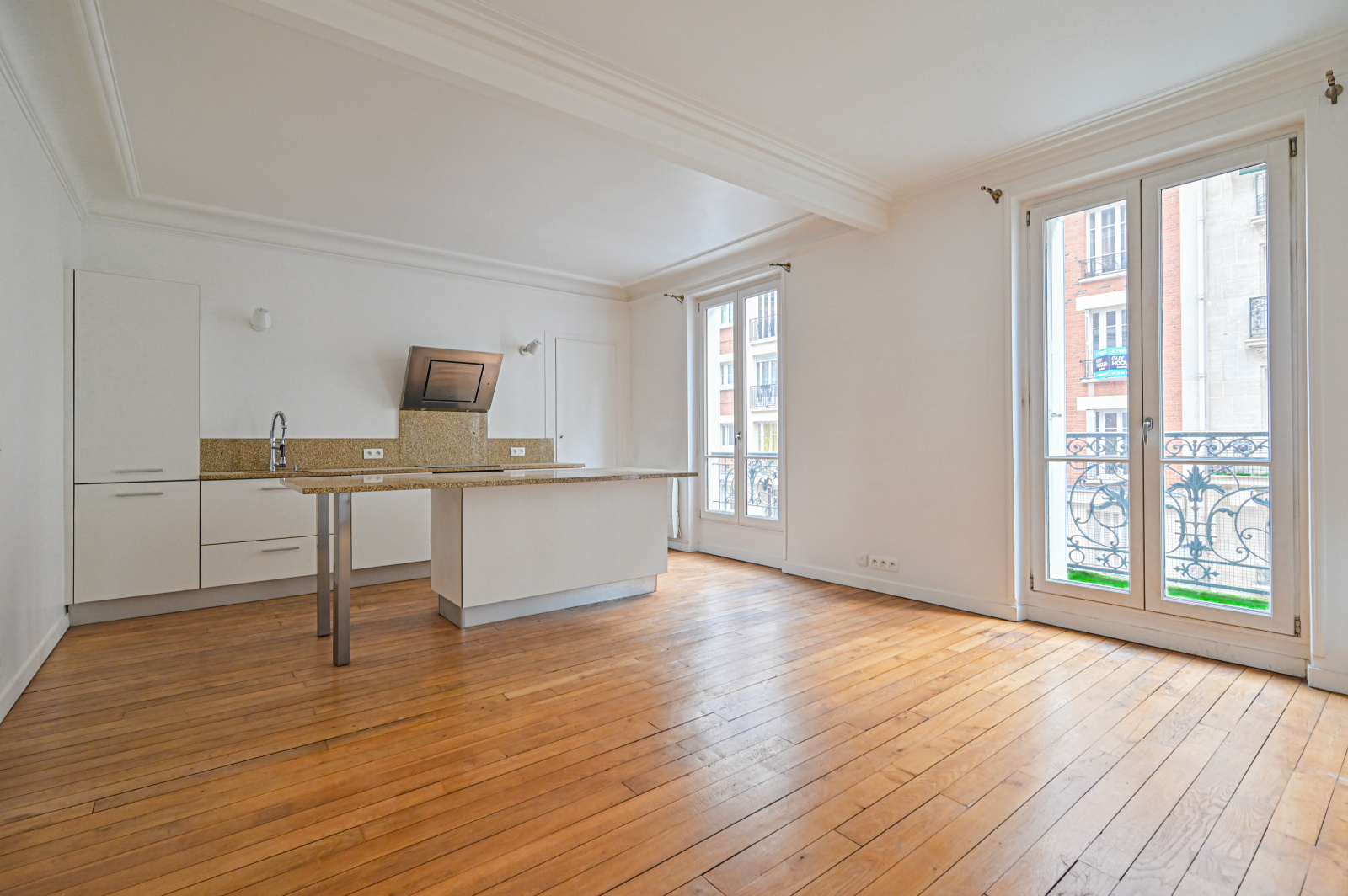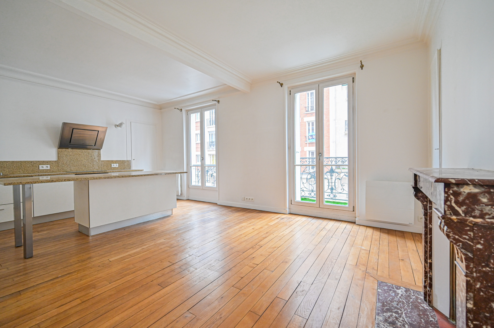 Le salon, doté de deux grandes fenêtres, d’un petit balconnet et d’une jolie cheminée, s’ouvre sur une cuisine équipée et fonctionnelle, créant un espace convivial et chaleureux.