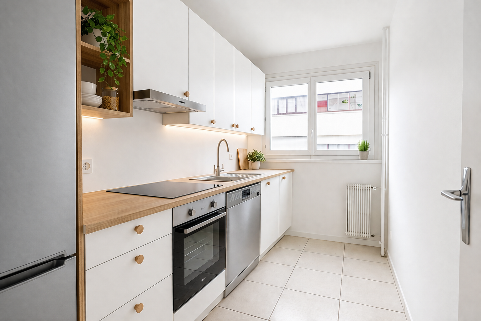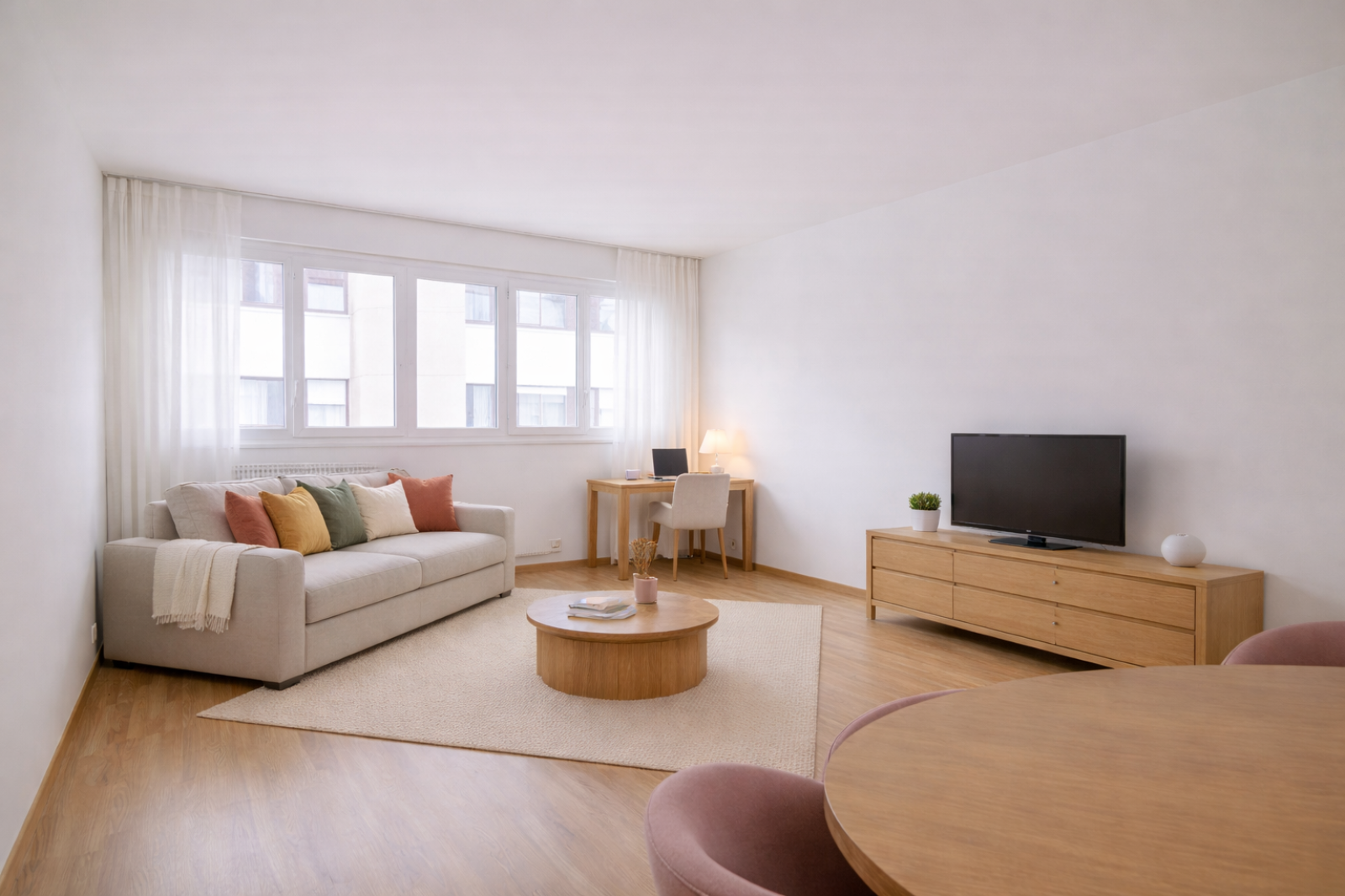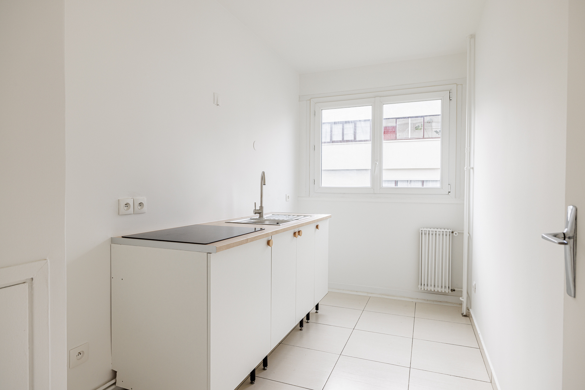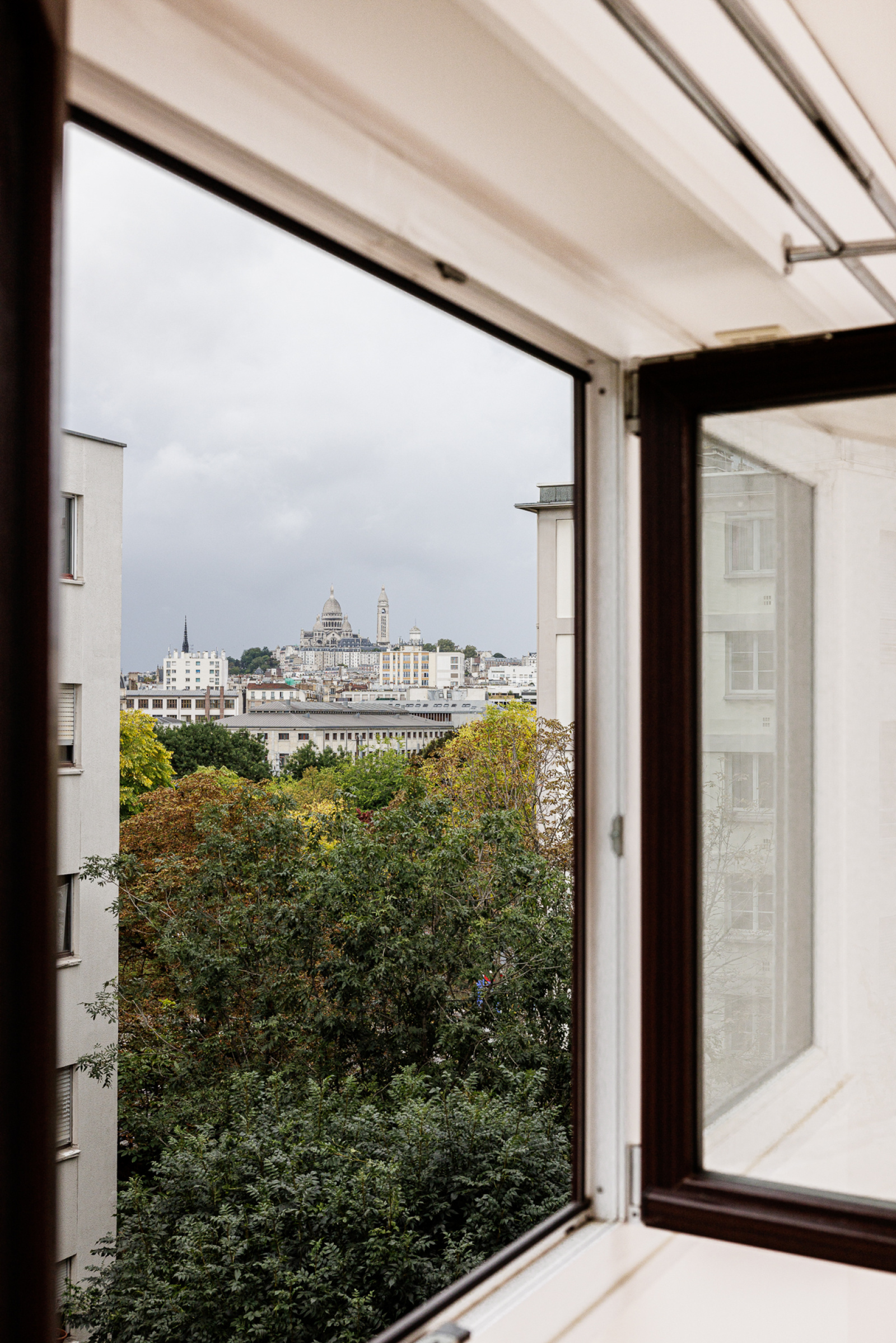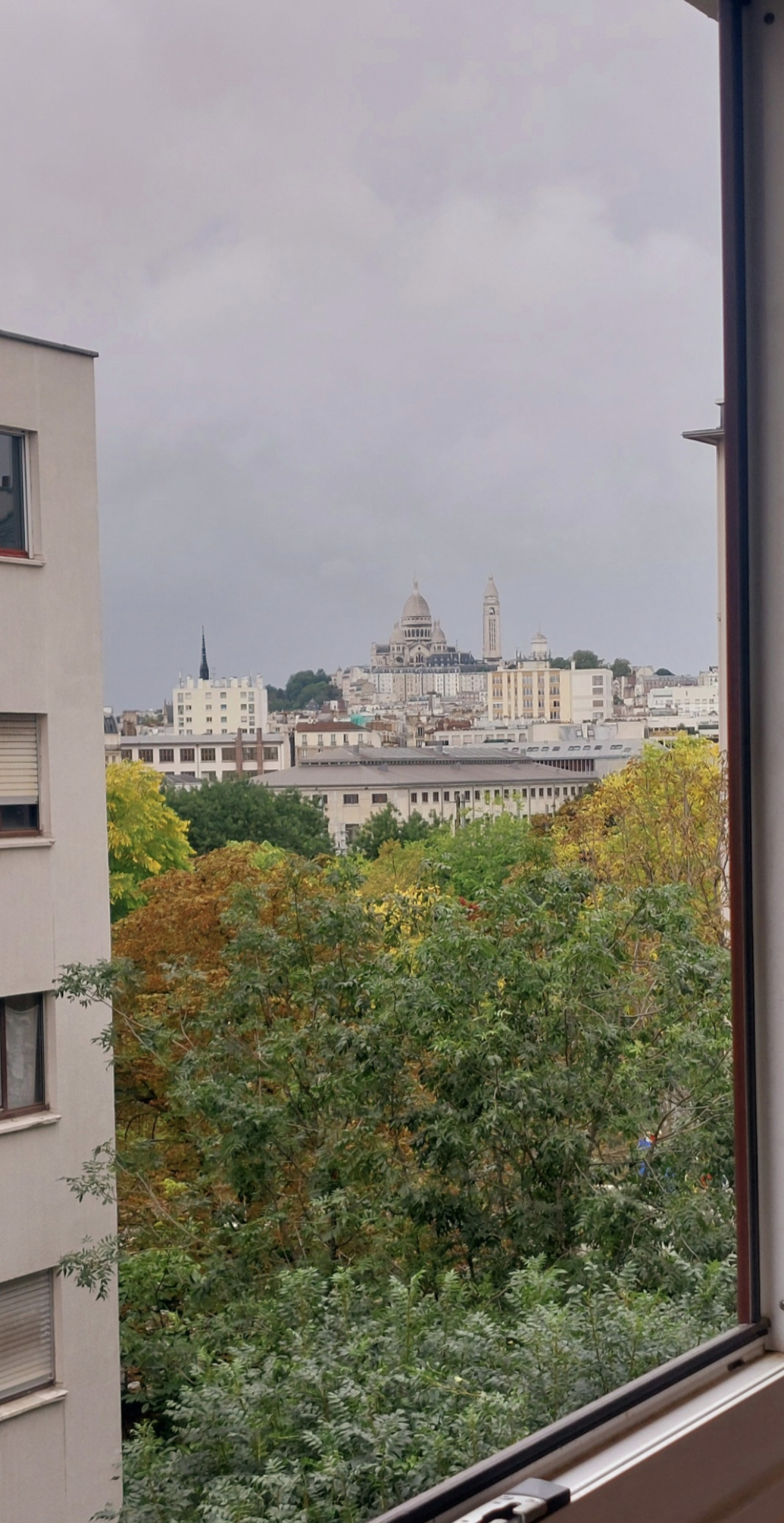 Très lumineux (grandes baies vitrées) et calme (donnant sur le jardin intérieur de la résidence). Vue sur le Sacré Cœur depuis le salon et la chambre.