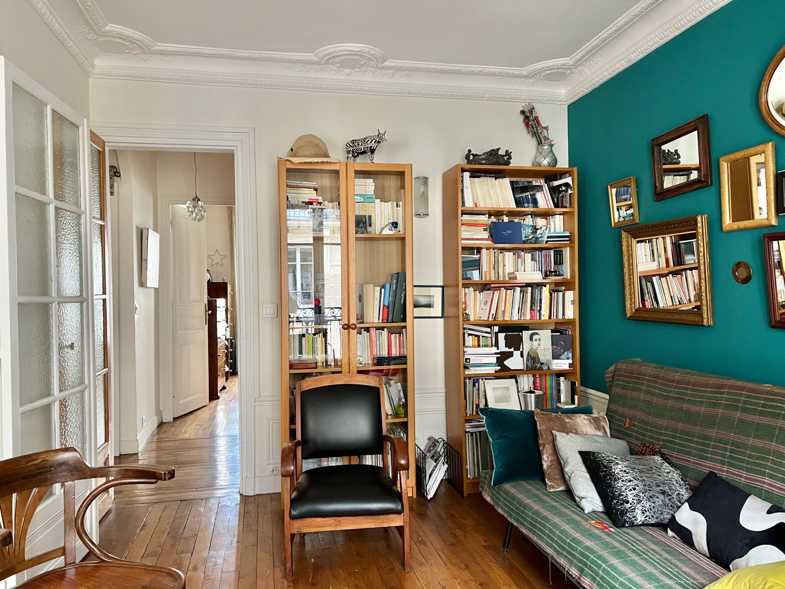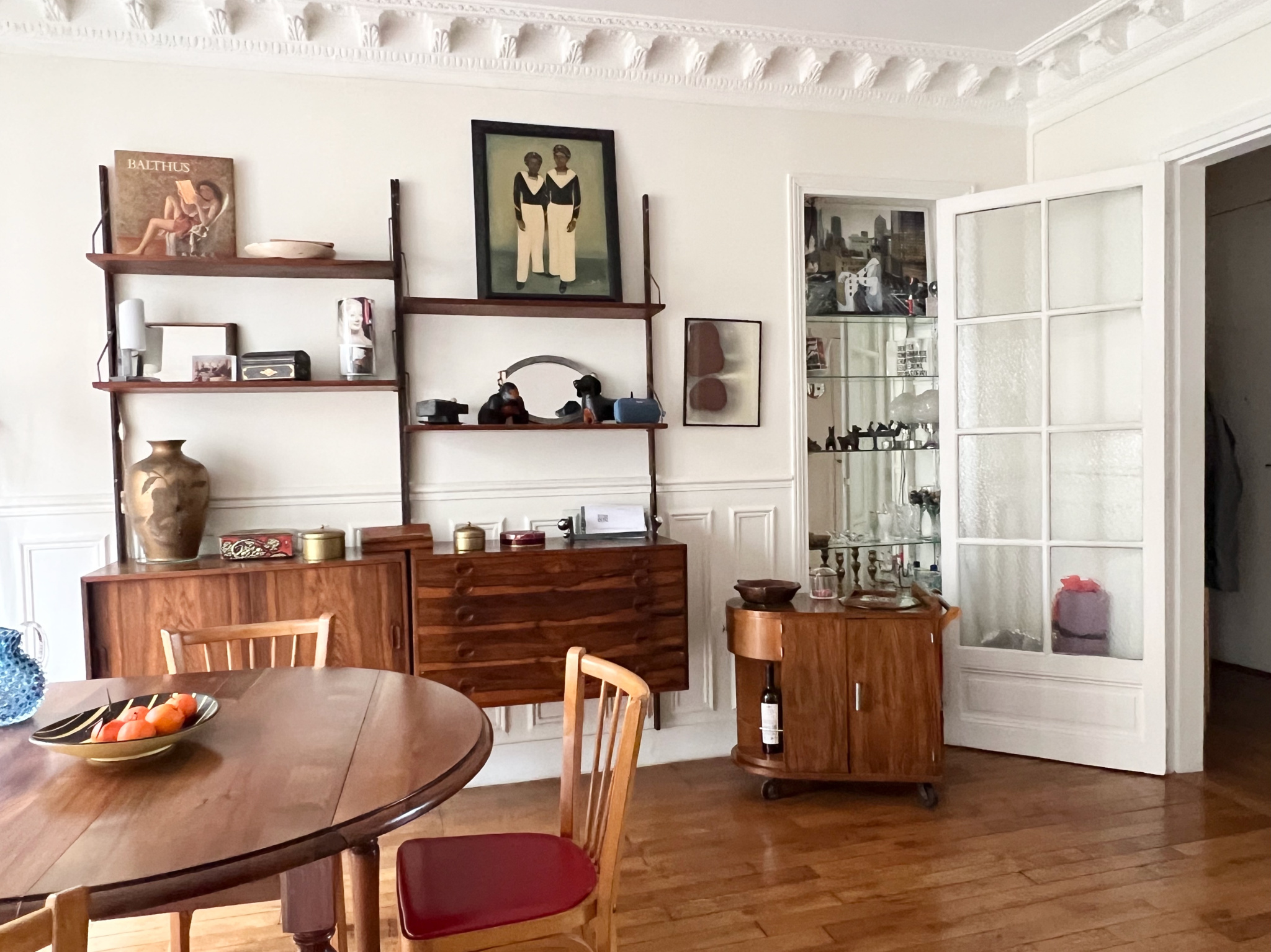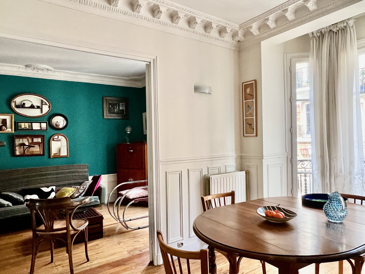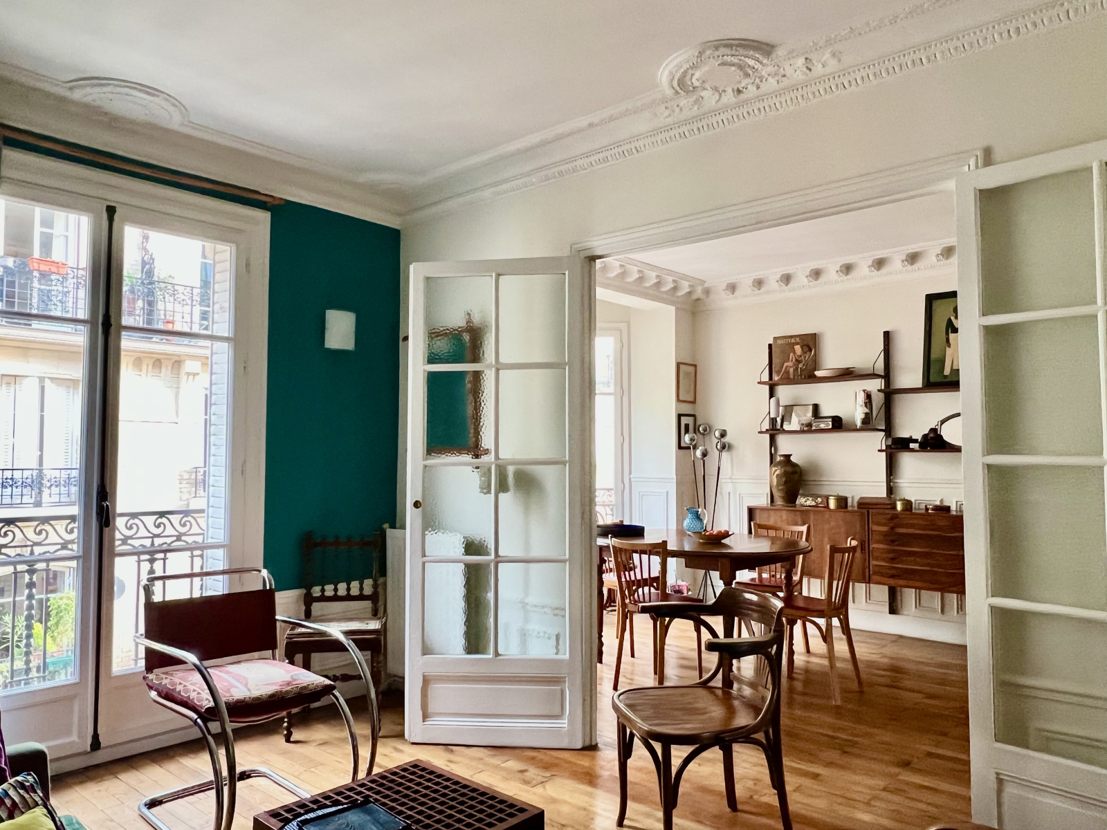 La salle à manger et le salon correspondent à un double séjour sur rue avec un bow-window. Parquet, moulures, boiseries d’époque soigneusement conservés