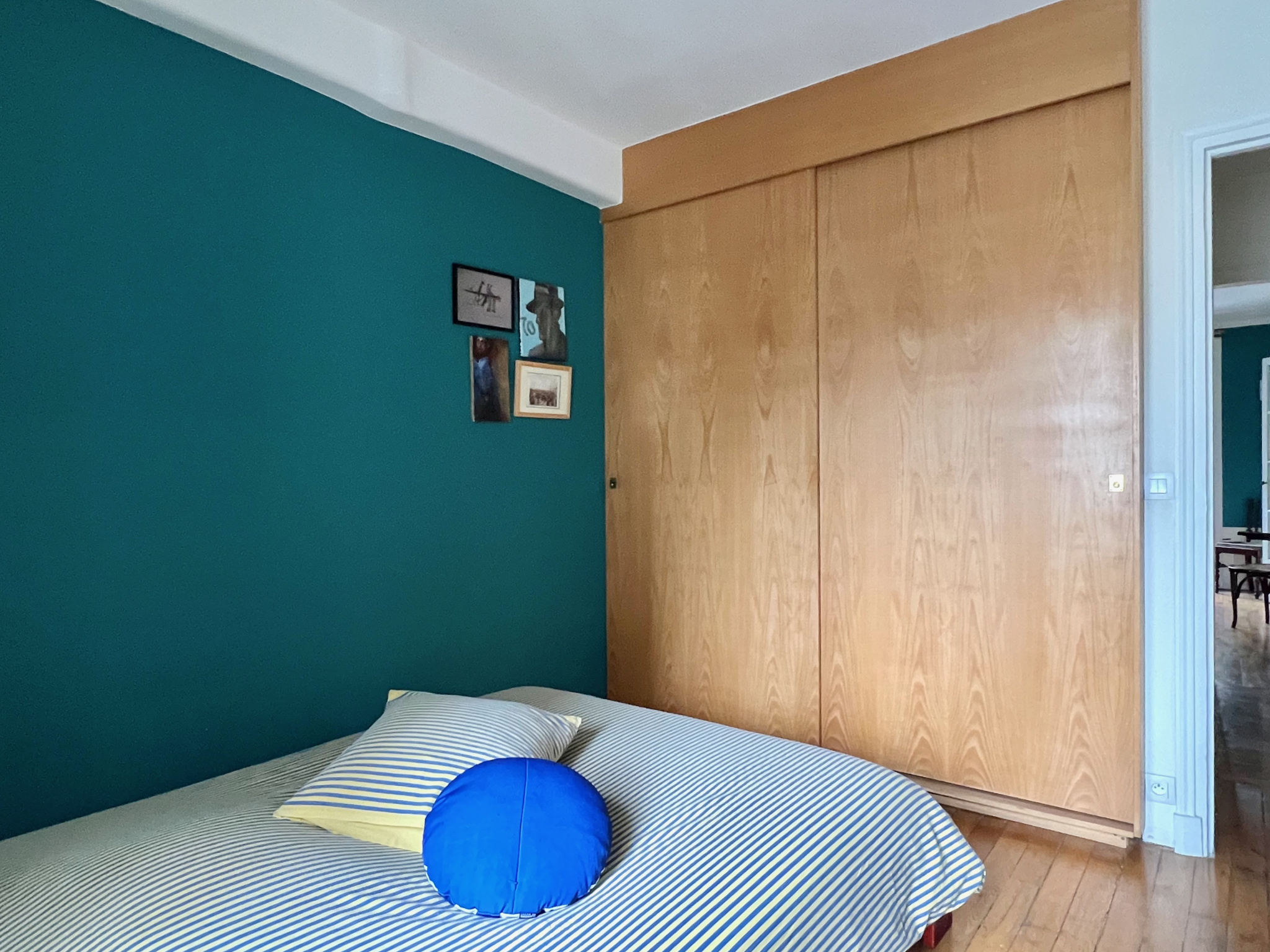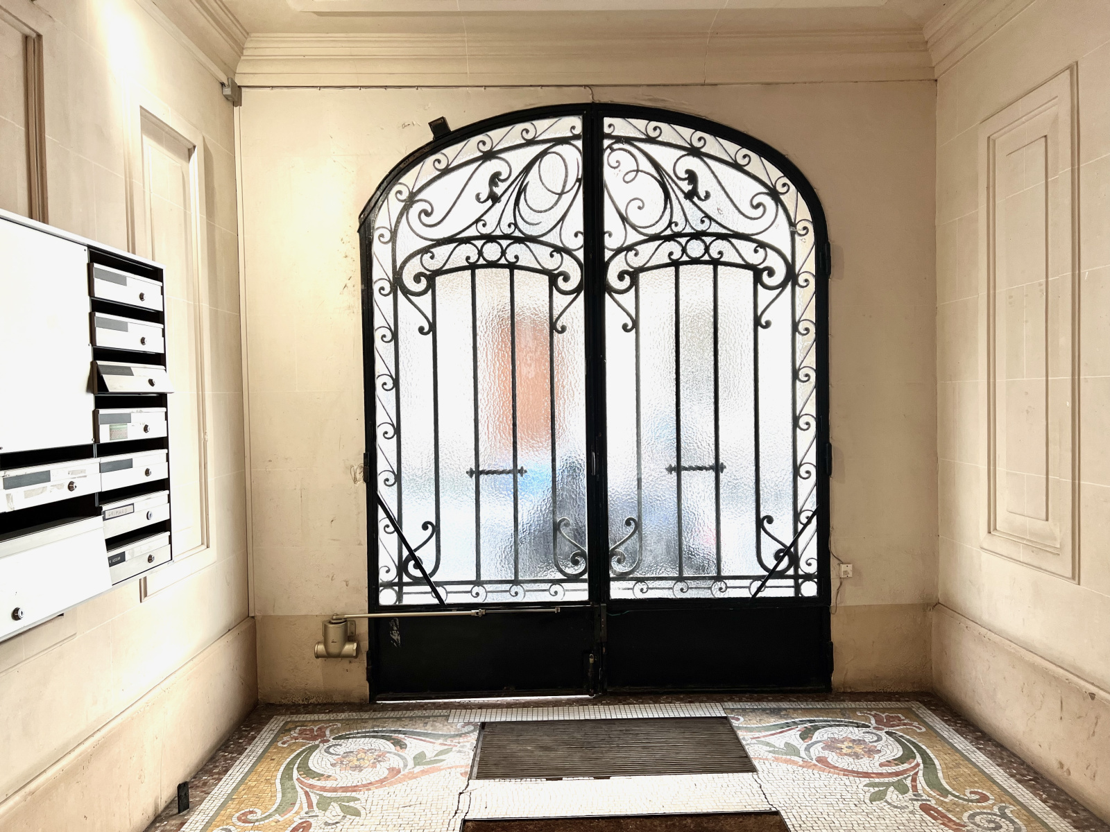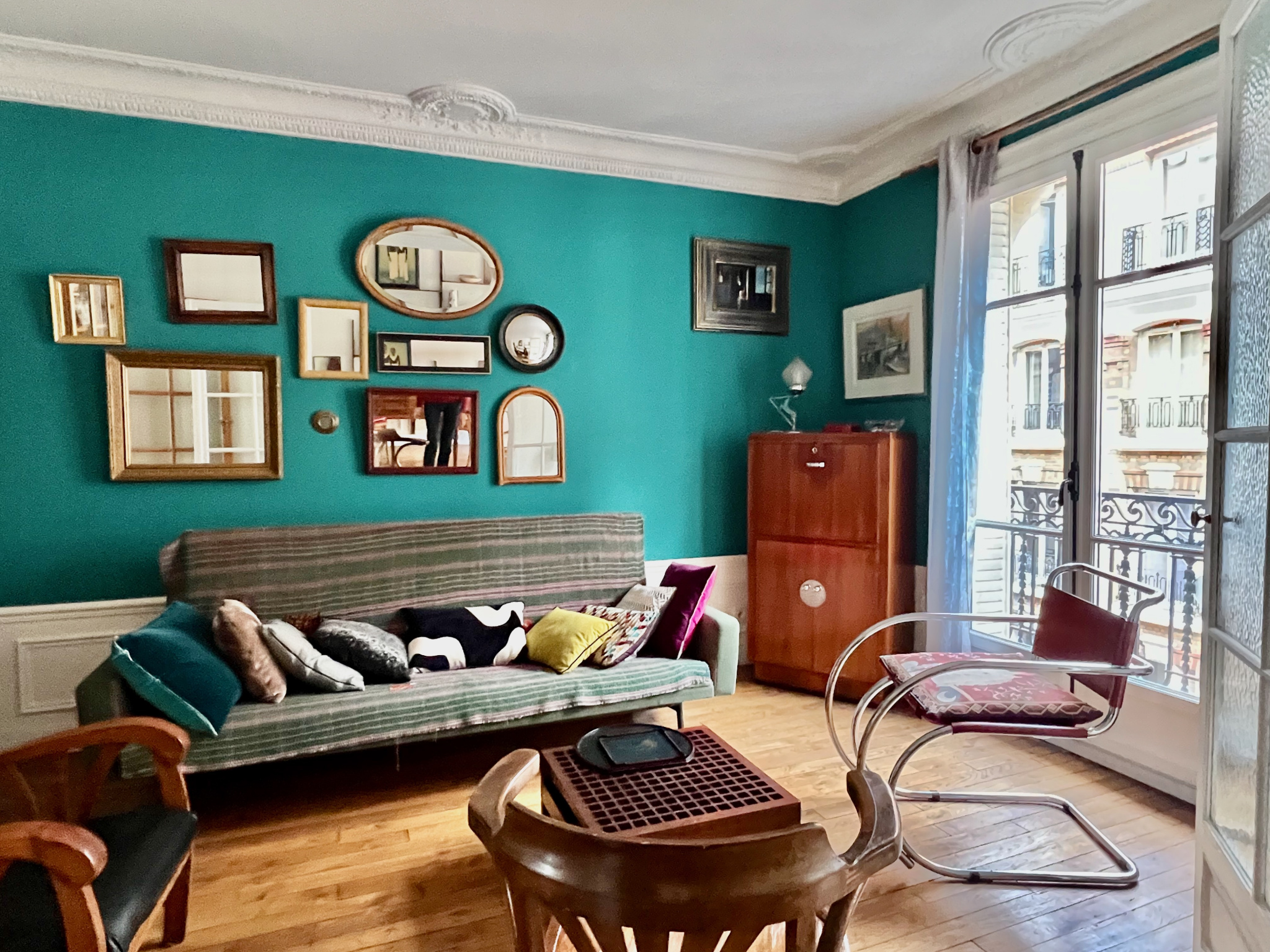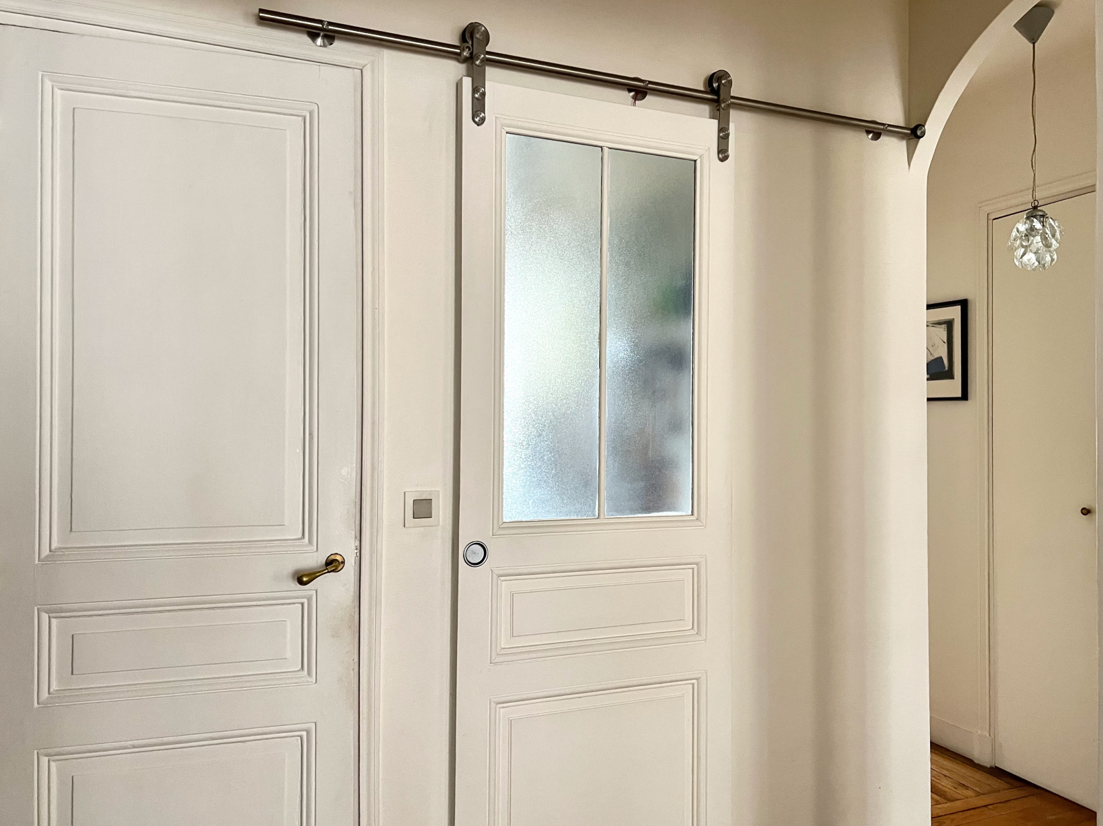 La salle à manger et le salon correspondent à un double séjour sur rue avec un bow-window. Parquet, moulures, boiseries d’époque soigneusement conservés
