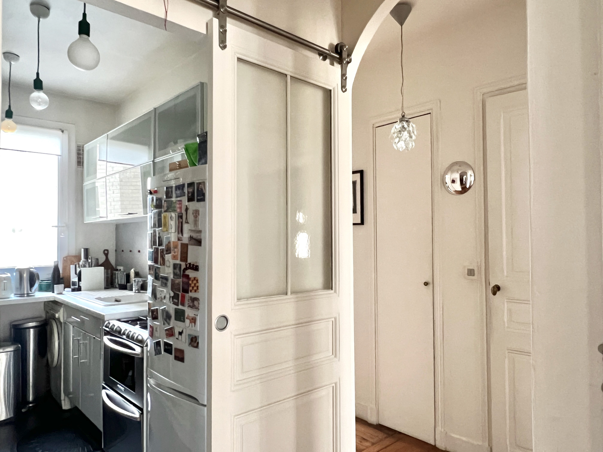 Idéalement situé entre les métros Gambetta (310 m) et Pelleport (100 m, au cœur d’un quartier recherché (marché de la rue de la Chine, tous commerces, cafés, restaurants, cinéma ) dans une jolie rue pavée typique du 20ème arrondisst . Au 4ème étage avec ascenseur d’un bel immeuble de 1912, cet appartement lumineux (parquet, moulures, boiseries d’époque soigneusement conservés) est traversant Sud-Ouest / Nord-Est. Son agencement est fonctionnel (nombreux rangements sur mesure qui optimisent chaque espace) et la décoration dans l’"air du temps". Il comprend : une entrée avec couloir, un double séjour sur rue avec bow-window, une petite cuisine indépendante aménagée sur mesure et équipée, une chambre avec grand placard-dressing, une salle d’eau avec douche à l’italienne, et des toilettes séparées. Les pièces sur cour (dont la chambre) bénécient d’une vue dégagée garantissant calme et luminosité. Une cave complète le bien.Charges mensuelles : 197,85 € Chauffage. ind.gaz.