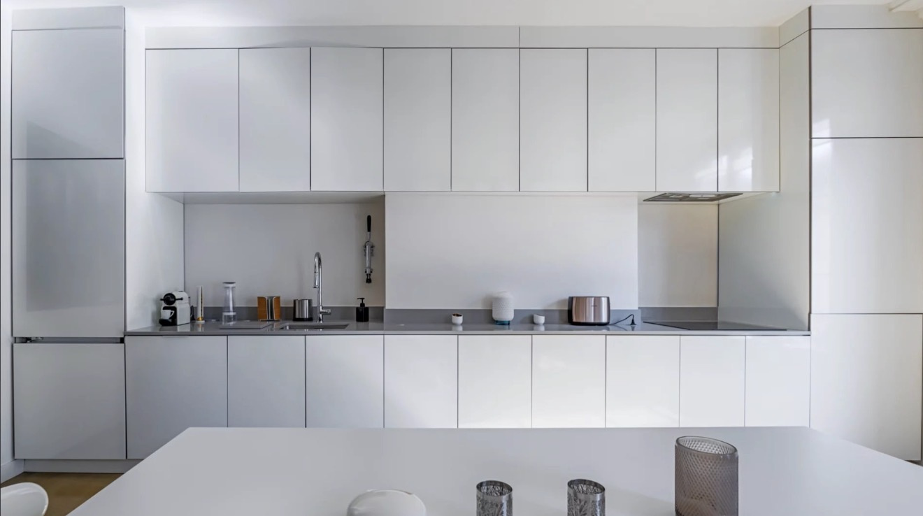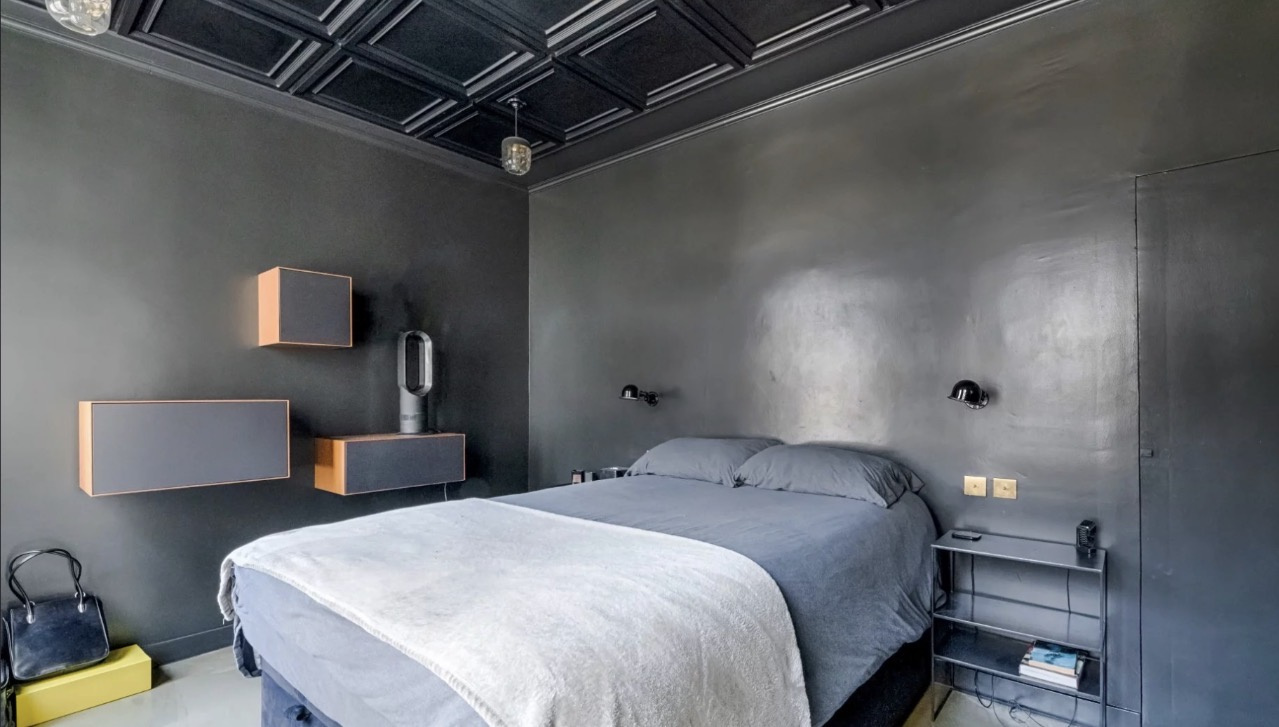 L’appartement est doté d’un sol en béton ciré sur toute sa surface, offrant une sensation d’espace continue, à la fois moderne et chaleureuse.