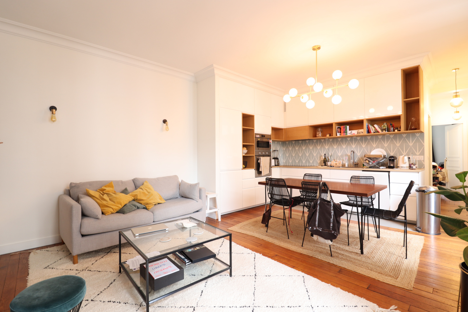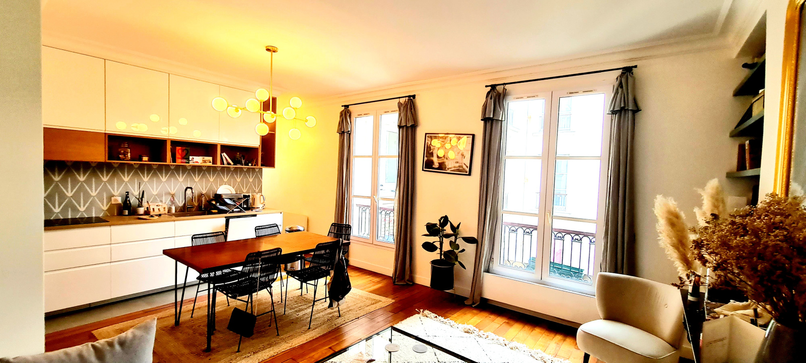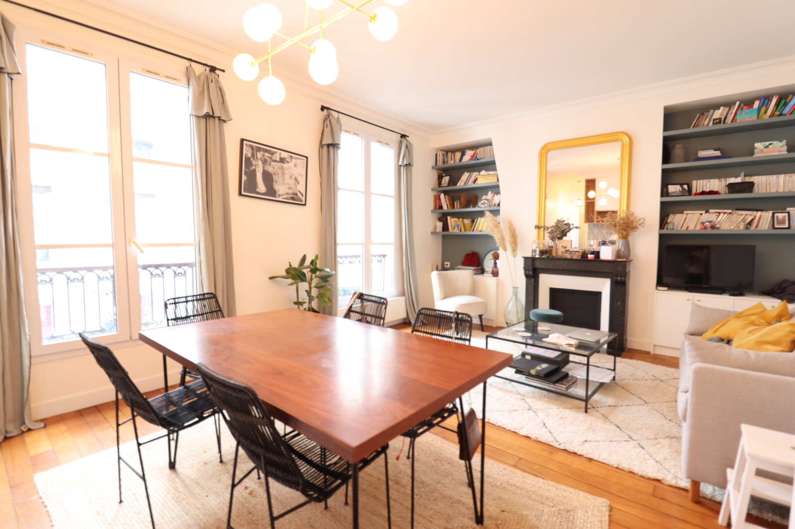 XVIIIème: Goutte d'Or- Square Léon :Dans un bel immeuble ancien, sur une grande cour au calme, charmant 3 pièces traversant et lumineux, d'environ 55m²,au 3ème étage sans ascenseur, avec une belle hauteur sous plafond.Il se compose d'un grand séjour de 25 m2 environ,d' une grande cuisine équipée ouverte ,de 2 chambres, d'une salle de bains, d'un wc.Placards,dressings sur mesure, double vitrage, parquet, moulures, cheminée, porte blindée. Rénové entièrement par architecte avec des matériaux de qualité.Une grande cave de 6 m² complète ce bien. Local à vélo, interphone.Métro Barbès- Rochechouart .Charges annuelles 1600 €, (2 lots). Honoraires 1% charge acquéreur (RSAC 352137756- Paris)