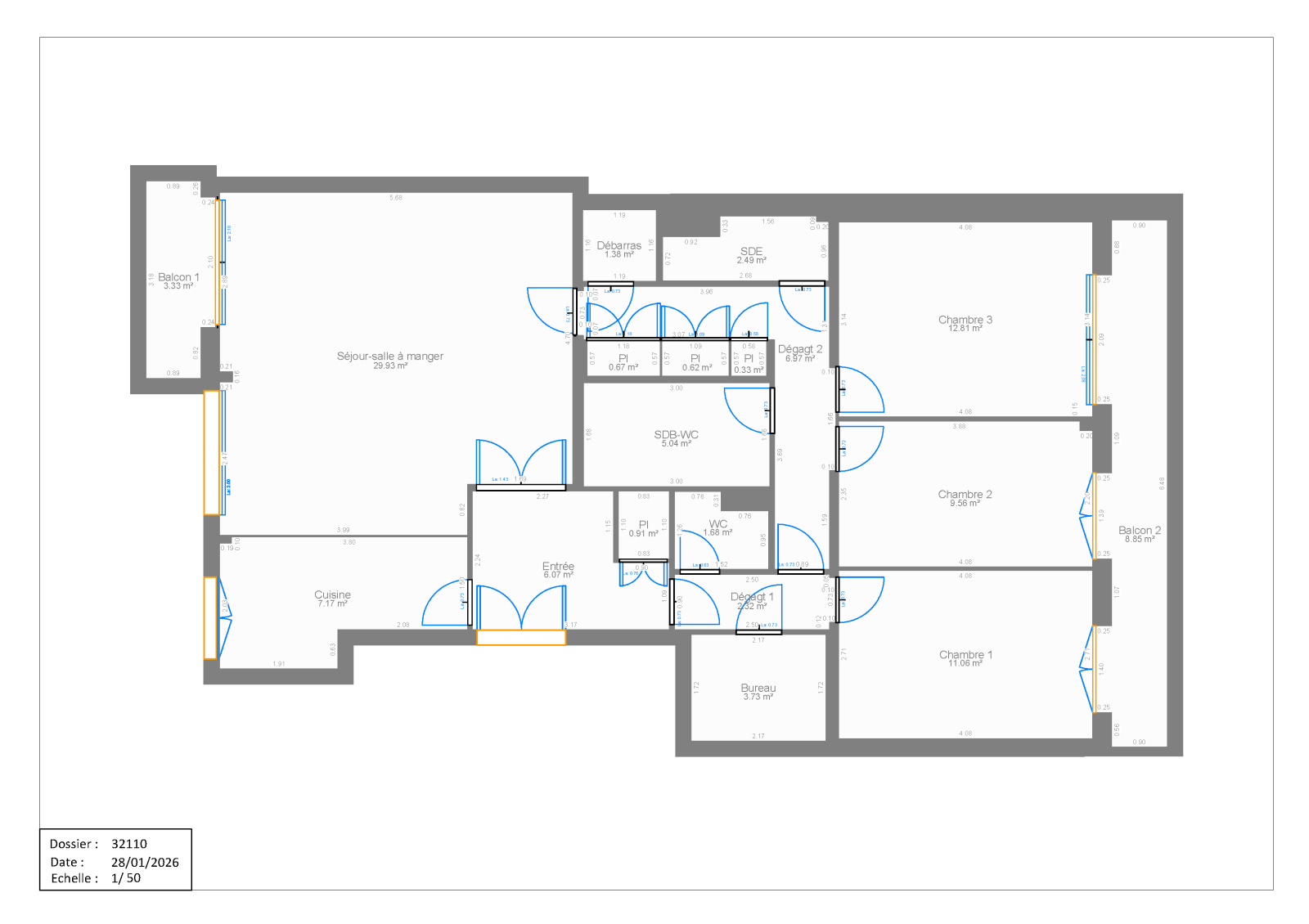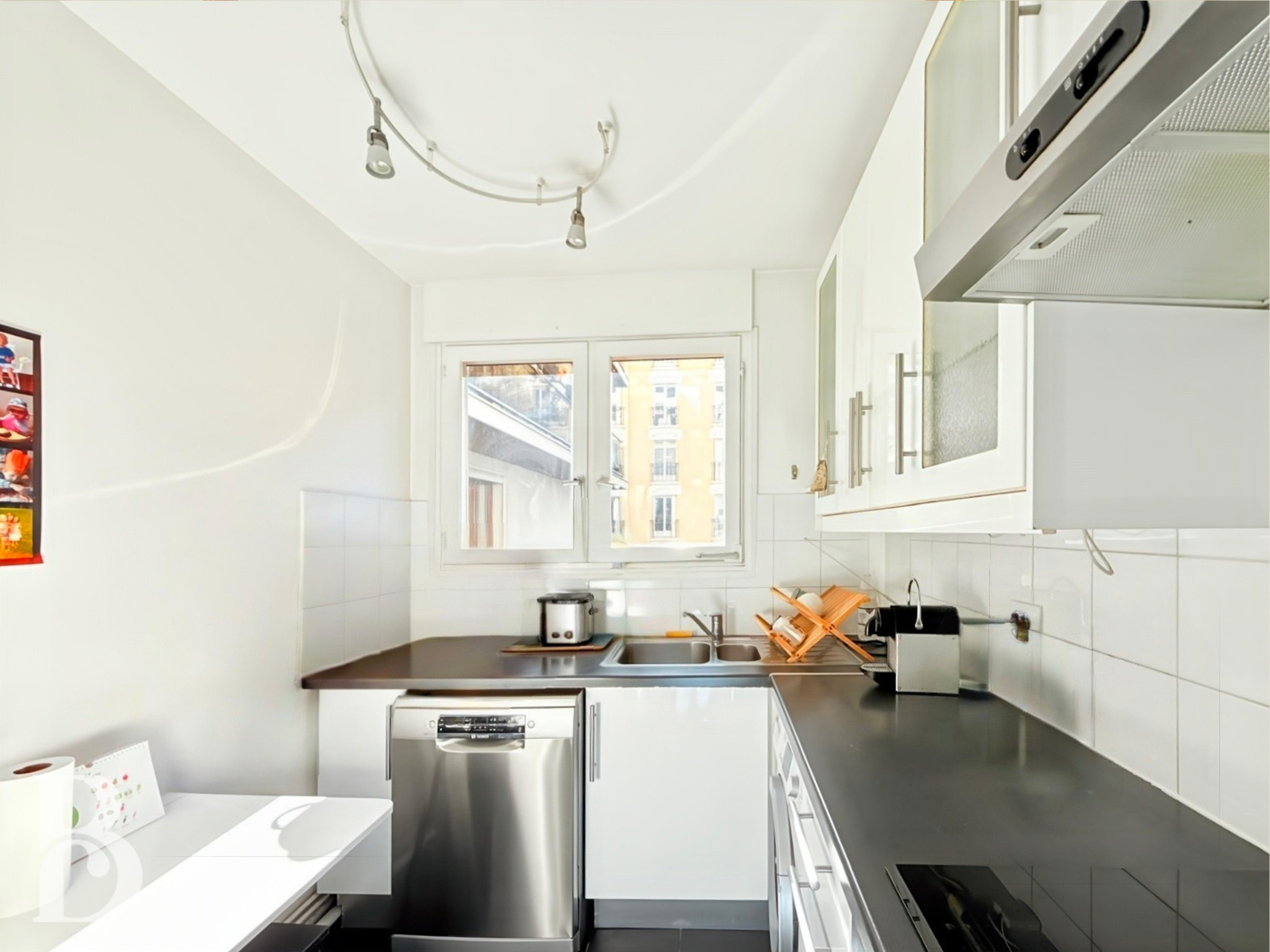 Une entrée spacieuse donne accès à un séjour exposé sud/ouest, prolongé par un balcon donnant sur le jardin de la copropriété, en retrait de la rue. La cuisine attenante, actuellement séparée, peut être réunie avec le séjour pour offrir une superficie d'environ 40 m2.