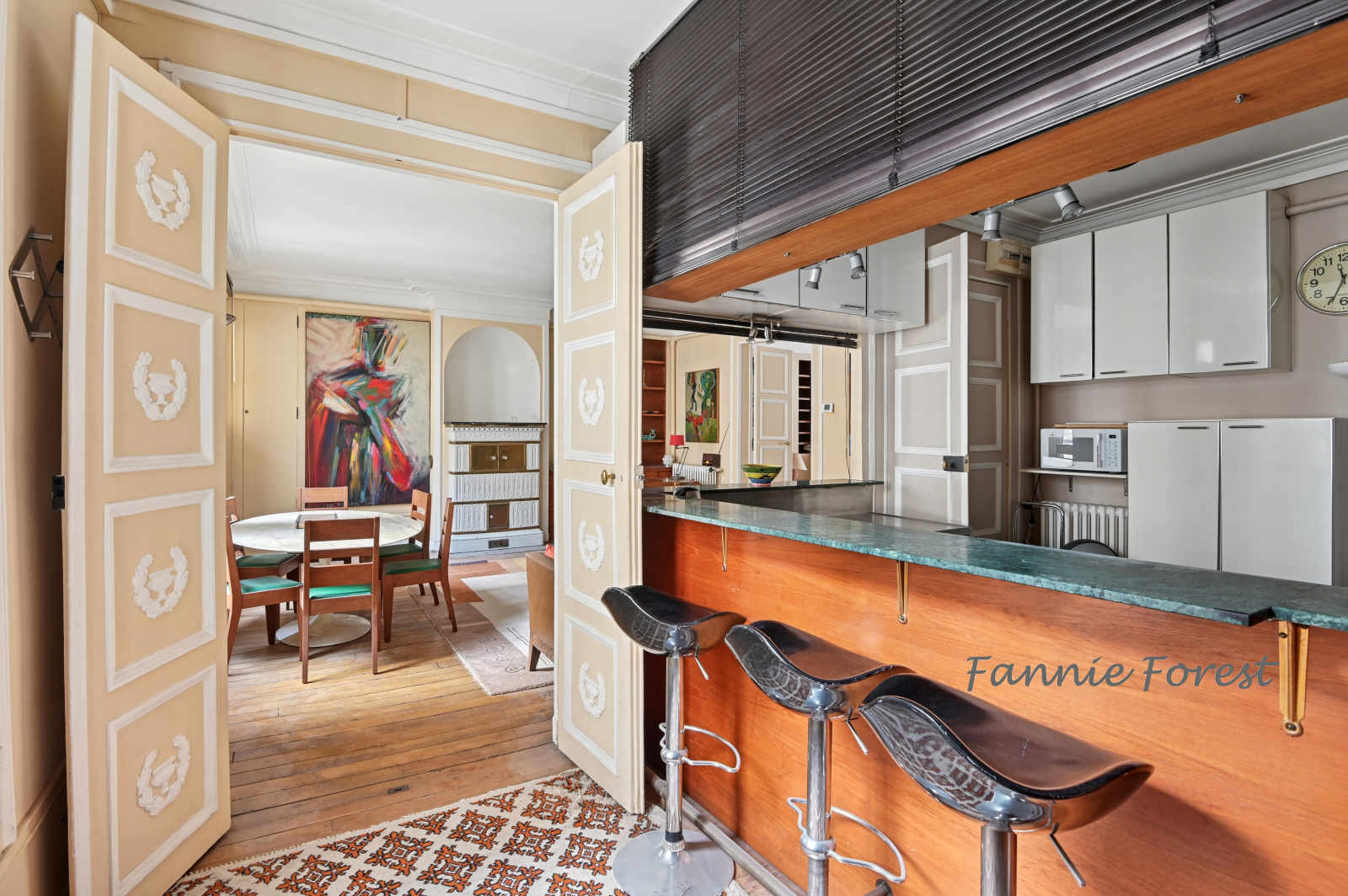 L’appartement conserve de très beaux éléments d’époque, avec un charme de l’ancien au style prussien, un parquet en pointes de Hongrie, et une hauteur sous plafond appréciable.