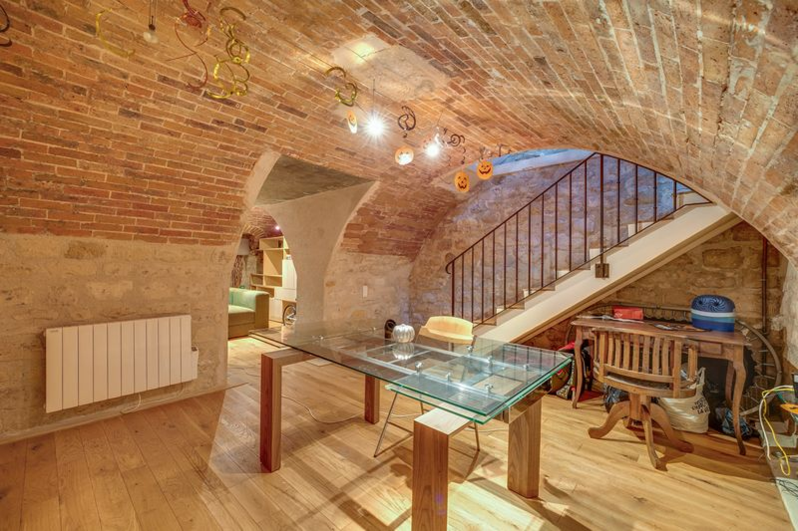 En sous-sol, un bel espace voûté accueille actuellement une grande chambre, des rangements et une salle de jeux. Modulable selon les besoins : bureau, espace indépendant, salle TV ou studio.