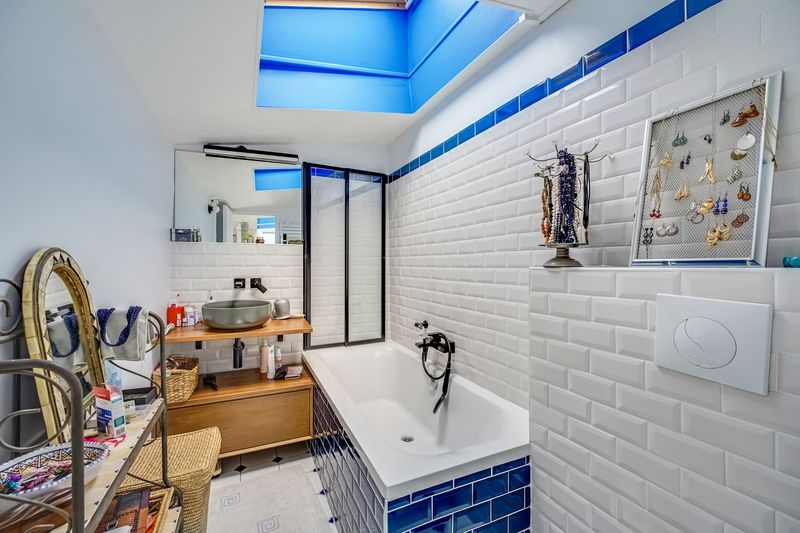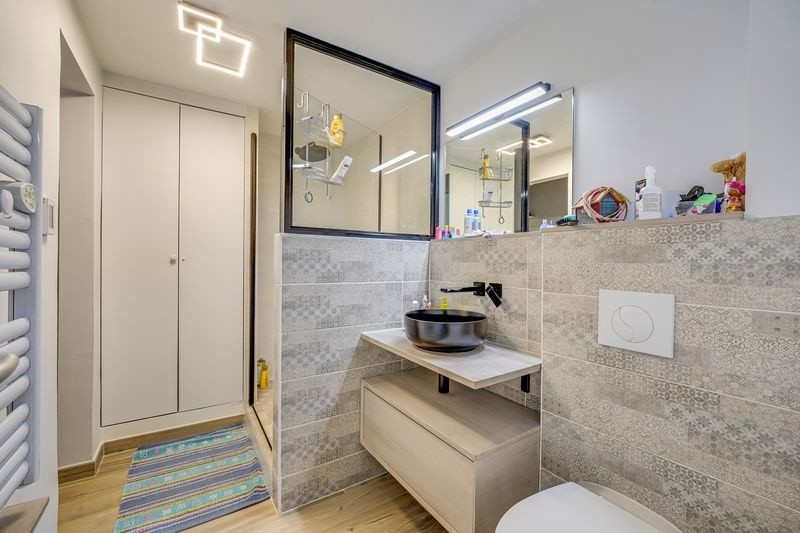 Une grande salle de bain lumineuse, une salle de douche ainsi que deux WC complètent ce bien.