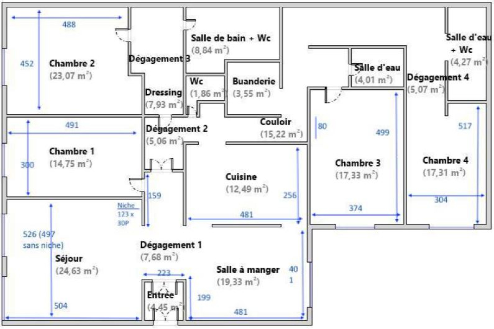 L’appartement propose 7 pièces dont 4 chambres, accompagnées de plusieurs salles de bains et salle d’eau, un dressing, de nombreux rangements intégrés ainsi qu’une buanderie. L’ensemble est en excellent état, prêt à vivre. Une double cave (20m²)