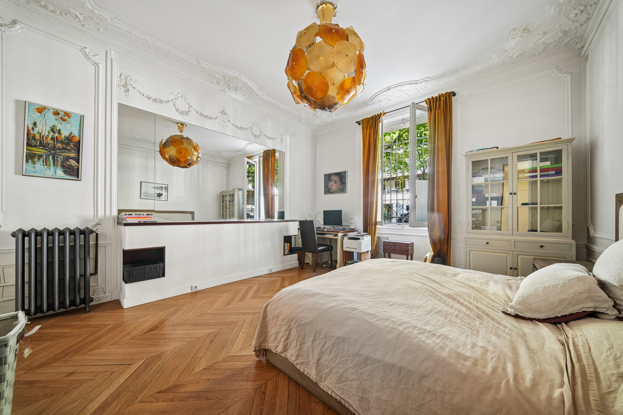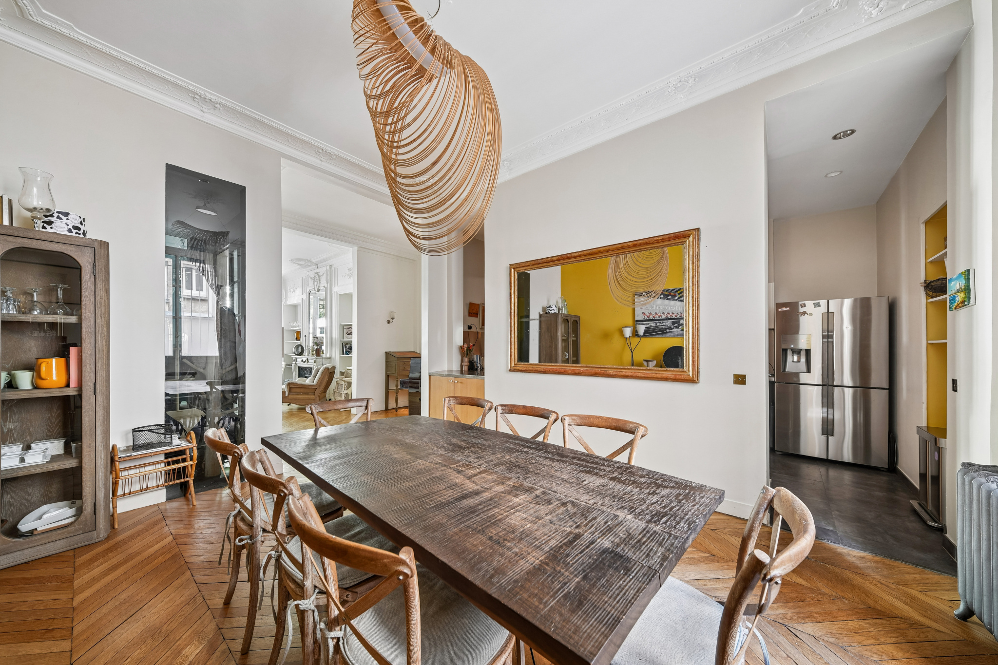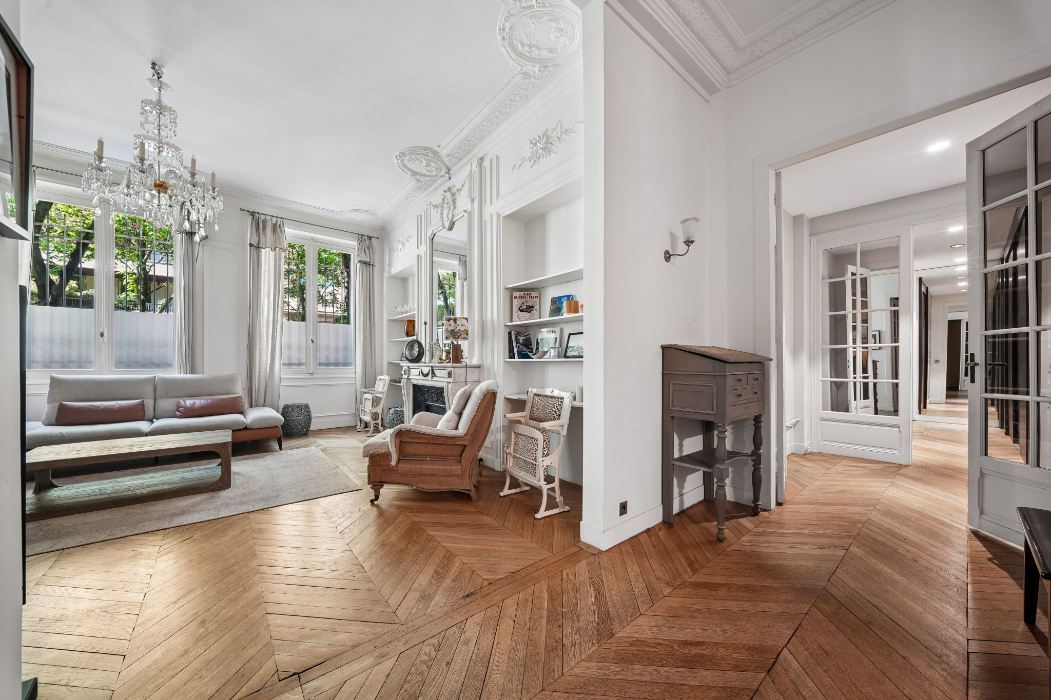 Dès l’entrée, les volumes impressionnent : 3,60 m de hauteur sous plafond, une distribution fluide et élégante, espace optimisé, sublimé par les codes du classique parisien, parquet, moulures et cheminées. La très belle luminosité pour un rez-de-chaussée, valorise chaque espace.