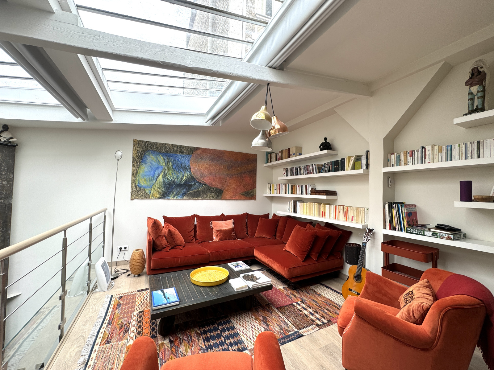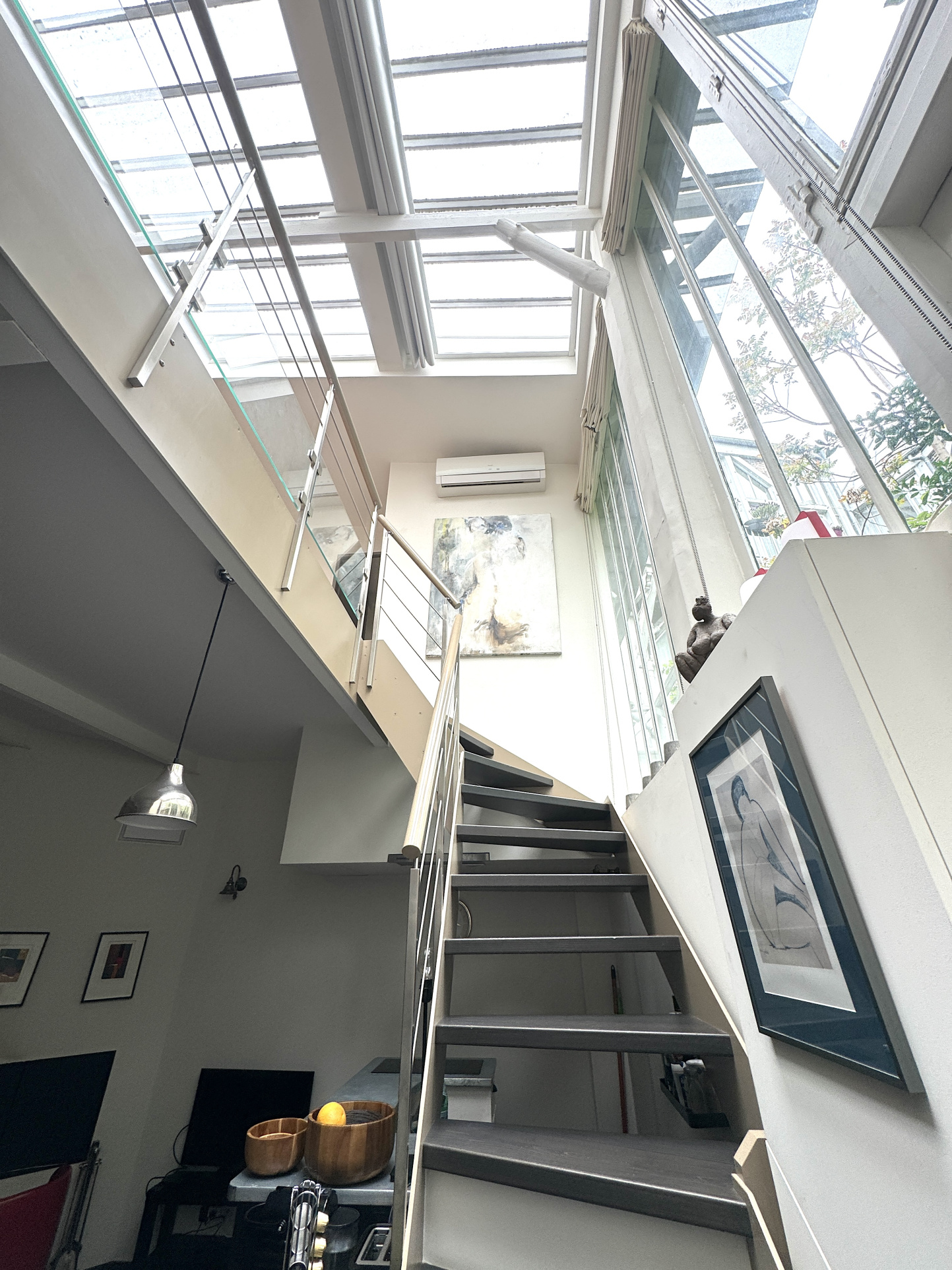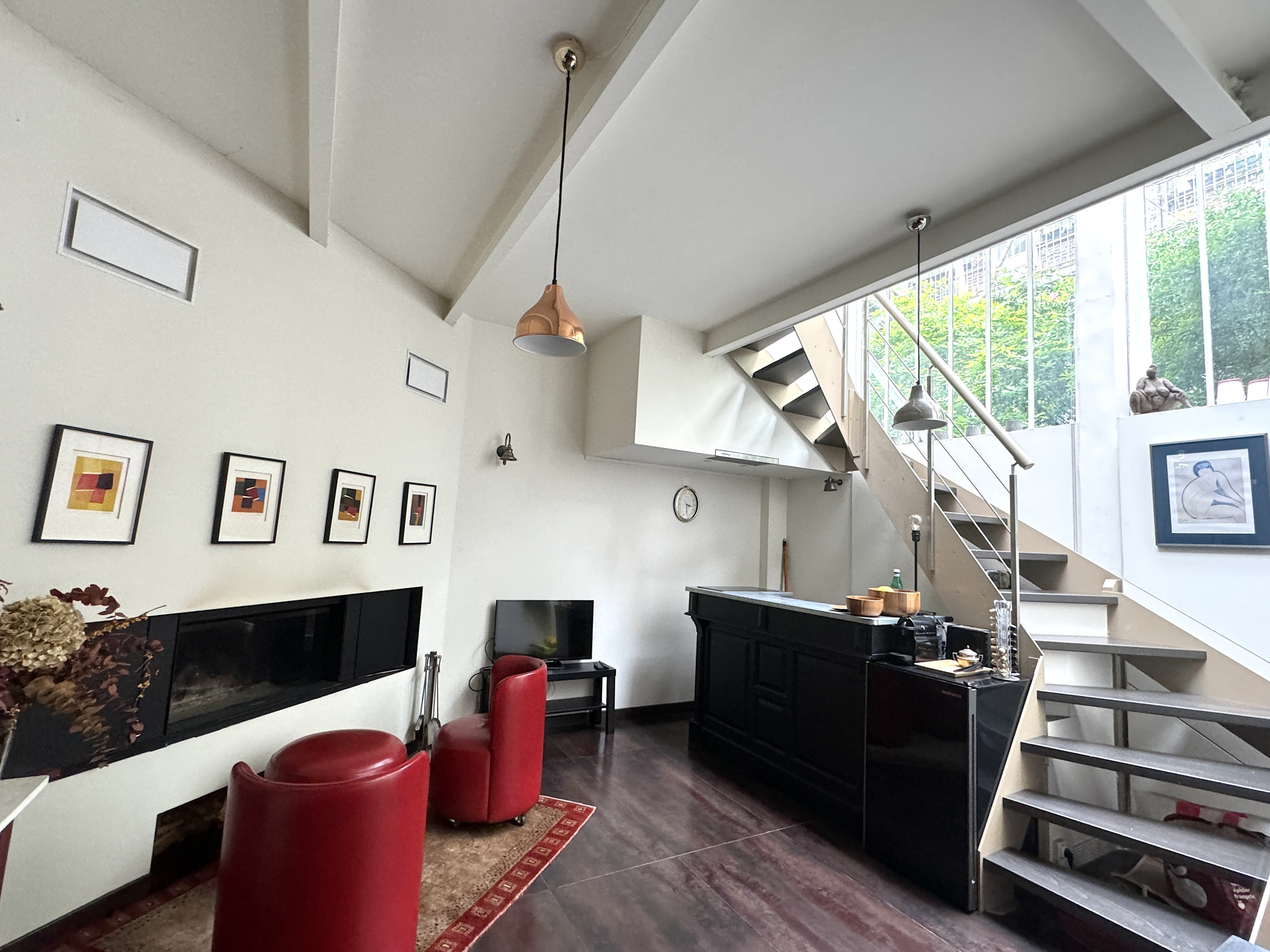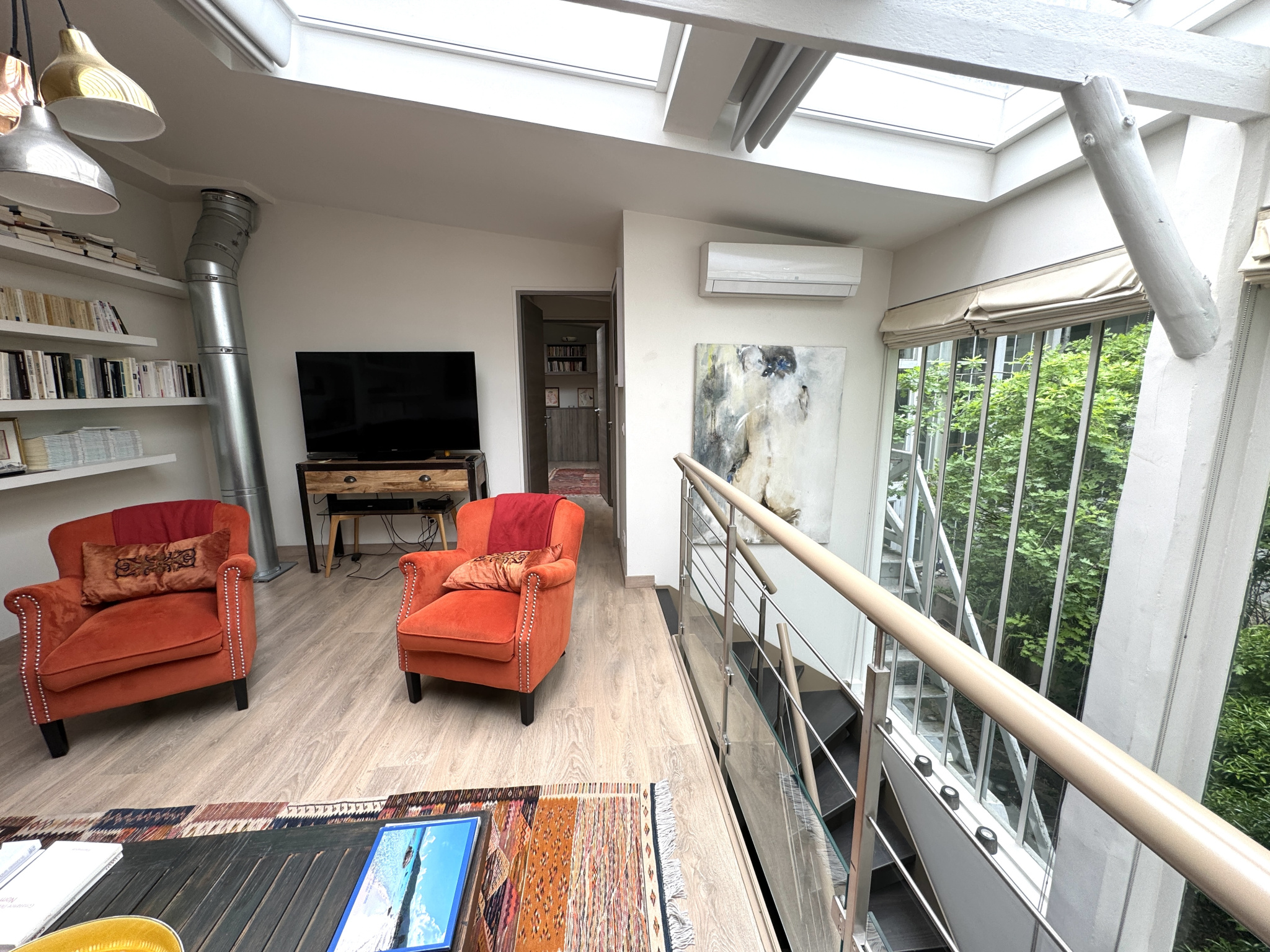 Cet atelier lumineux transformé en logement duplex (67 m2) après une belle rénovation en 2016, a su conserver le cachet et la poésie du lieu. (chauffage au sol, climatisation)