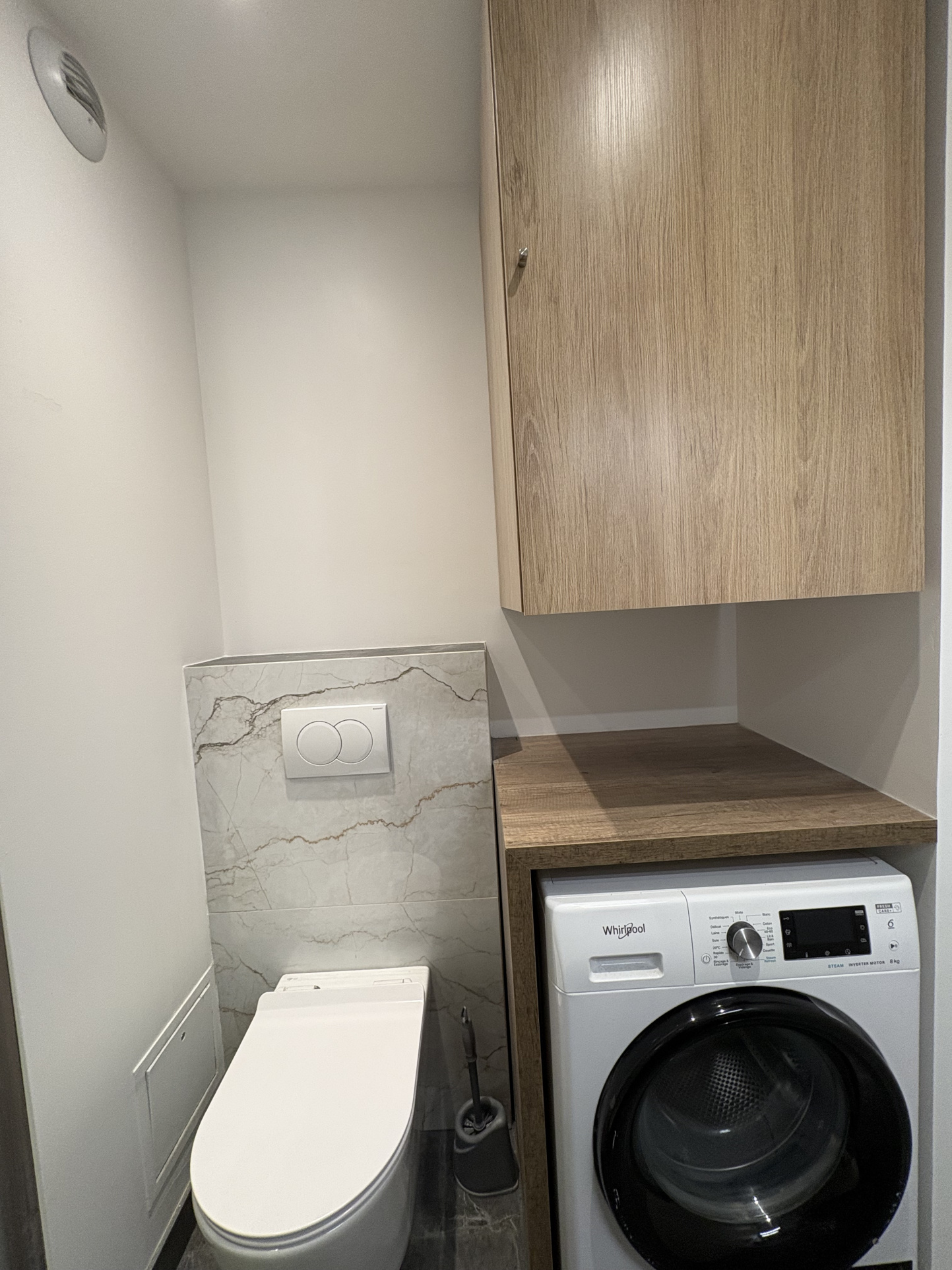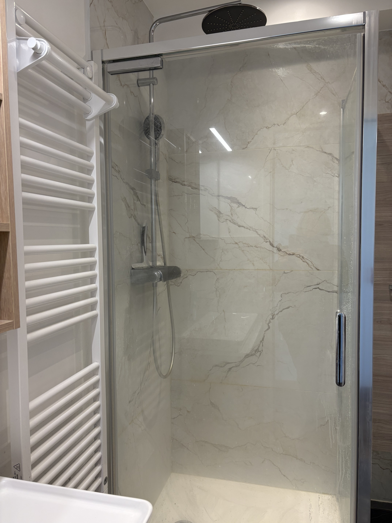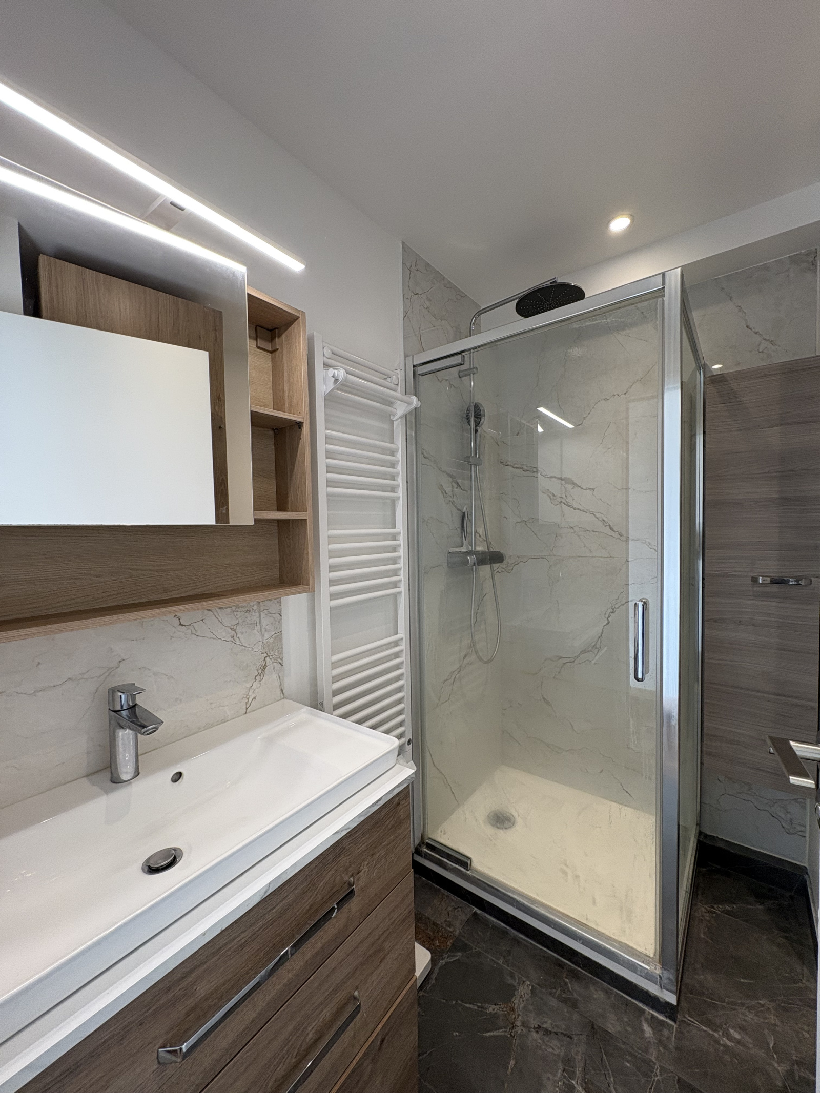 . Entrée desservant une salle d'eau optimisée : compacte et foncionnelle avec douche, lavabo et WC suspendu.
