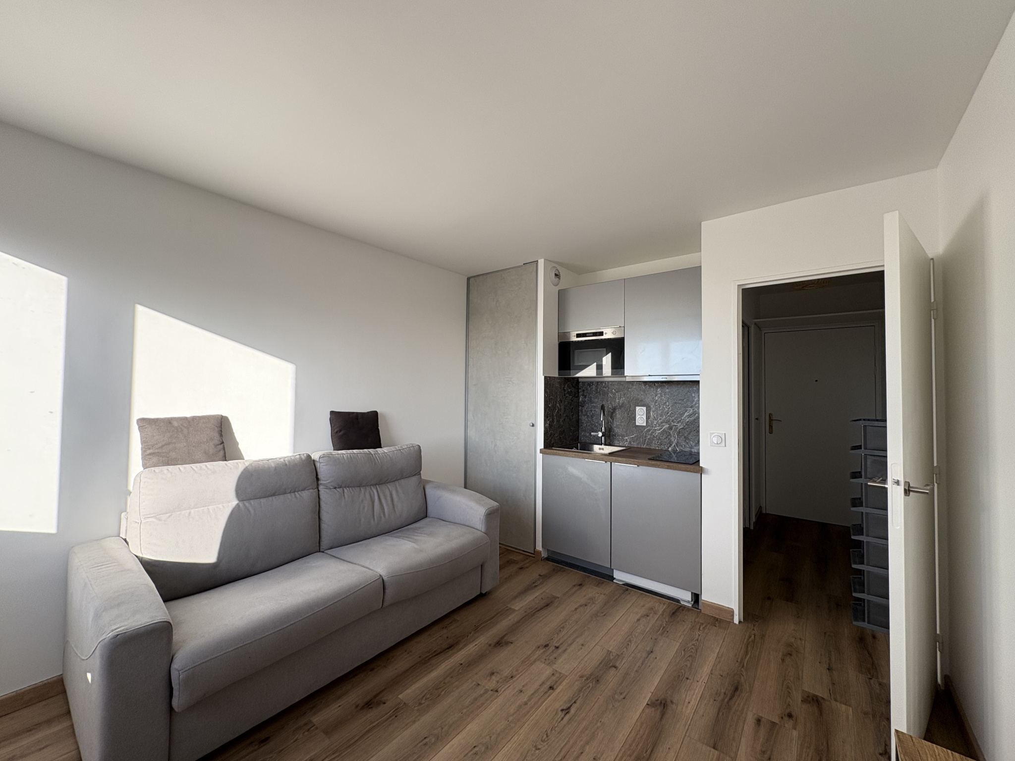 Situé au 6ème étage d'un immeuble avec ascenseur, venez découvrir ce charmant studio de 18,10m2 entièrement meublé et rénové avec goût, lumineux orienté plein Sud disposé comme suit :