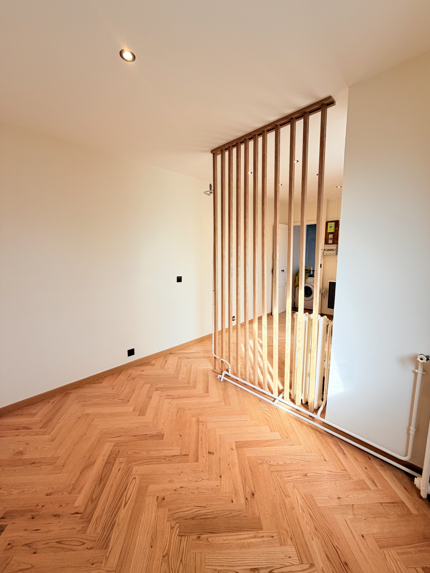 Le parquet en pointe de Hongrie unifie harmonieusement l’espace et lui confère un cachet élégant et chaleureux.