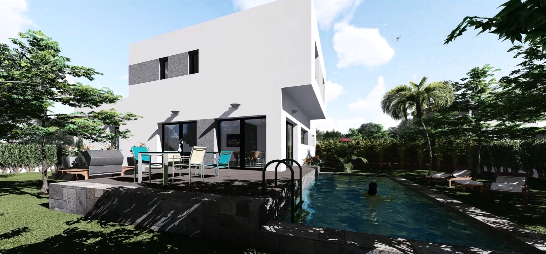 Projet d'une villa contemporaine de 120 m² avec une petite mitoyenneté partielle par le garage uniquement.