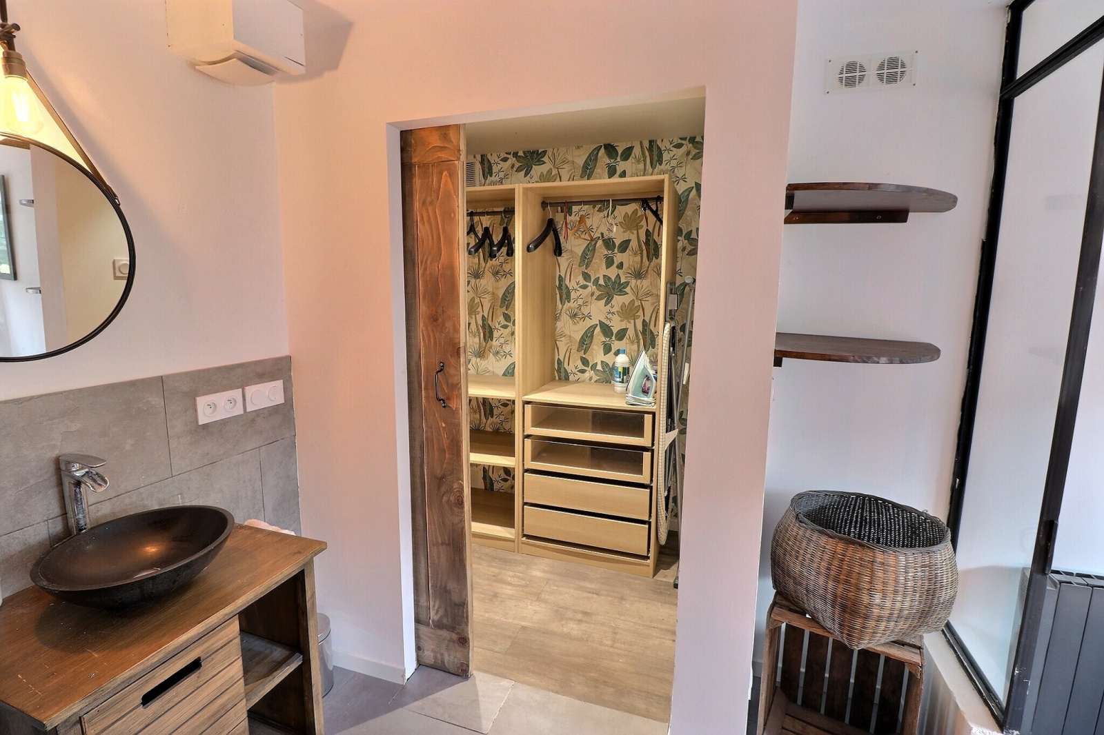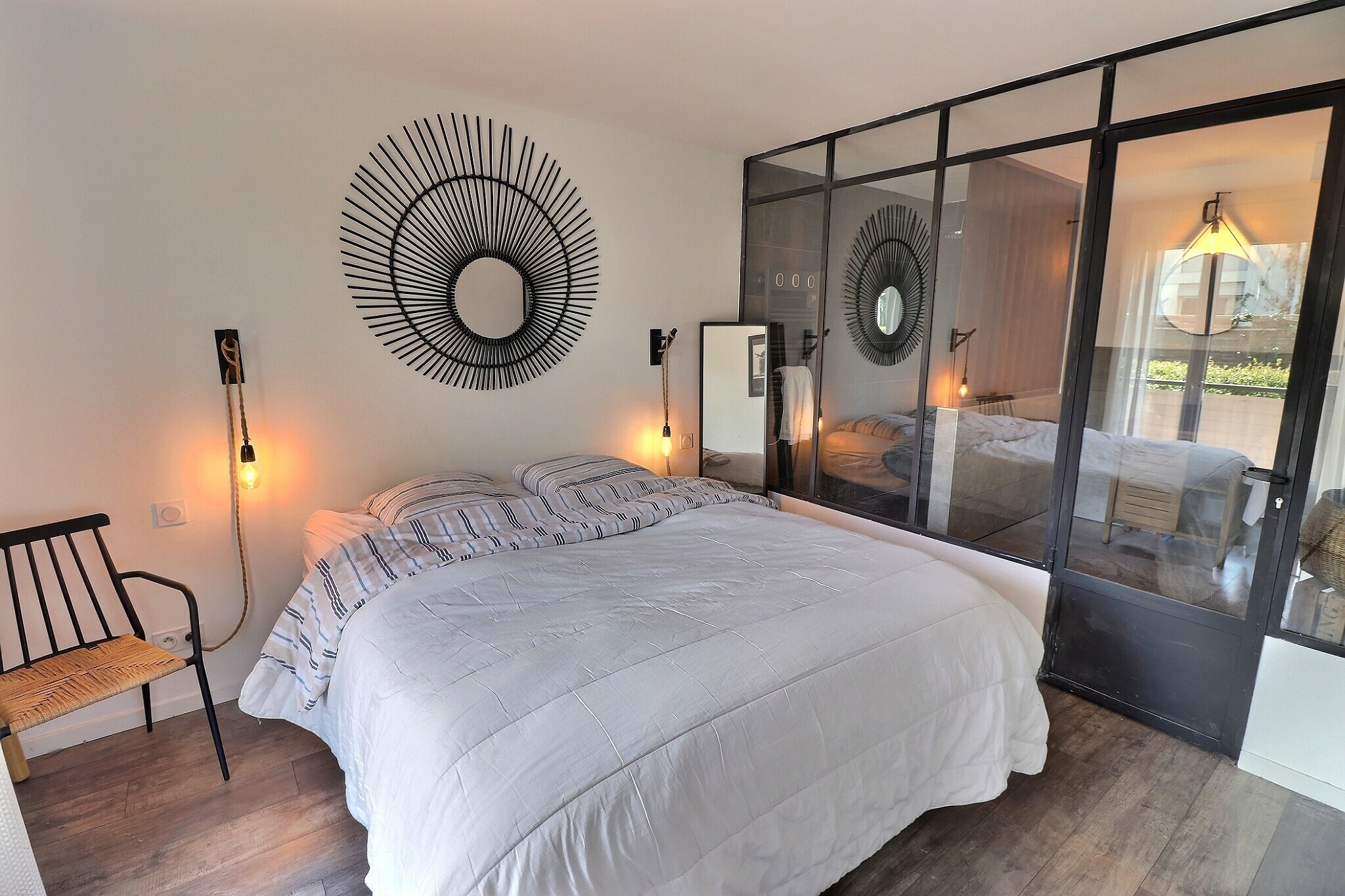 La chambre séduit immédiatement avec sa verrière type atelier, apportant style et luminosité. Un dressing aménagé complète cet espace, pensé pour un quotidien fluide et organisé.