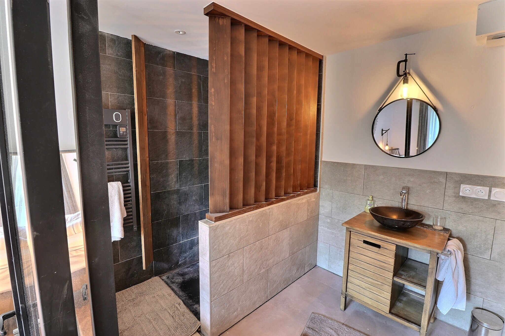 Verrière, douche à l’italienne, matériaux contemporains, ambiance soignée, dressing attenant : rien à modifier.