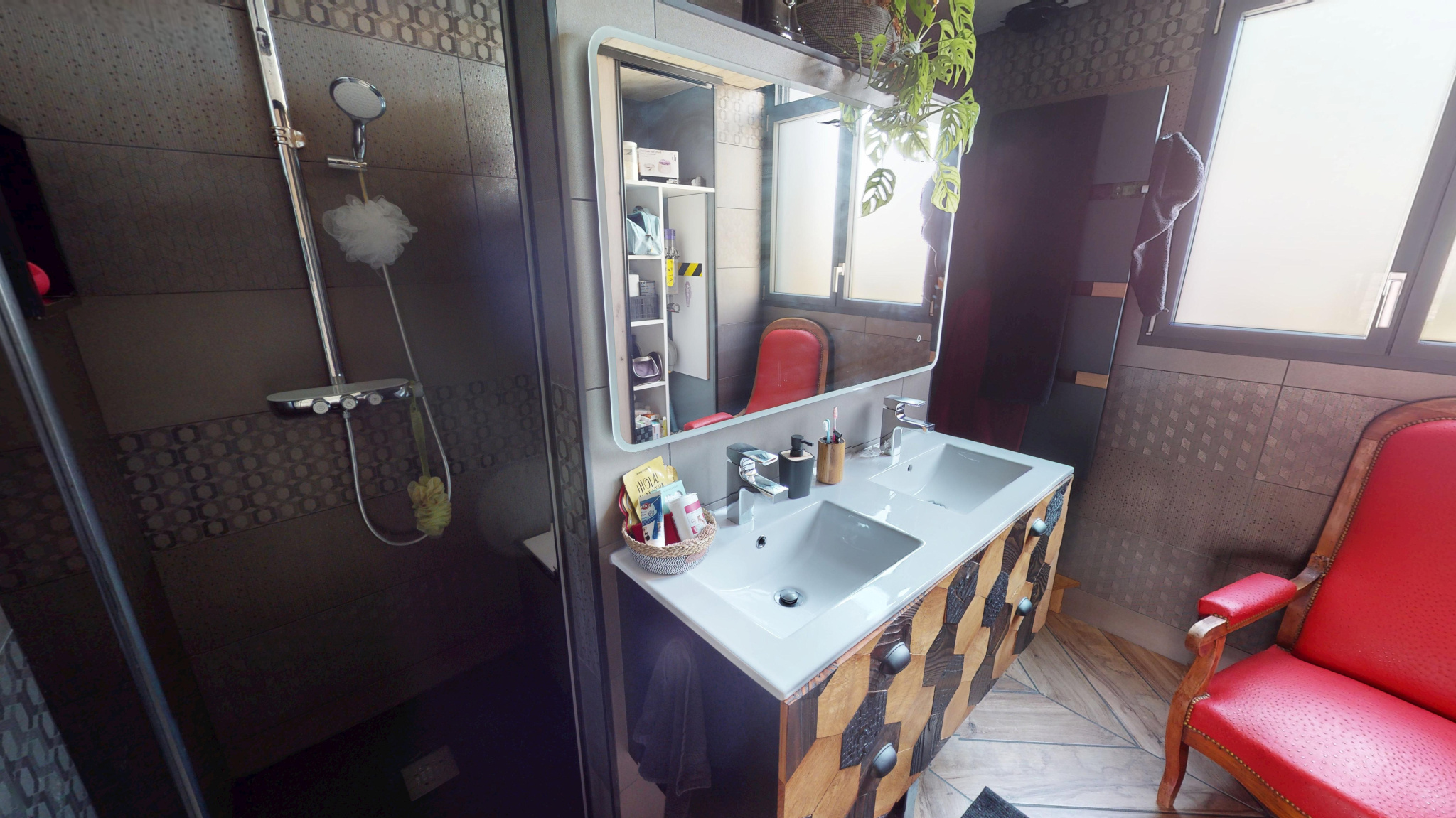 La cage d’escalier est sublimée par une magnifique fresque artistique signée Valoushka, véritable œuvre d’art qui confère une identité unique et contemporaine à la maison.