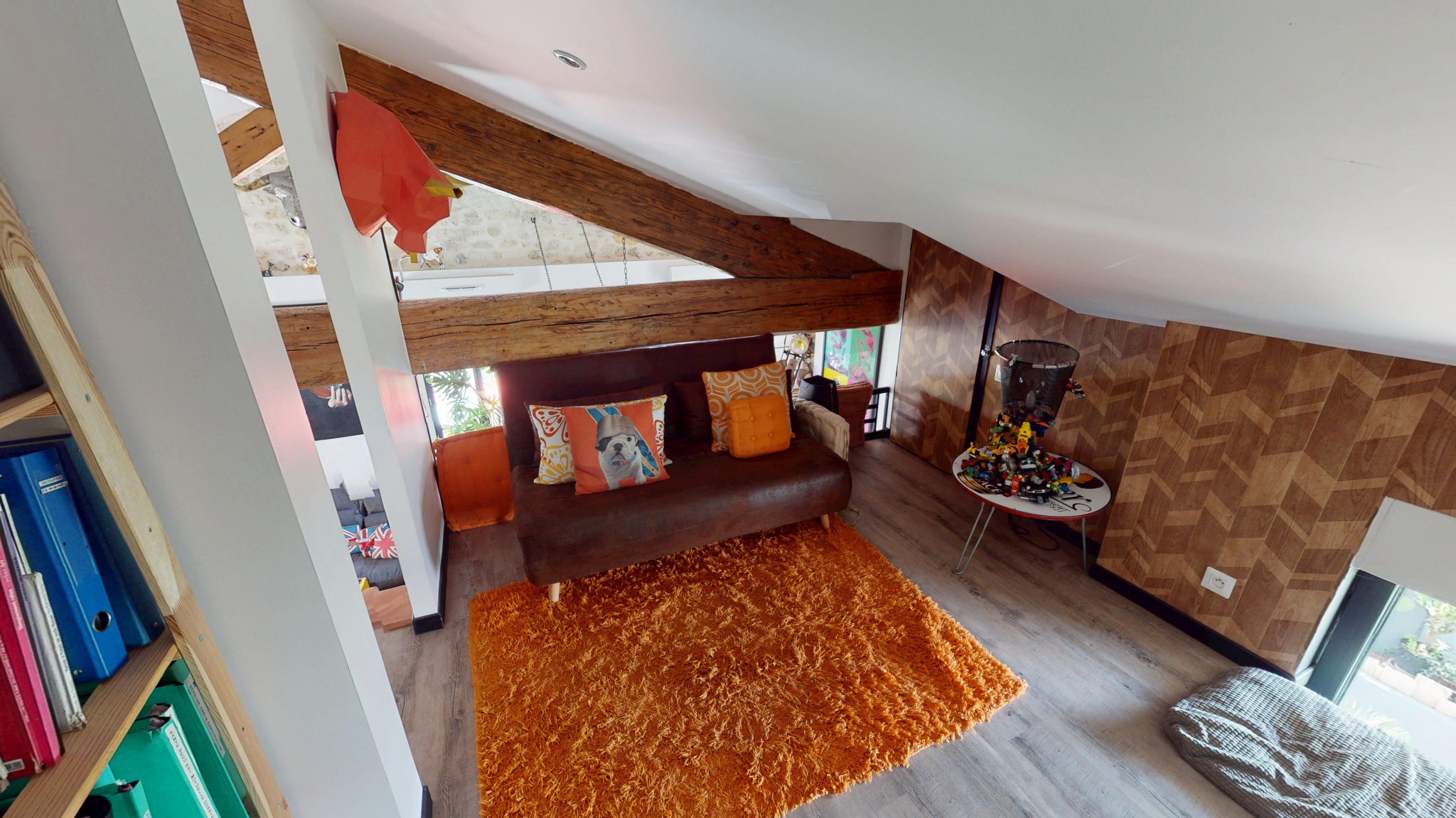Elle offre un superbe espace de vie de 43 m², baigné de lumière, avec toit cathédrale et poutres apparentes, apportant charme et caractère à l’ensemble.