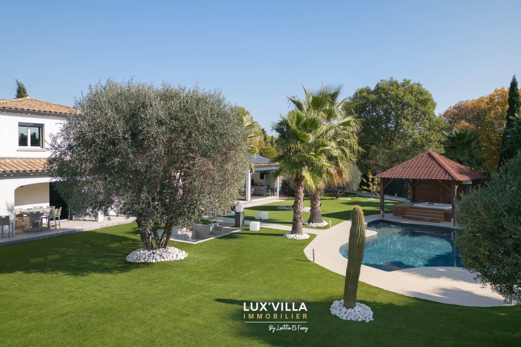 un grand jardin paysager, une piscine, un jacuzzi, et un terrain de pétanque pour profiter pleinement des beaux jours.