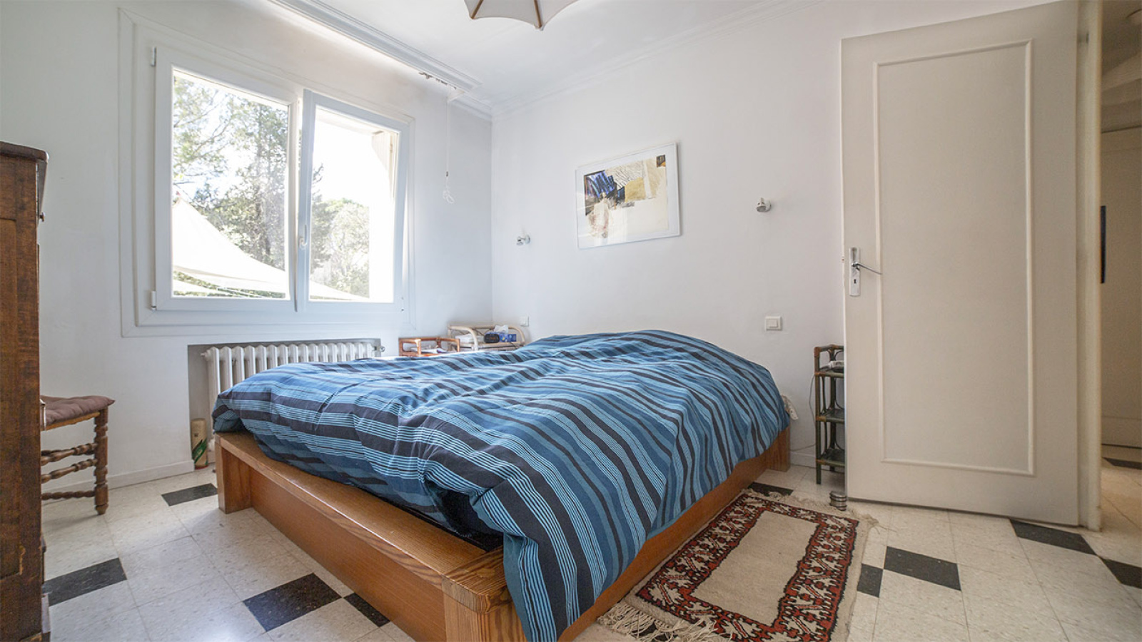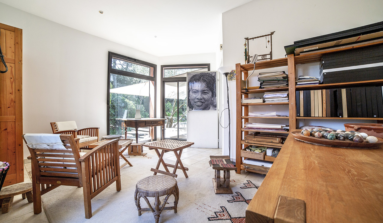 Le rez-de-jardin, essentiellement orienté au sud-ouest, est composé d’une vaste pièce de vie, d’une cuisine fermée, de trois chambres, d’une salle de bains et d’un grand bureau ouvert sur le jardin
