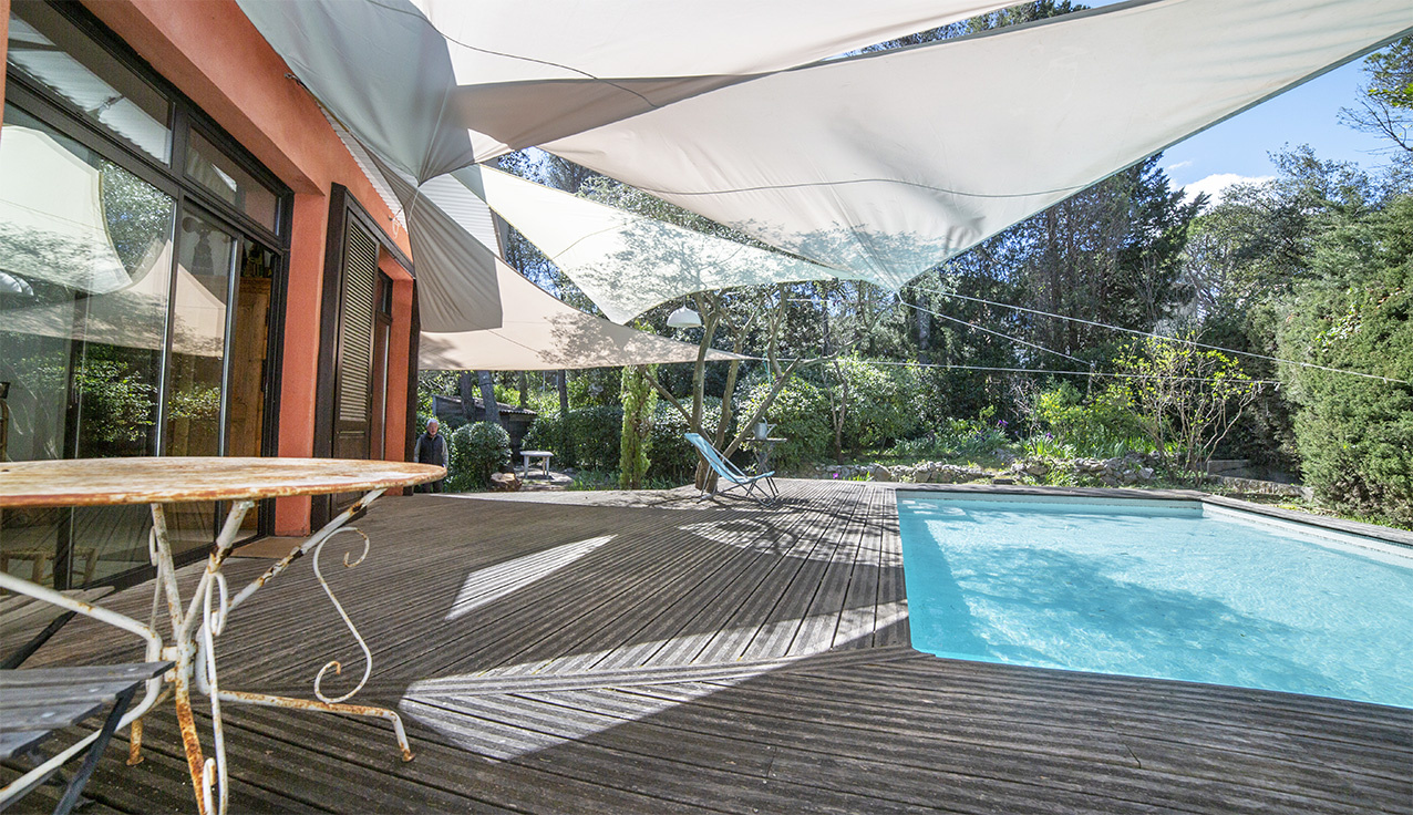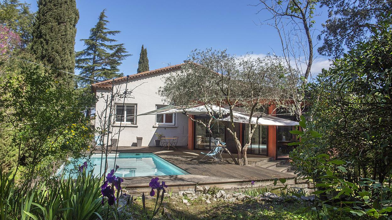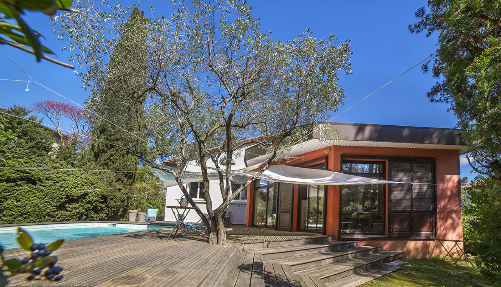 L’extérieur est sans aucun doute, l’atout maître de cette maison. Une piscine, sa grande plage en bois sans aucun vis-à -vis et de beaux arbres permettent d’en profiter en toute saison.
