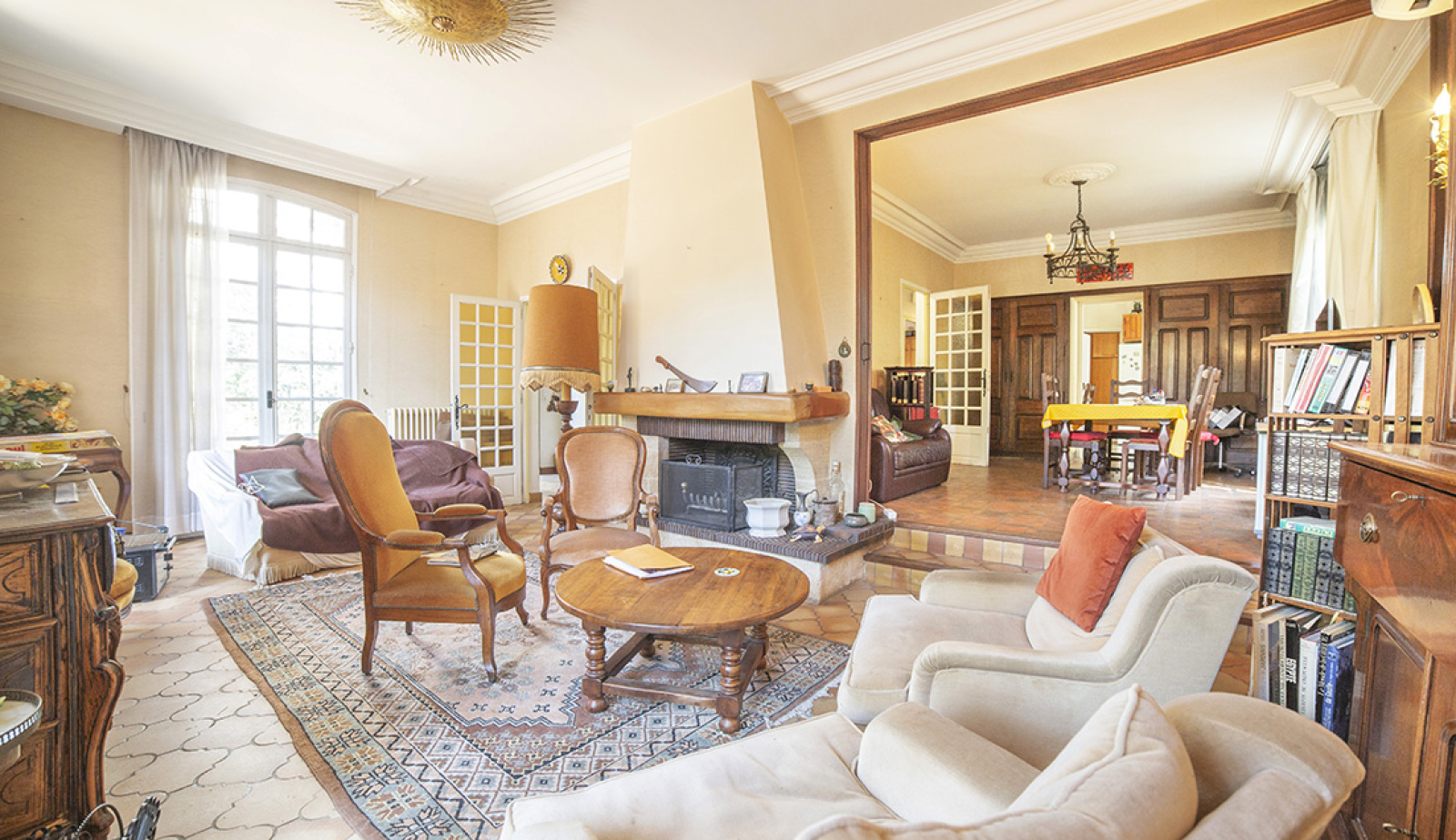 Le cœur de la maison s’articule autour d’un vaste espace de réception avec cheminée, véritable lieu de vie chaleureux et raffiné, idéal pour recevoir.